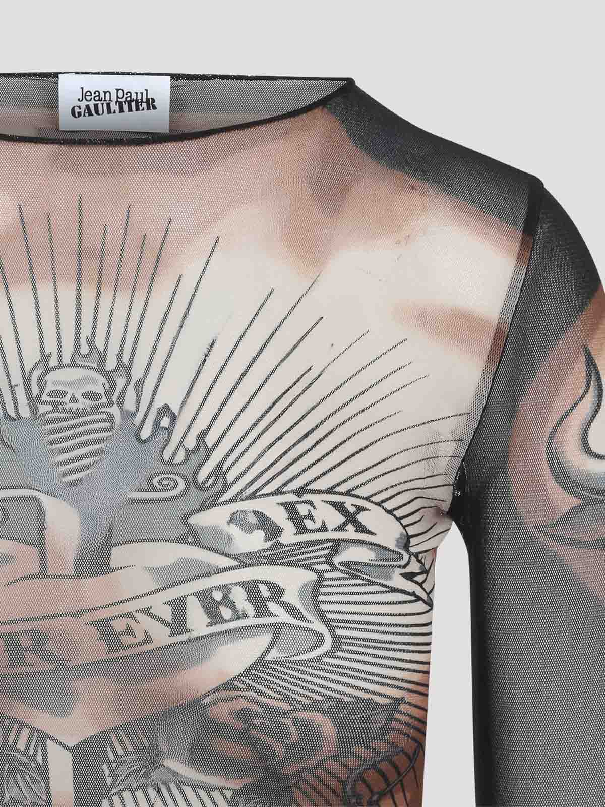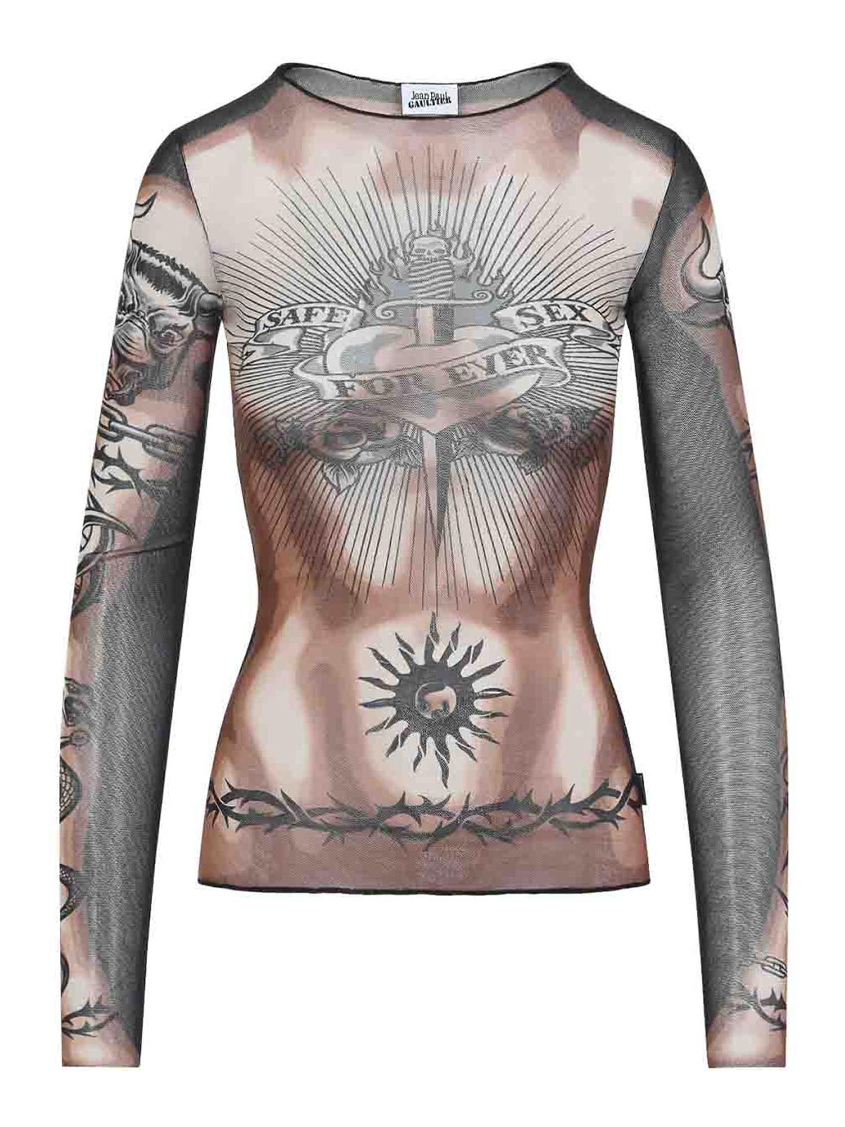 ジャンポールゴルチエセーフセックスタトゥーブラウンポリアミドトップ。ブラウンメッシュ製で、全体にシグネチャーグラフィックプリント、ラウンドネック、ロングスリーブ、フリルの付いたストレートヘムが特徴です。
