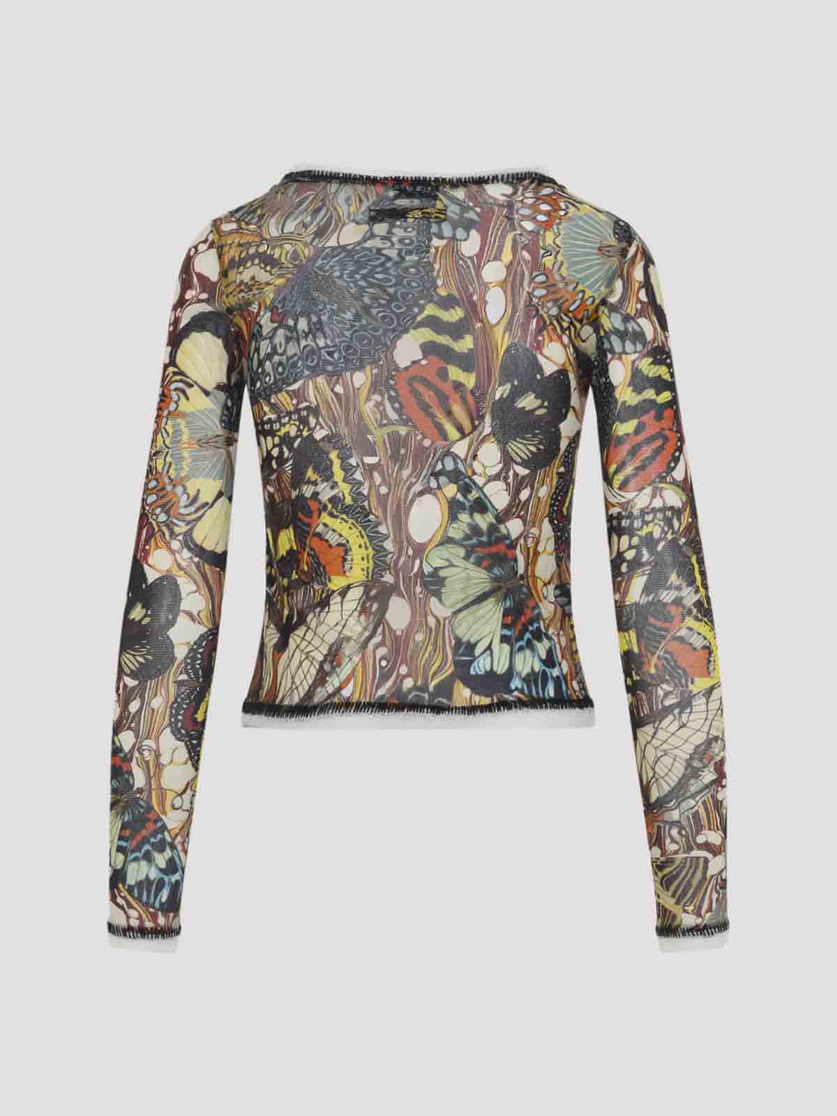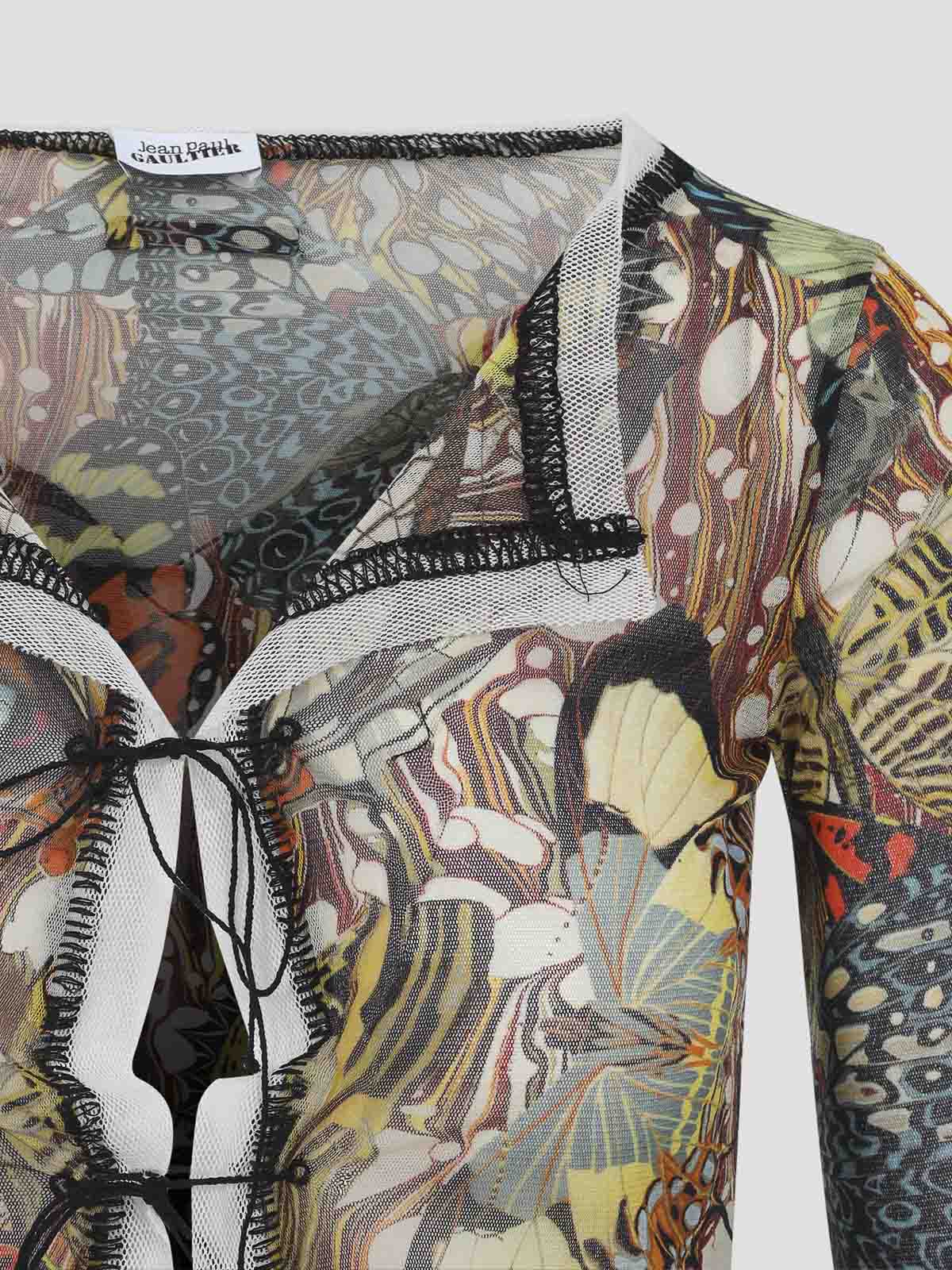 Jean paul Gaultier the Yellow Butterfly マルチカラーポリアミドカーディガン。マルチカラーメッシュ製で、シグネチャーのバタフライプリントが全面に施されています。ラウンドネックライン、オーバーロック仕上げ、フロントセルフタイ留め、ロングスリーブ、スリムフィットが特徴です。