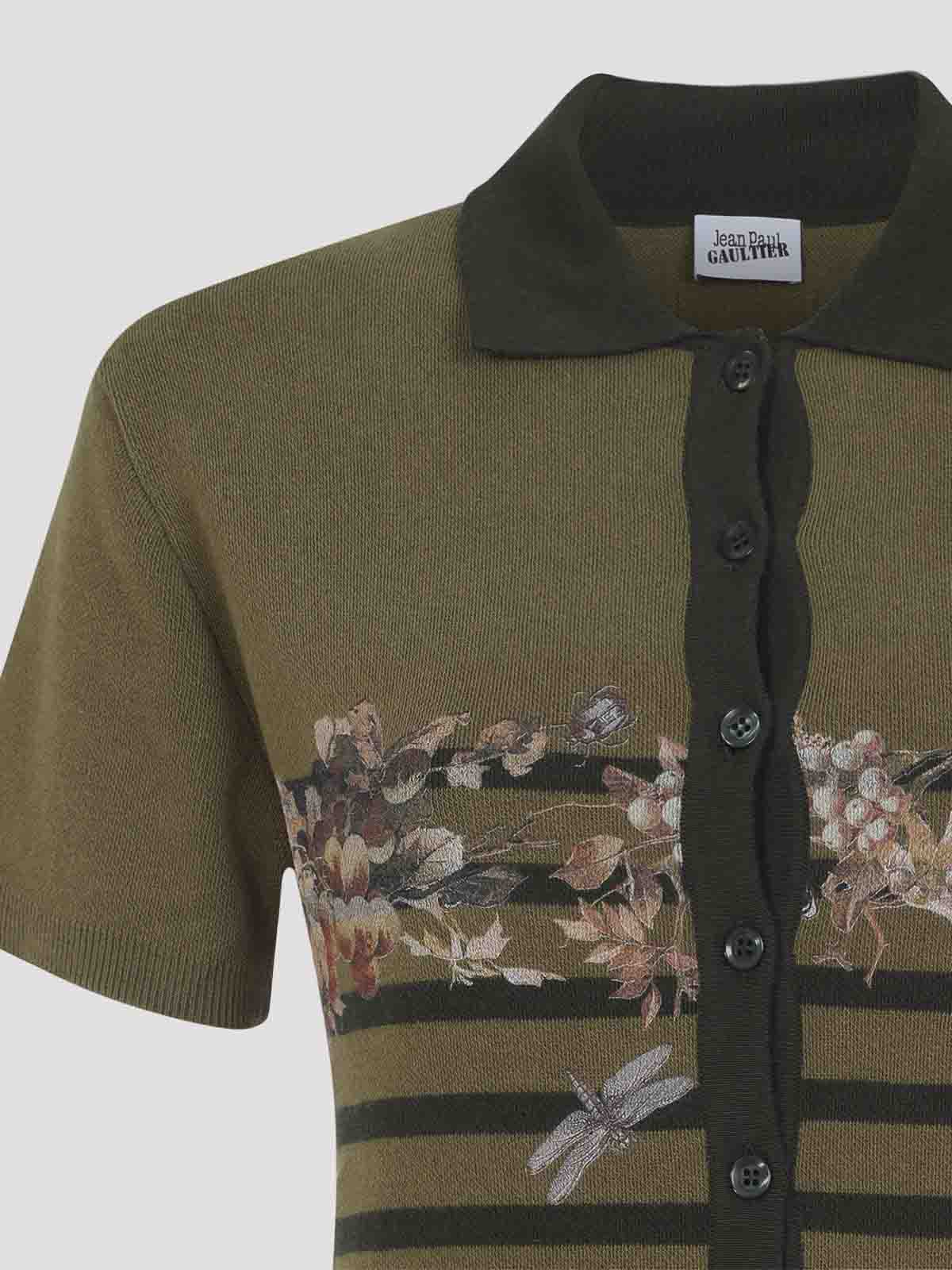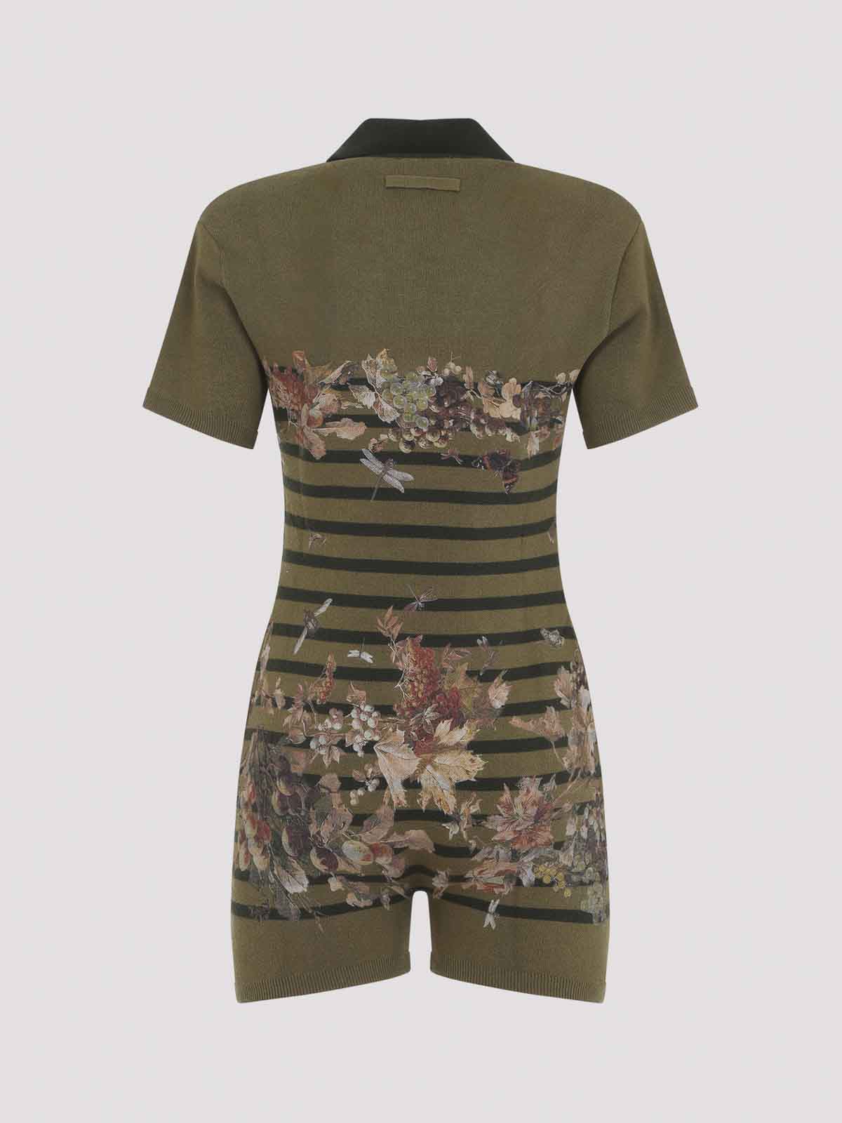 ジャンポールゴルチエマリニエールストライプグリーンコットンジャンプスーツ。カーキグリーンコットン製のニットジャンプスーツ。全体にシグネチャーグラフィックの象眼細工、ポロカラー、フロントボタン留め、半袖、ショートレッグ、リブ編みのエッジが特徴です。