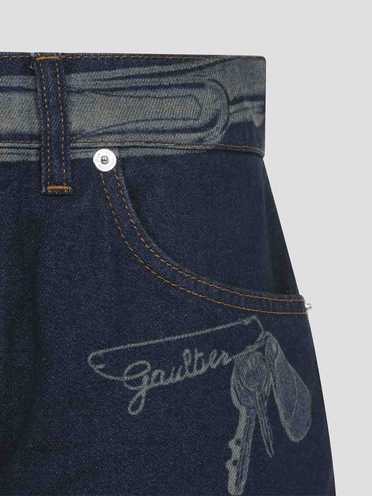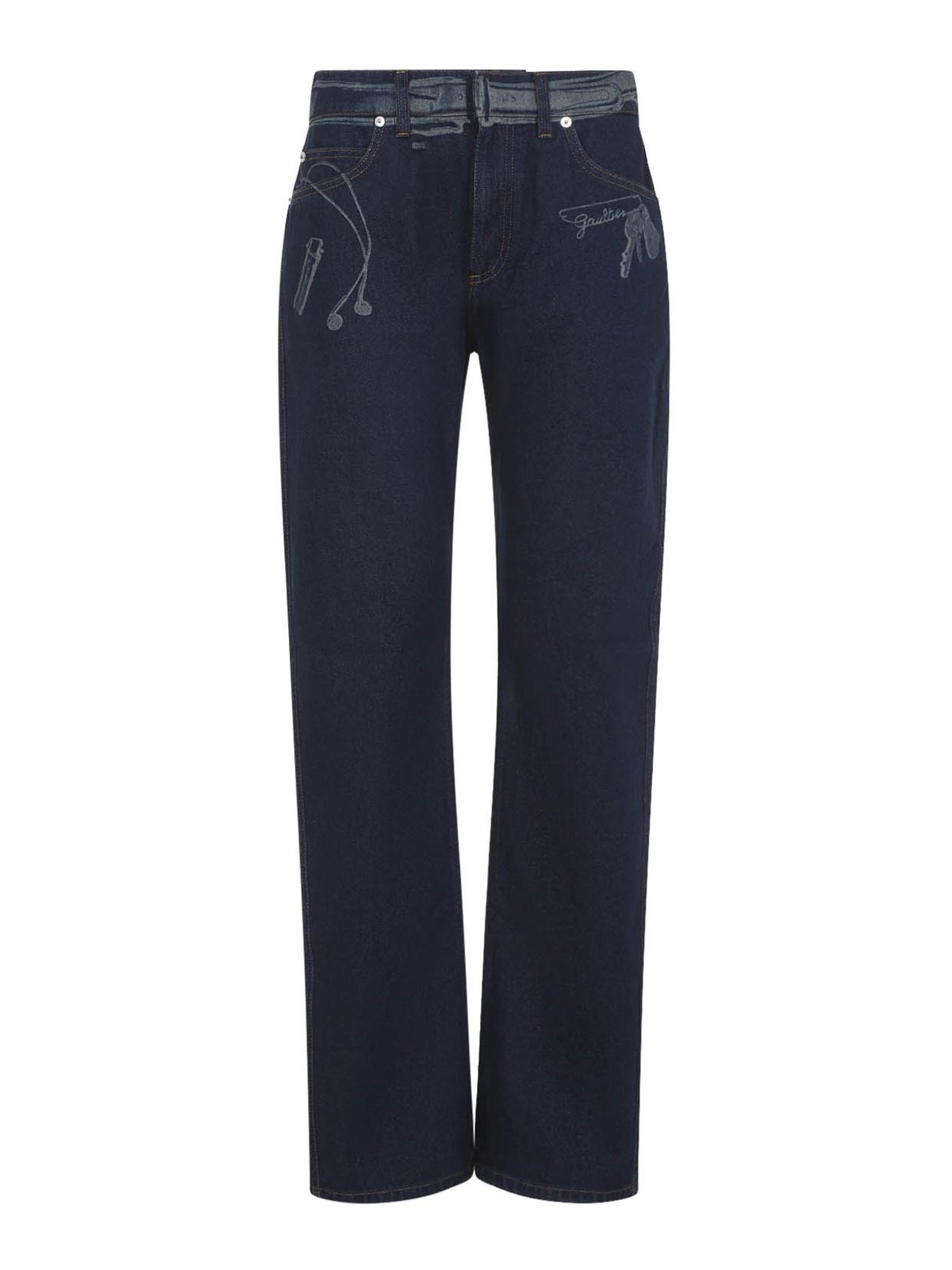 ジャンポールゴルチエブルーコットンジーンズ。ダークブルーのコットンデニム製の5ポケットデザインジーンズ。ローライズ、フロントコンシールファスナー、ベルトループ、色あせたグラフィックのディテール、ストレートレッグが特徴です。