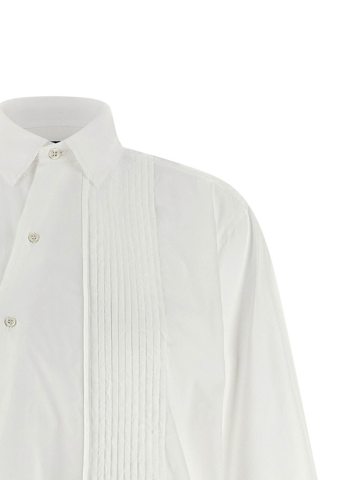 ややルーズフィットのメンズ「クレイジースモーキングプリス」シャツ、「スモーキング」カット、フロントプリーツ、フレイドプリーツ、フロントボタン、エッジにローカットのディテールが施されたポインテッドカラー、カフスとボタン付きのロングスリーブ。