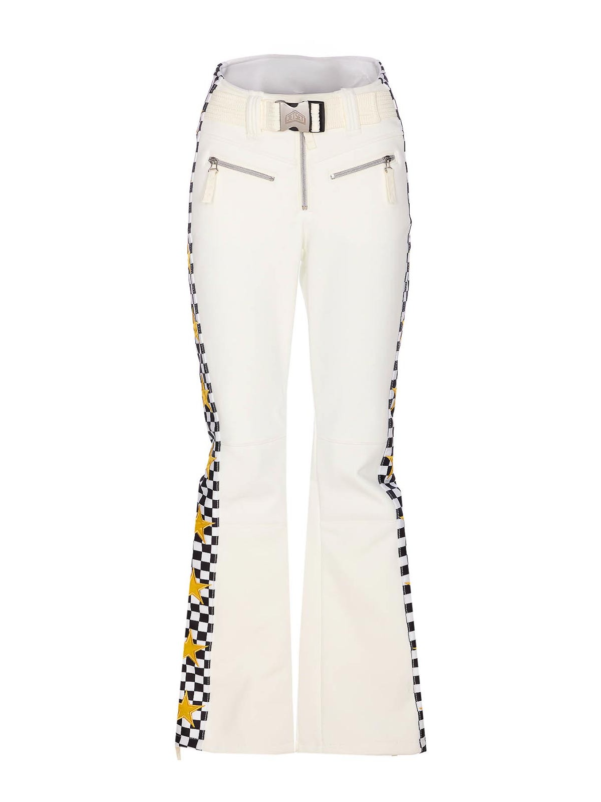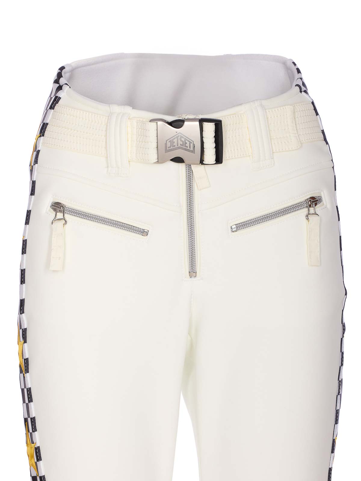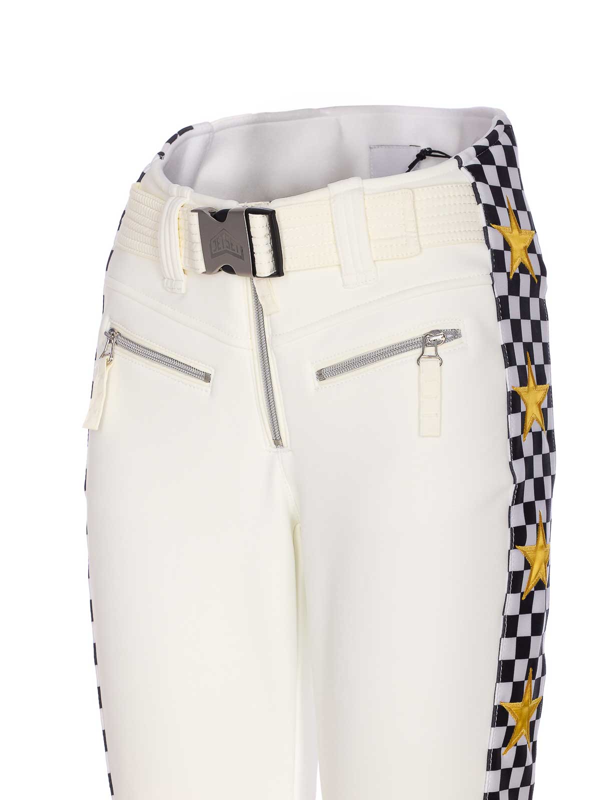 ジェットセットホワイトティビースキーパンツ、ハイウエスト、バックにパッチロゴ、ジッパー、ウエストにベルト、星が刺繍されたサイドバンド、ジッパーディテール