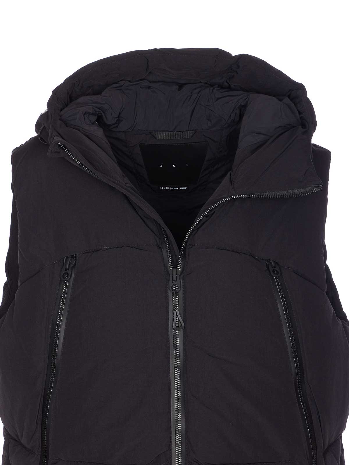 JG1 グリーンハイブリッドダウンジャケット、ファスナー&ボタン留め、ノースリーブ、マキシファスナーポケット、パッド入り、フードディテール