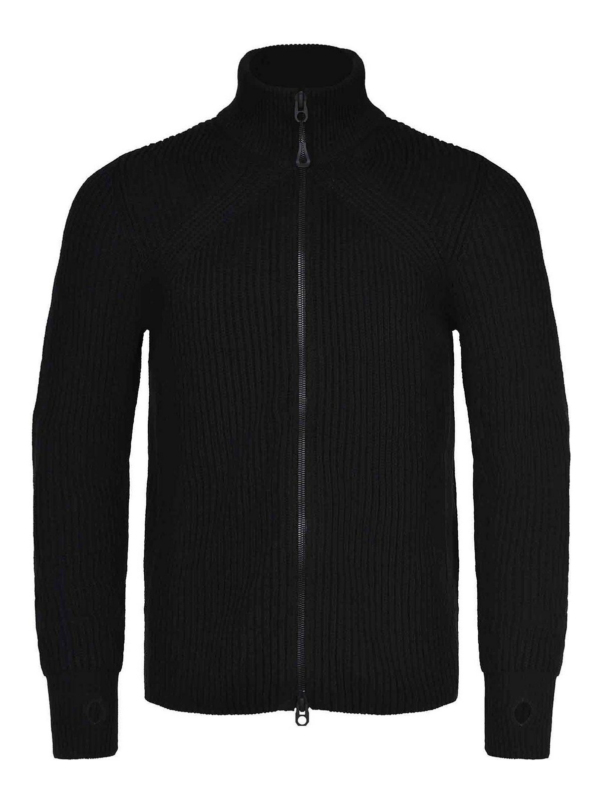 Maglia jg1 ブラックコットン製。リブ付き。ハイネック。ダブルスライダージッパー。長袖。親指穴。100% コットン