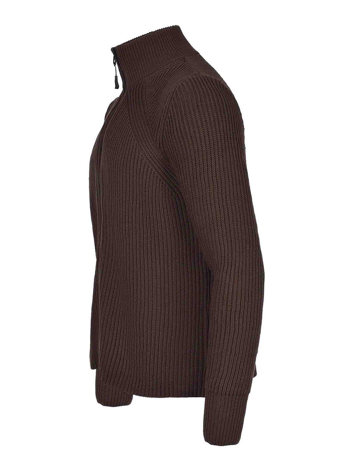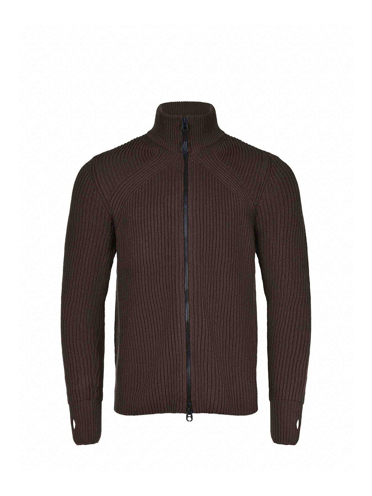 コーヒーカラーのコットン製Jg1セーター。リブ編み。ハイネック。ダブルスライダージッパー。親指穴付きの長袖。100% コットン