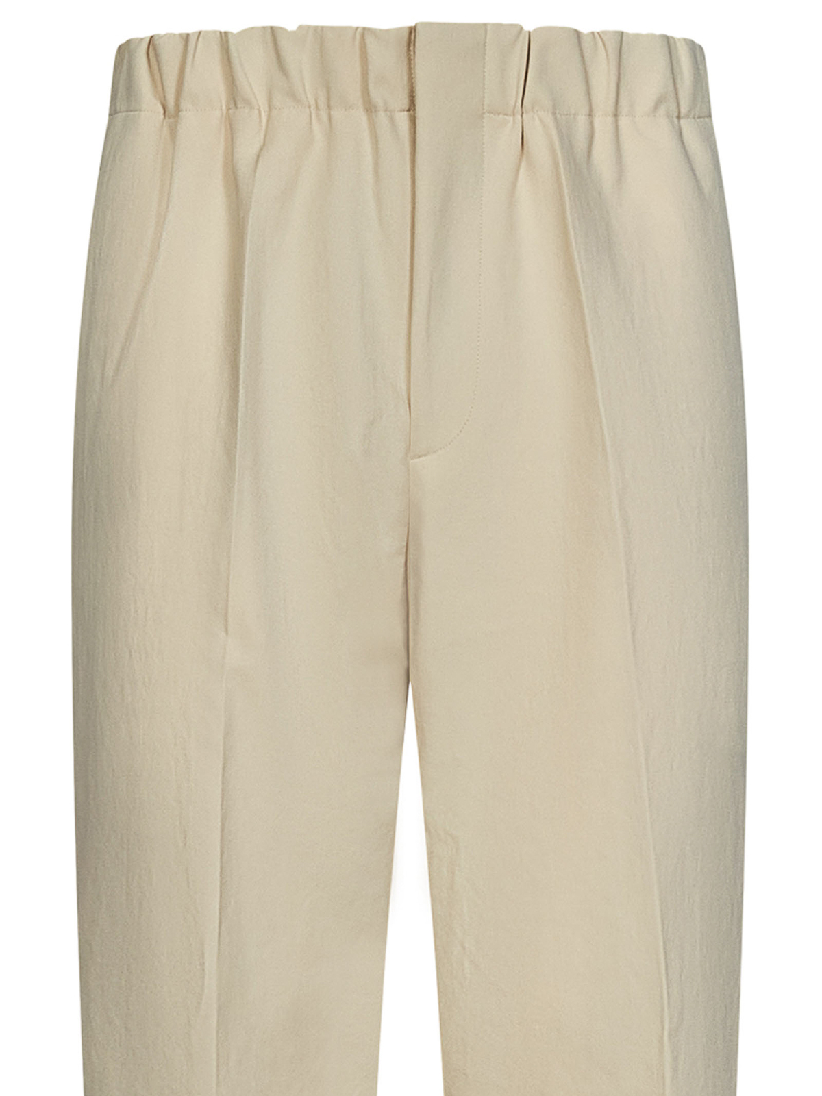 隠しフロントジッパーとボタン留め、伸縮性のあるウエストバンド、内側にドローストリング、ゆったりとしたクロッチ。後ろにフラップ付きのウェルトポケット2つ。中央にプレス加工、後ろに折り目が付いたテーパードヘム。リラックスフィットのベージュポリエステル。
