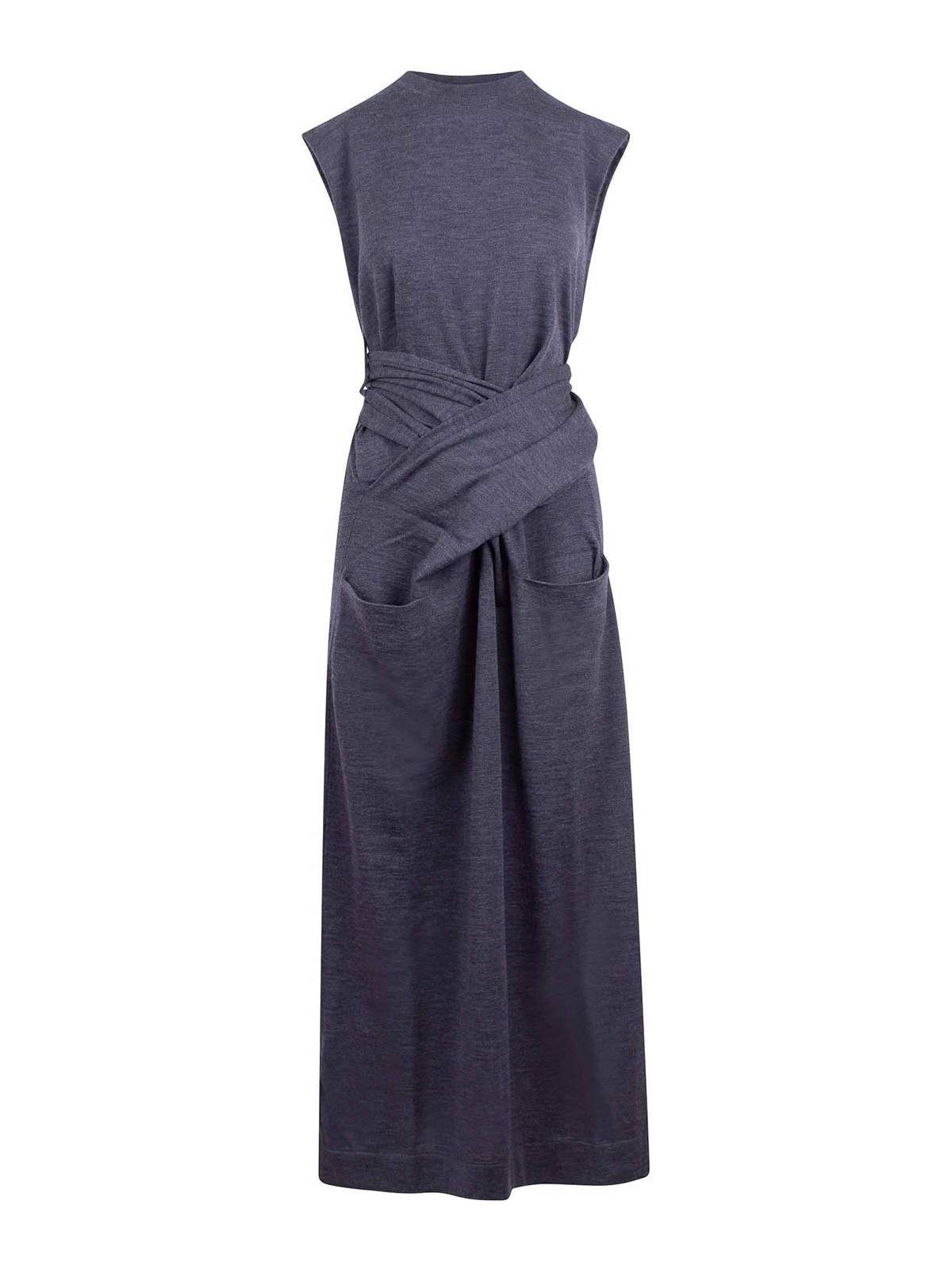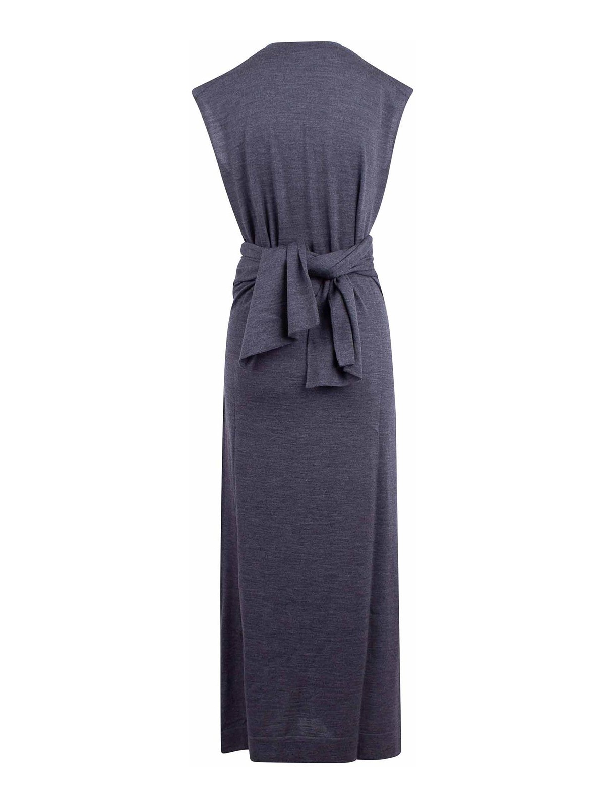 Jil Sanderによるクロスディテールのグレーのウールドレス。CHRIST、MIDIレングス、前面には実物そっくりのディテールが施され、背面には結び目があり、突き出たデザイン、縁はリブ編み。