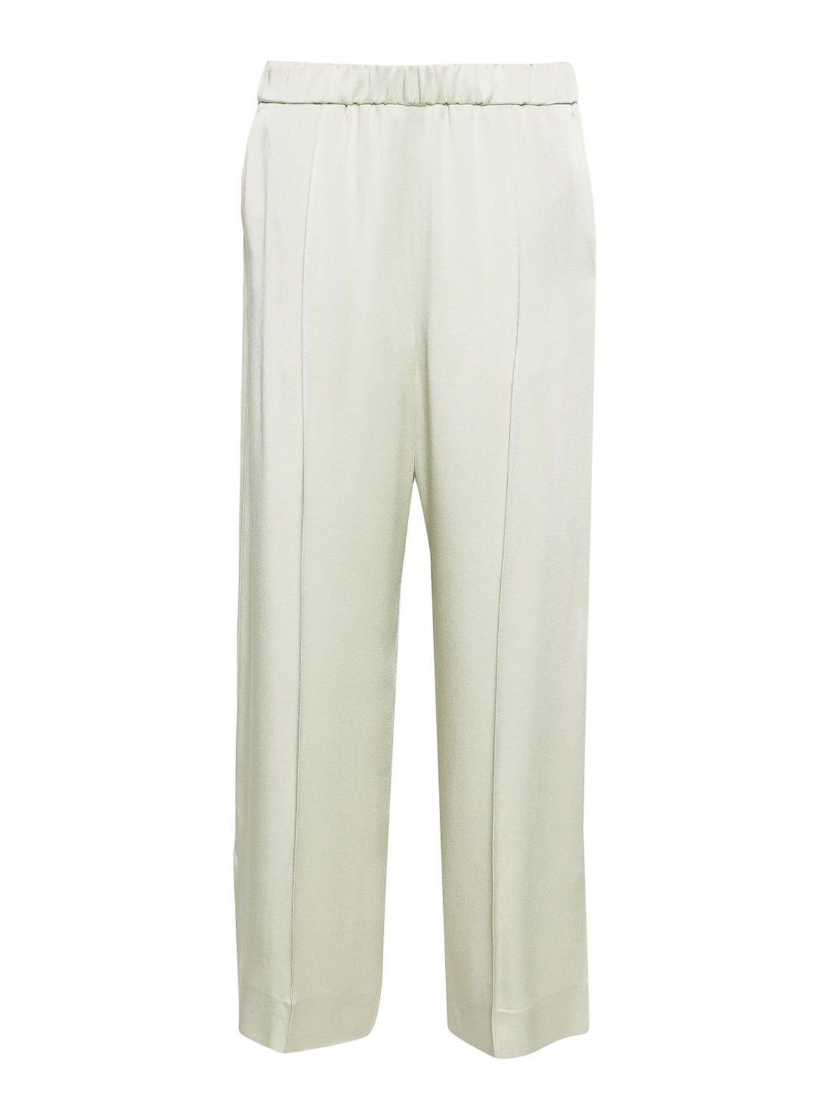パステルグリーン仕上げのワイドレッグプレスクリース背面ウェルトポケットゴム入りヘム