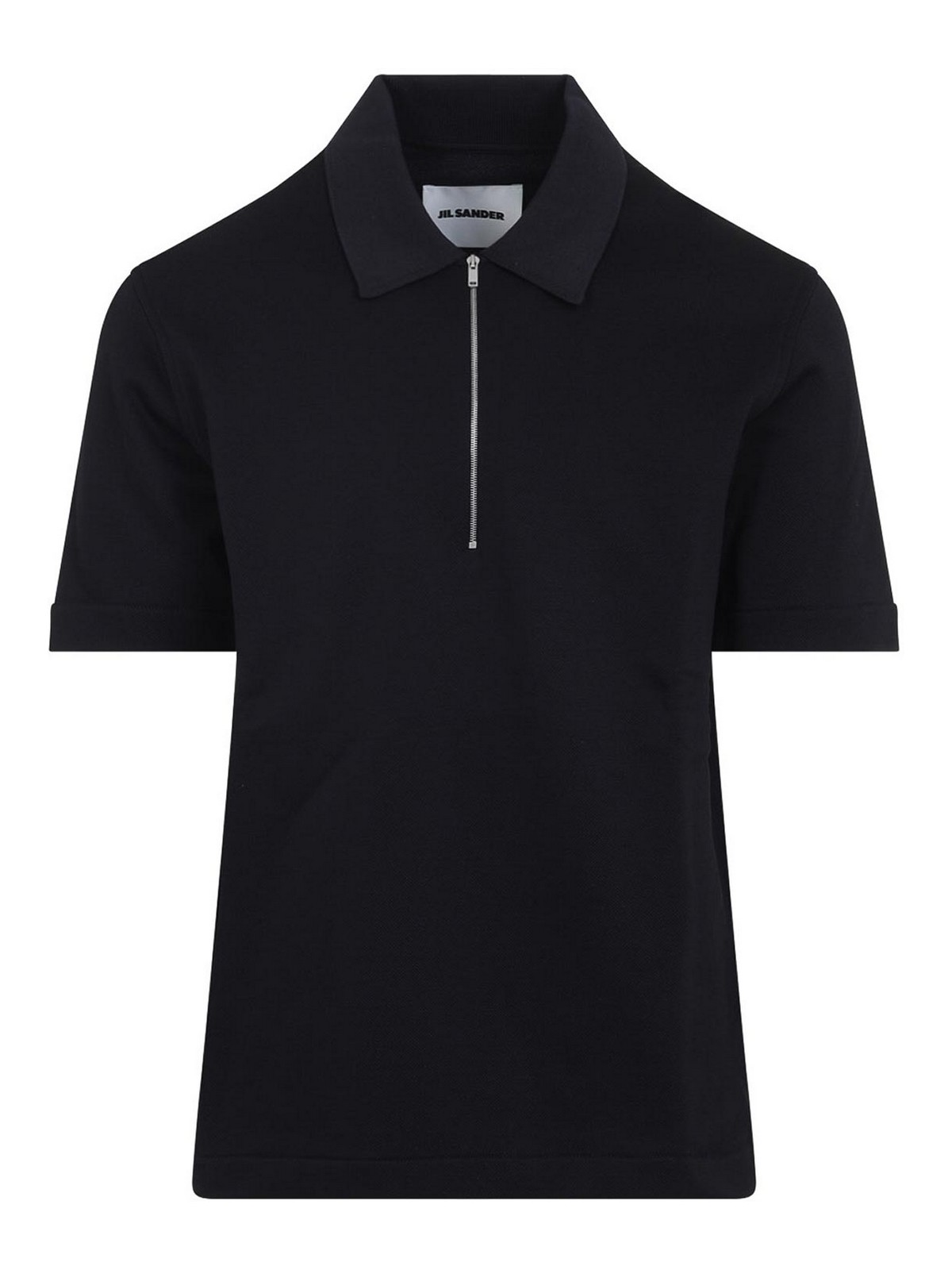 Jil Sanderのニットカラーブルーポリアミドポロシャツ。ダークブルーのコットンピケ製で、クラシックなポロカラー、フロントハーフジッパー、ショートスリーブ、ストレートヘムが特徴です。
