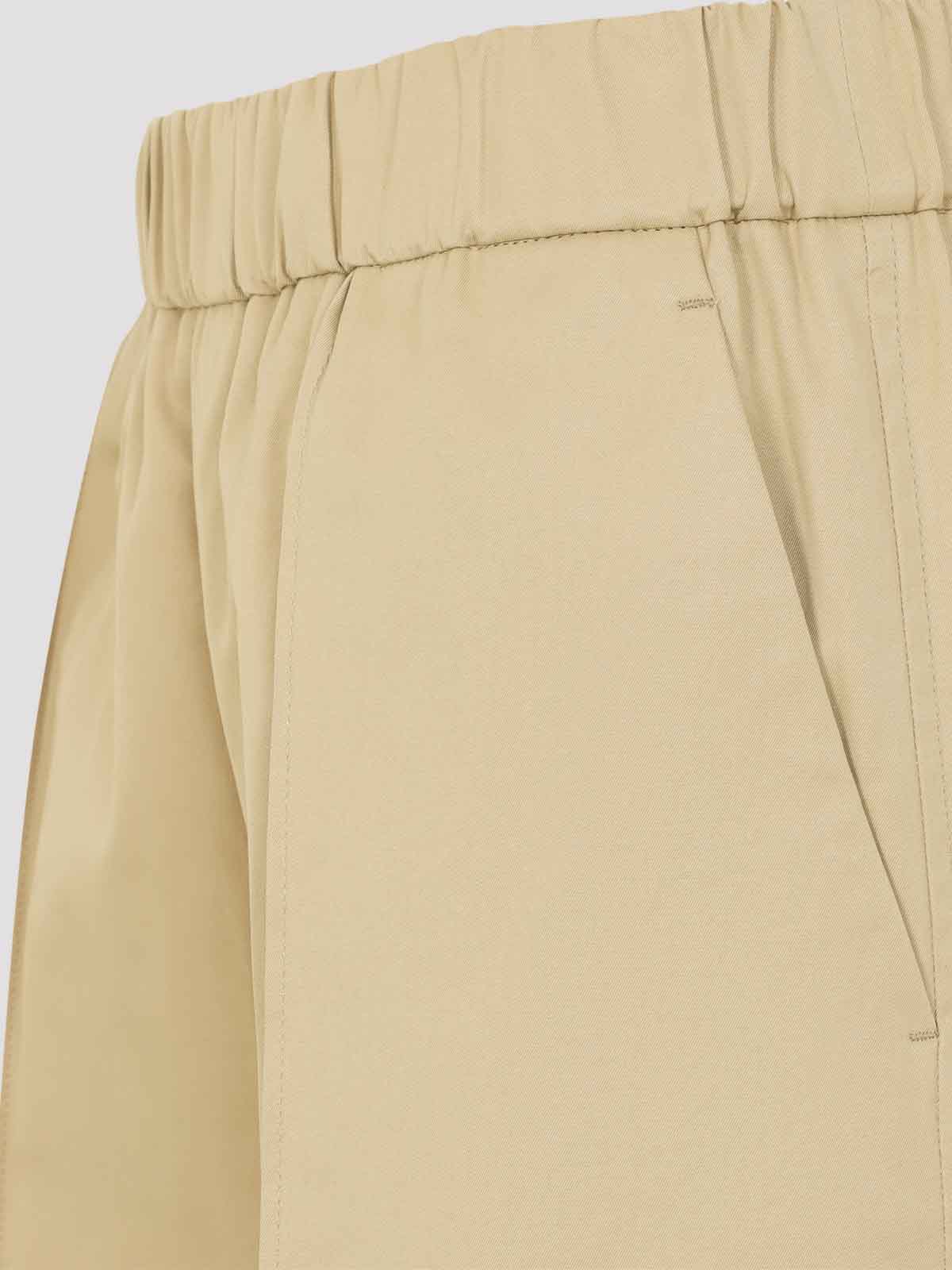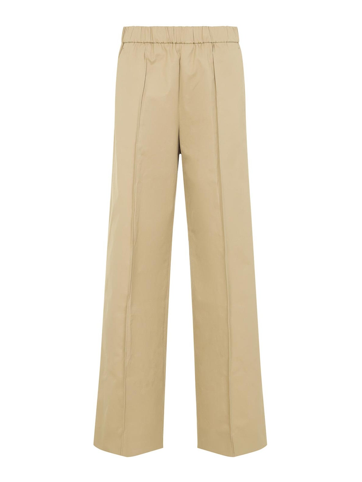 ジルサンダートラックにインスパイアされたリラックスしたダークベージュコットンパンツ。ダークベージュコットン製のリラックスパンツ。伸縮性のあるウエストバンド、2つのスラントポケット、背面にウェルトポケット1つ、中央に縫い付けられた折り目、幅広の脚が特徴です。