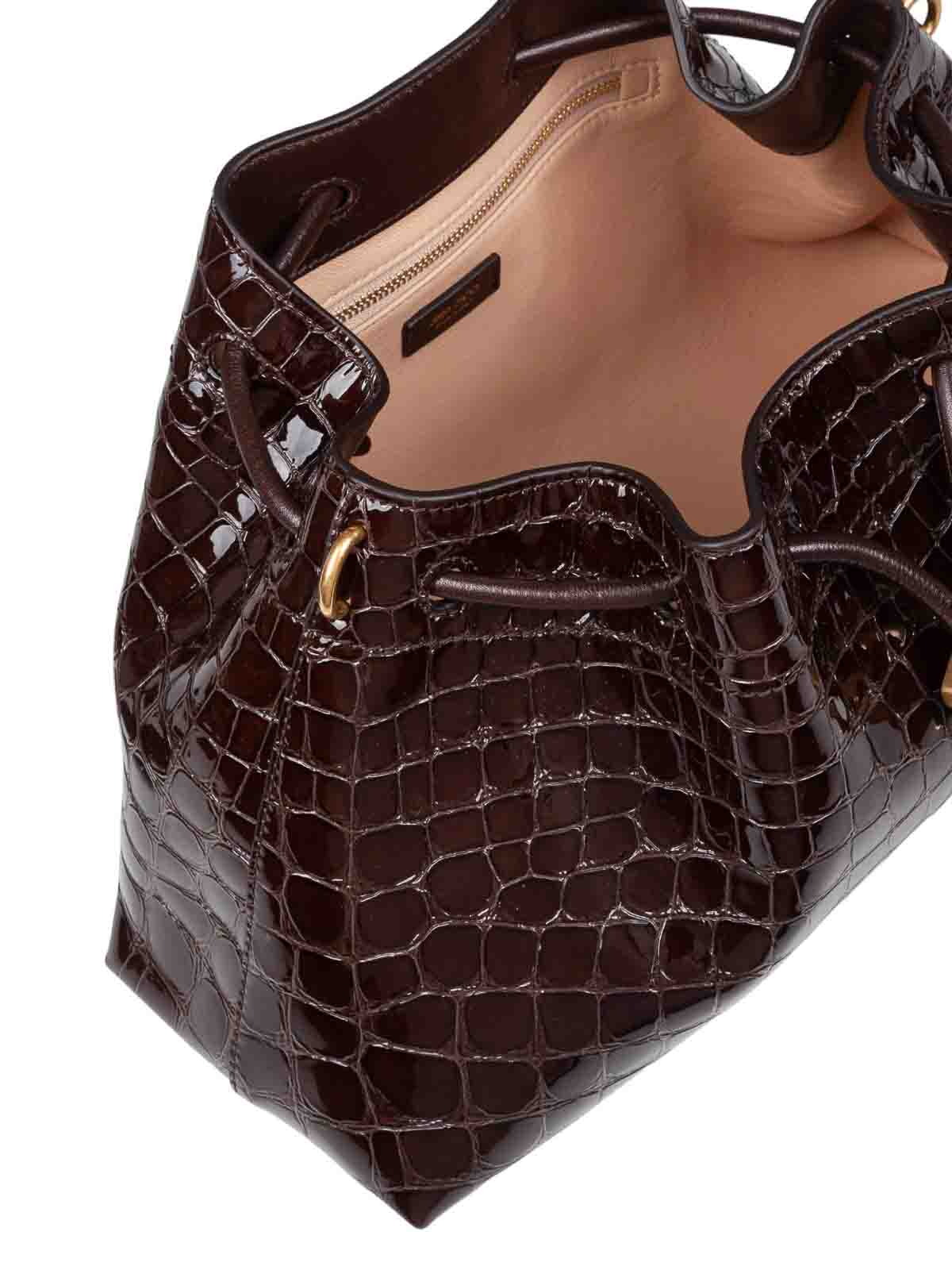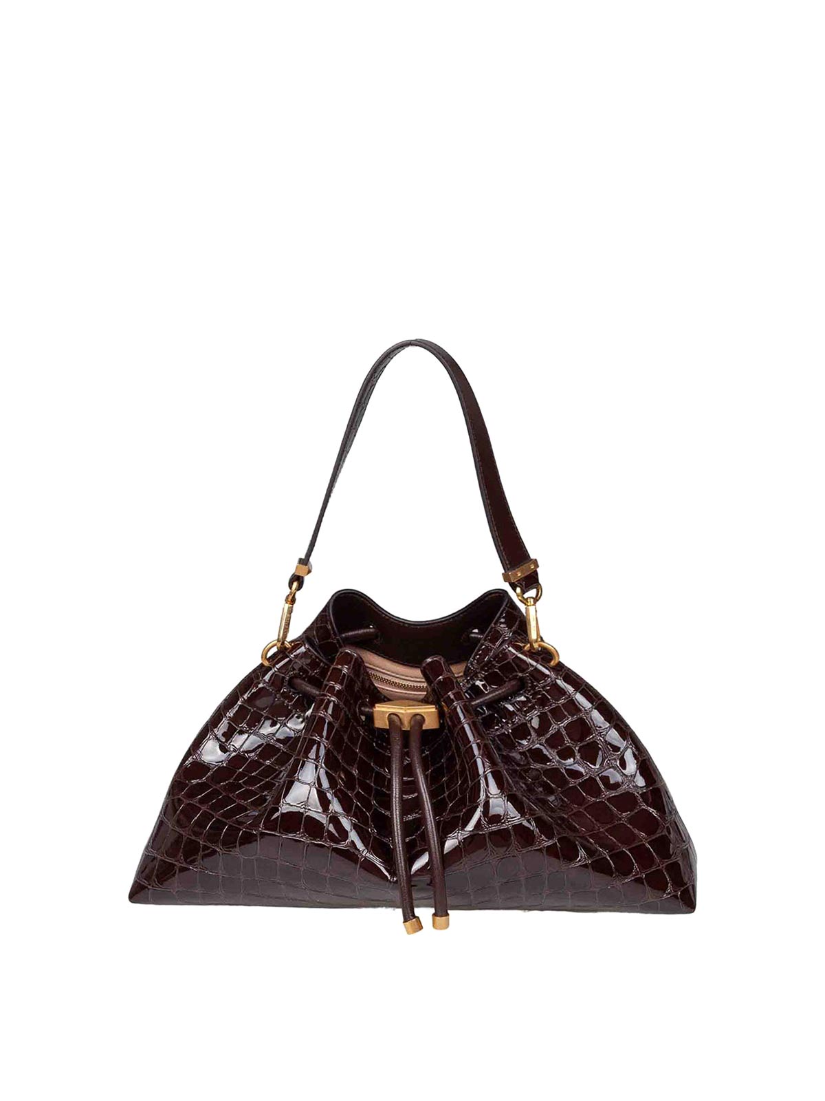 クロコダイルエフェクトエンボス加工シンチ M ハンドバッグ、取り外し可能なゴールドカラーのメタル製ドローストリングショルダーストラップ付き