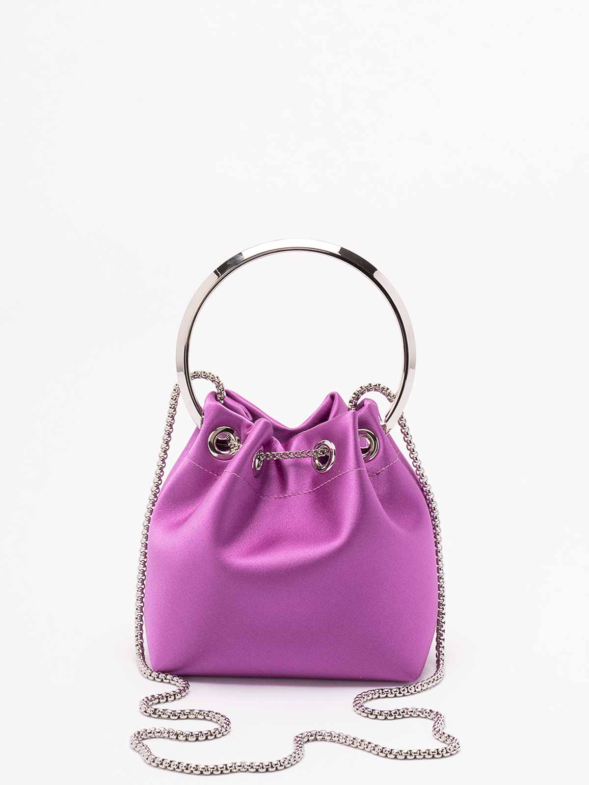 柔らかい構造のハンドバッグ、金属製のディテールが施されたハンドル、ドローストリングクロージャー。
