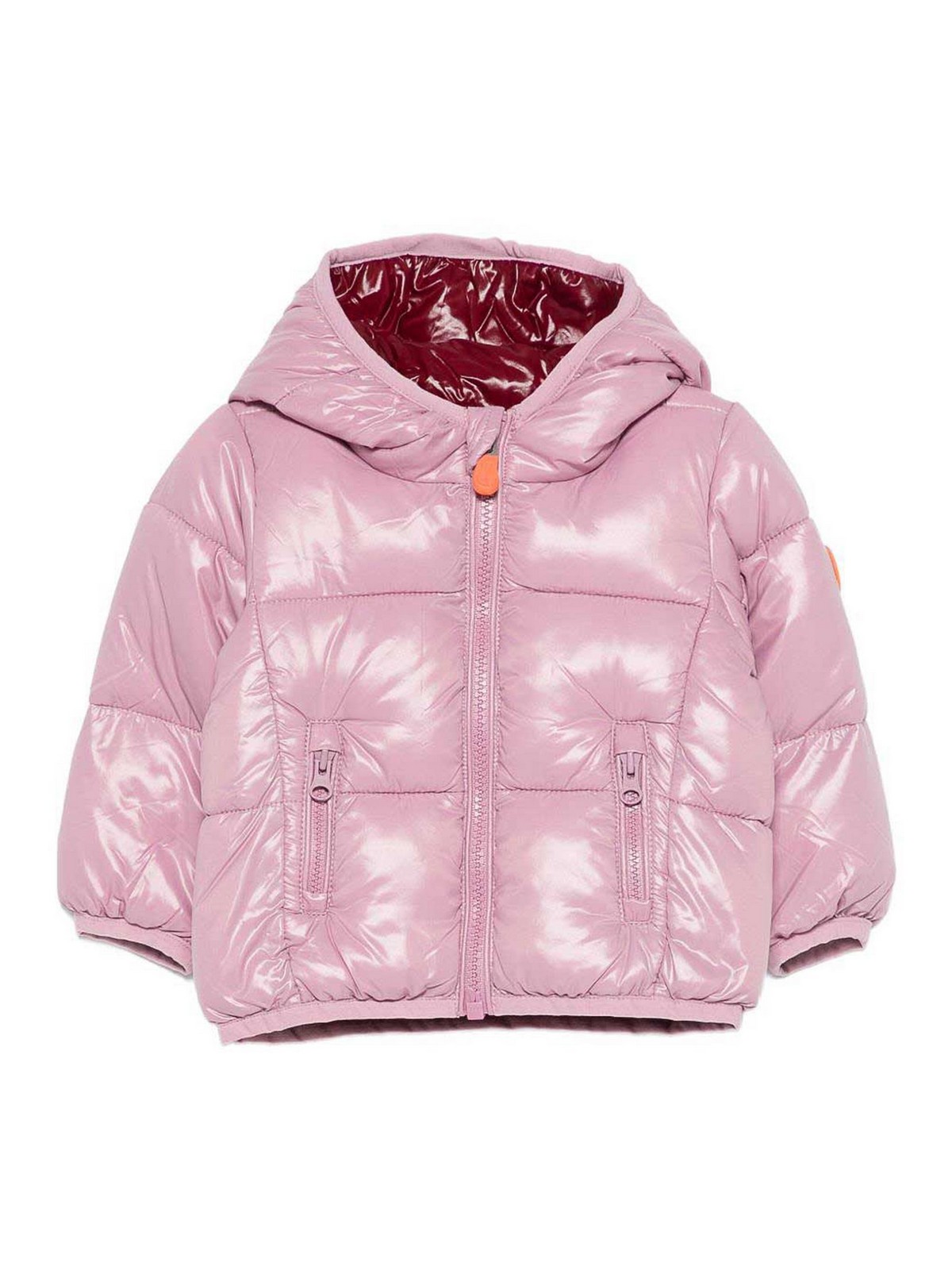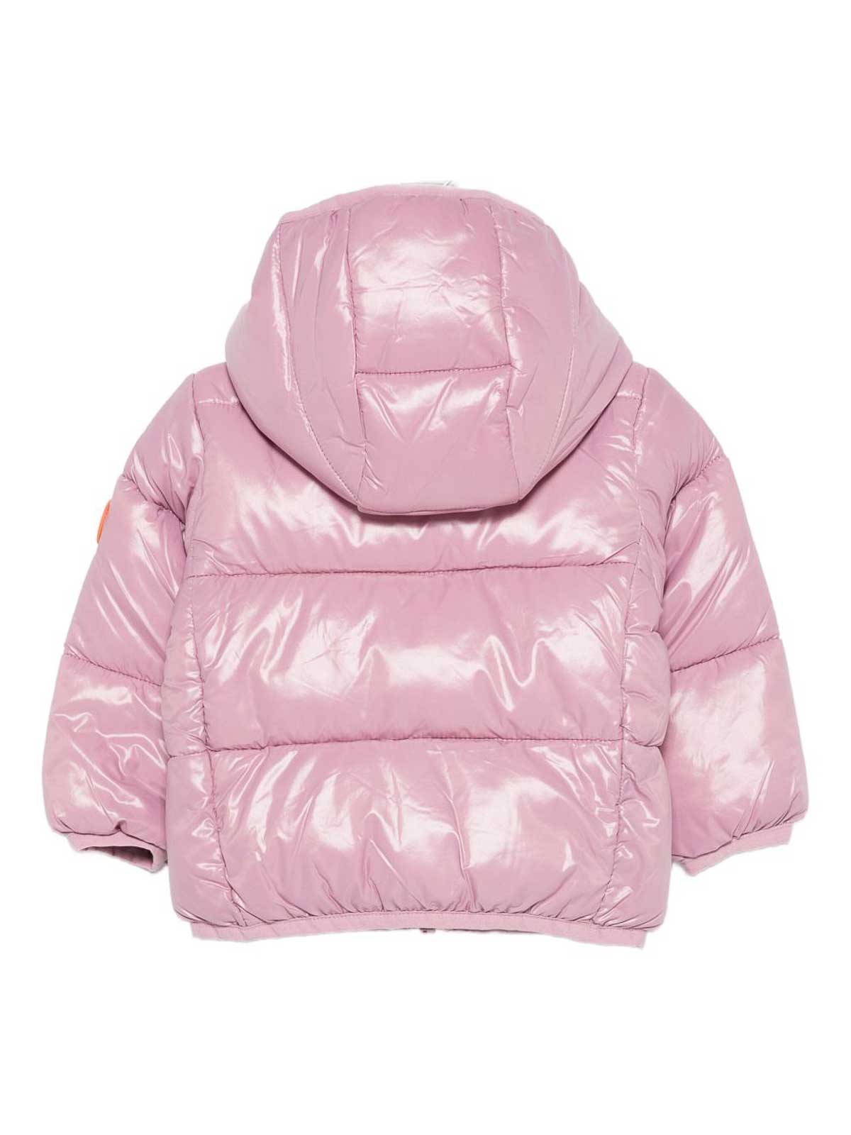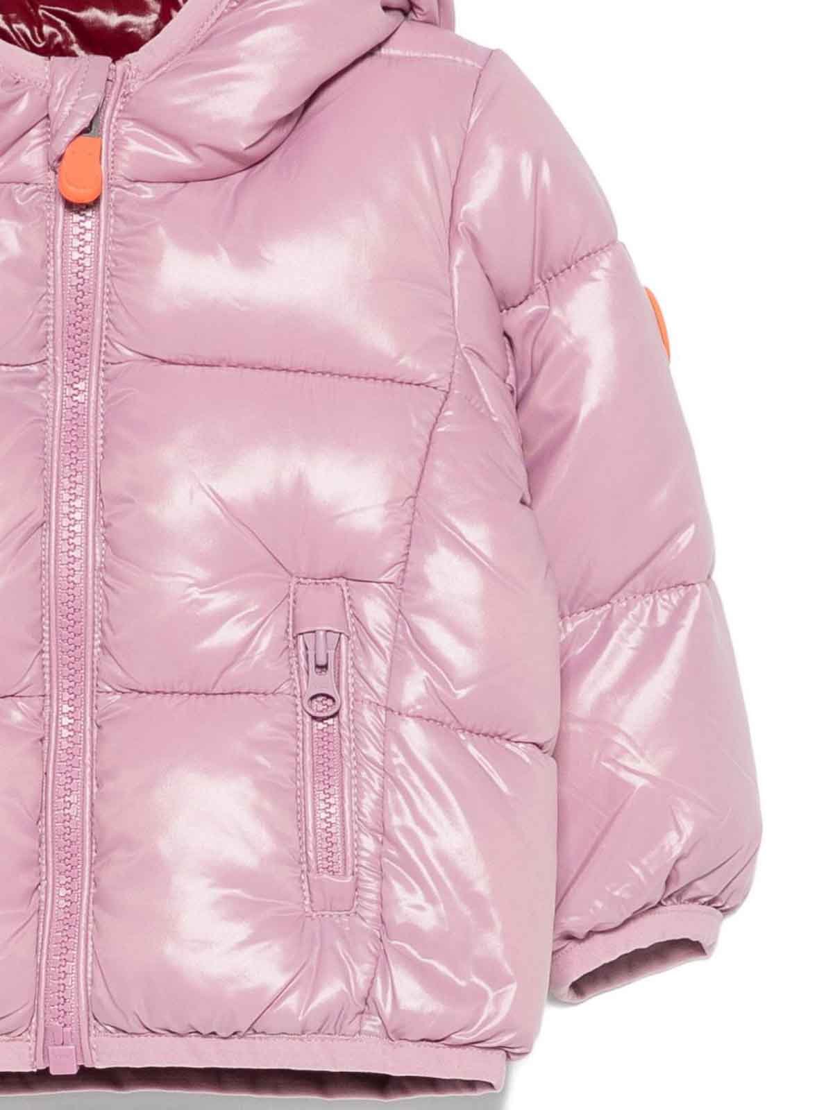 Save the Duck's 'jody'の生まれたばかりの女の子用ピンクショートジャケットは、フード、ファスナー付きポケット、キルトデザイン、伸縮性のある裾が特徴です。フリー素材で、お子様に暖かさ、快適さ、持続可能なスタイルを保証します