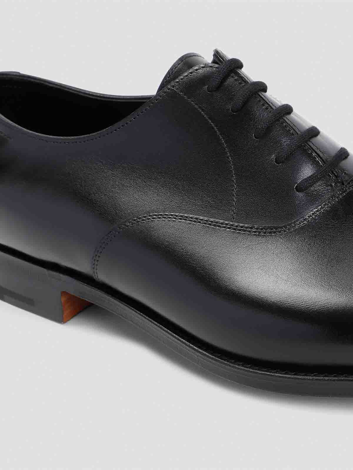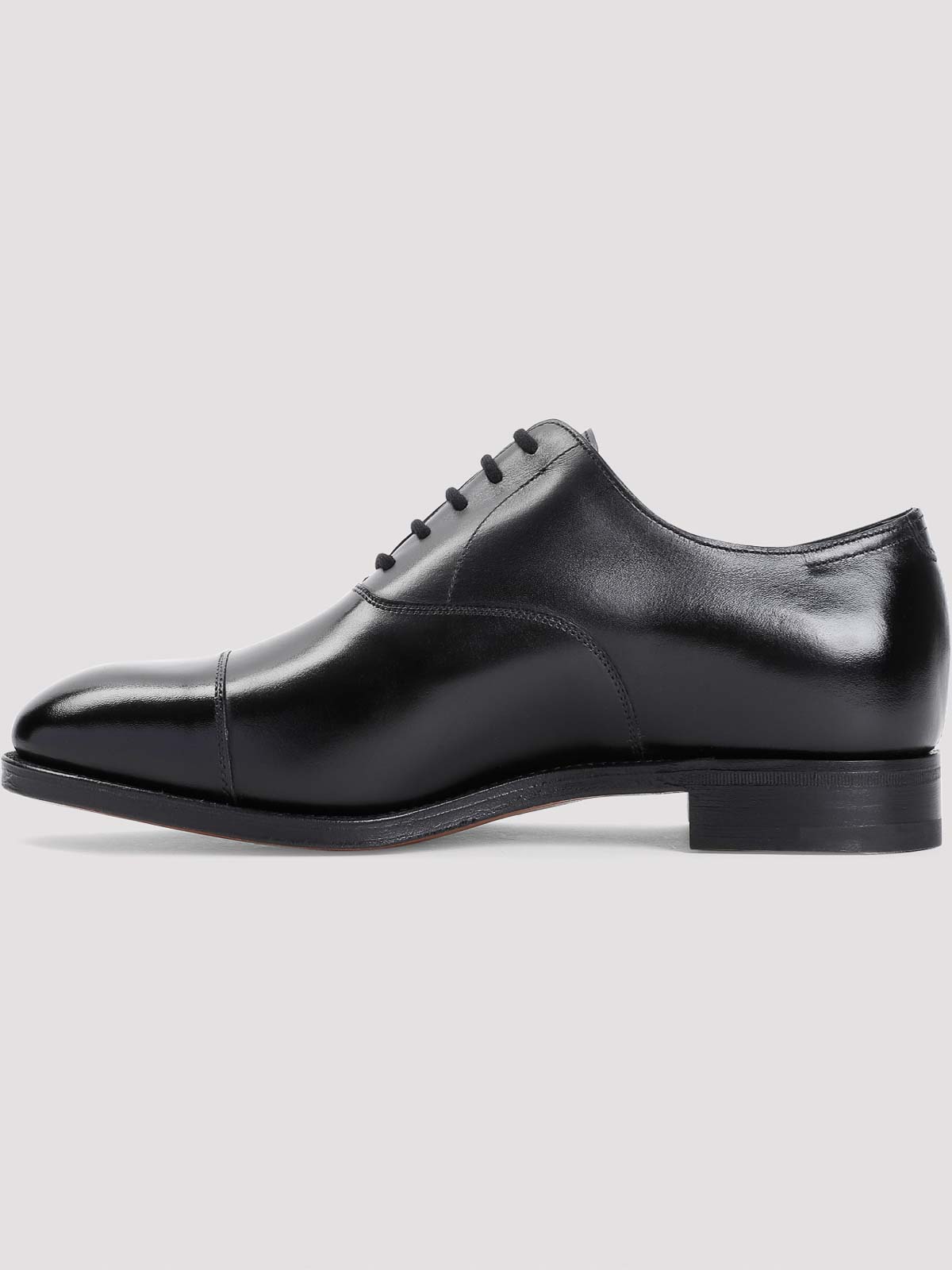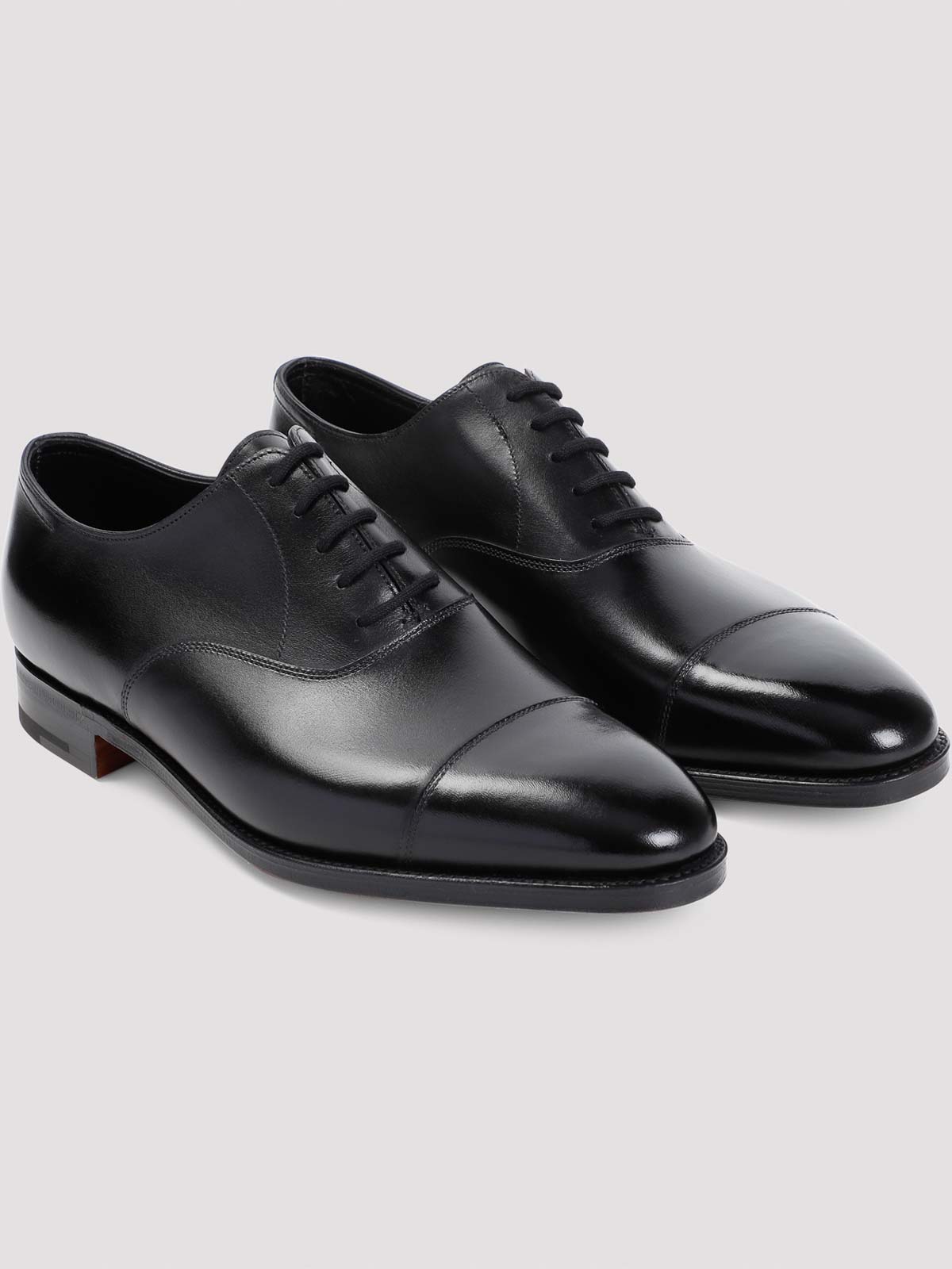 John lobb City II ブラックカーフレザーオックスフォード。ブラックカーフレザー製、アーモンドトウ、レースアップファスナー、全体に同系色のシグネチャーツインステッチのディテール、レザーの裏地、ブランドレザーのインソールとアウトソール。