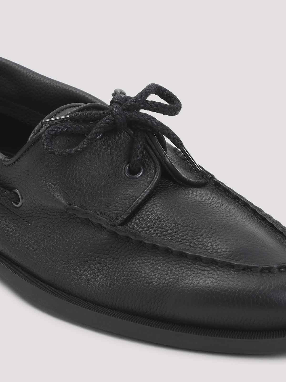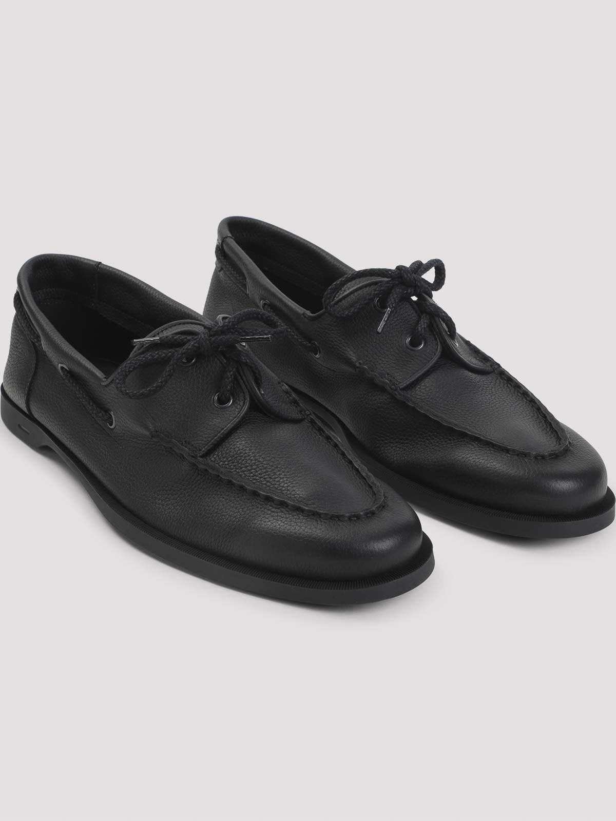 John lobb ブラックグレインレザーホイルローファー。ピュアブラックグレインレザーローファー、ラウンドトウ、トップエンボスステッチ、トップレースアップファスナー、サイドトーナルストラップ、トーナルレザーソール。