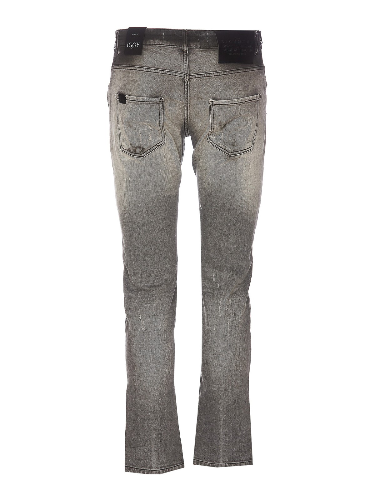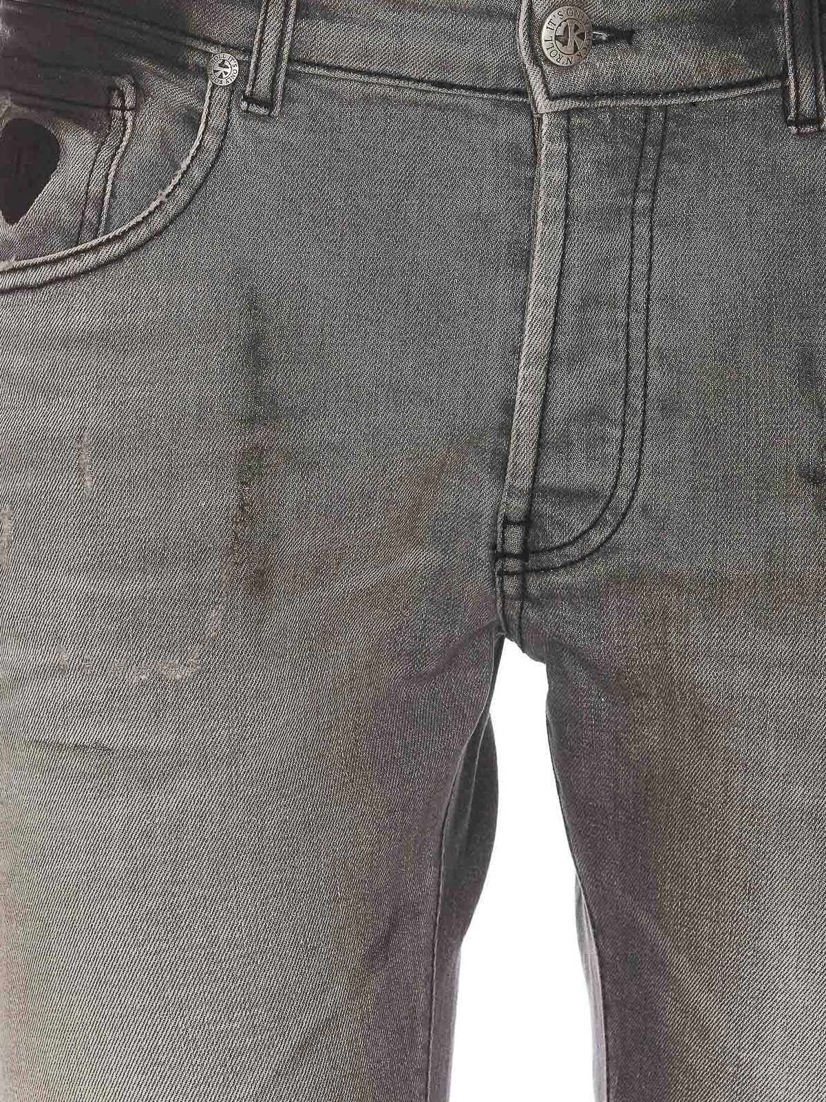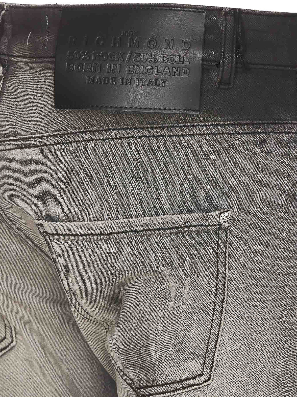 John Richmond グレーデニムジーンズ、フロントボタンとジップクロージャー、ポケット、背面にパッチロゴ、スキニーモデル