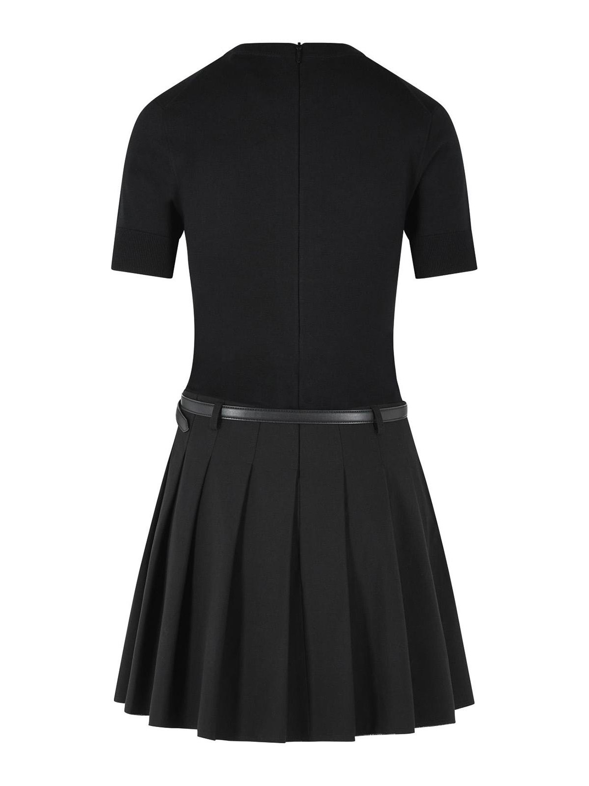 リブ編みのクルーネック、隠しファスナー付きのバッククロージャー、リブ編みの袖口、ベルトループ、バックルベルト、プリーツスカート