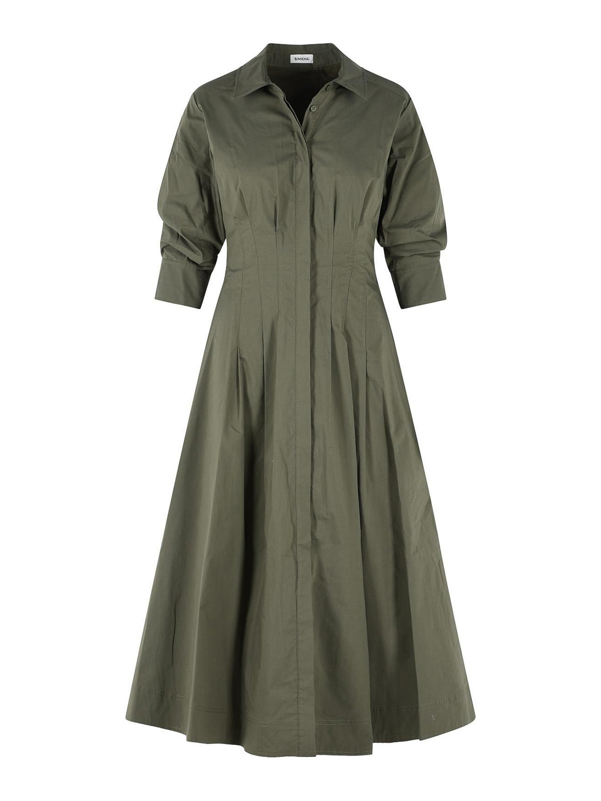 シャツカラー、隠しフロントボタン留め、ストラクチャーステッチ、七分ボタンスリーブ、サイドスリットポケット、ストレートヘム