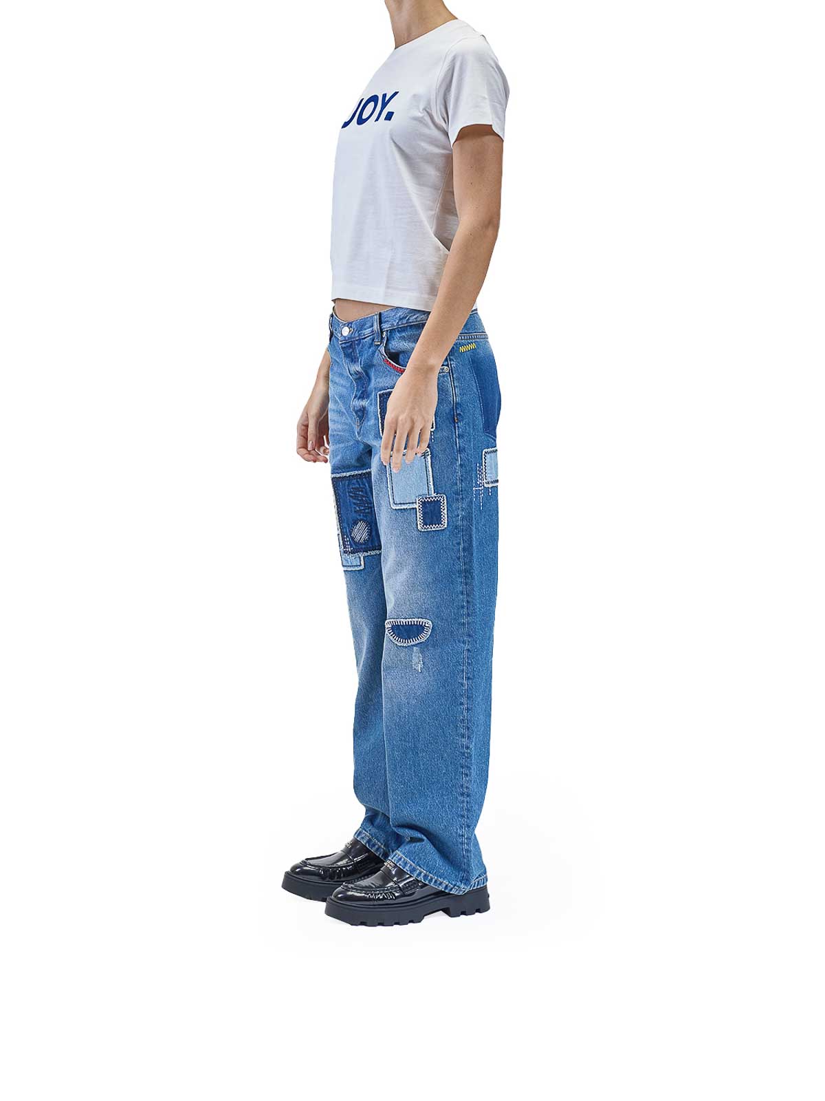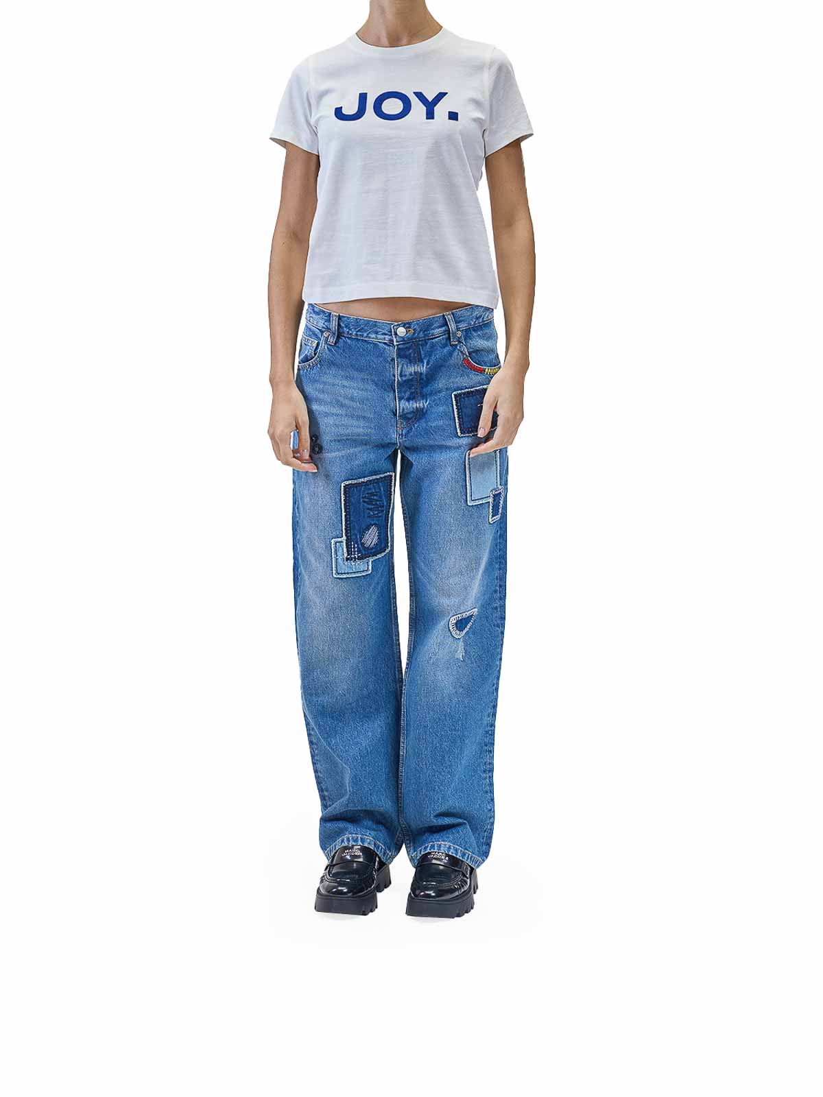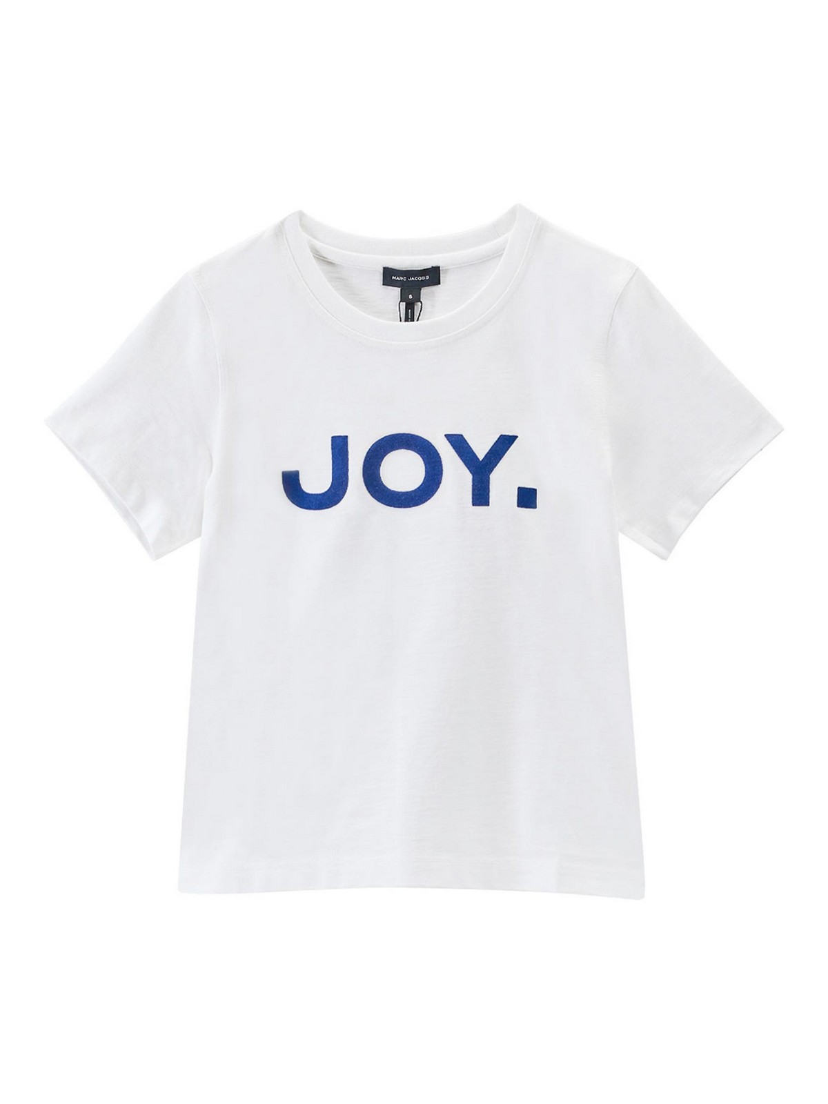 ホワイトのジョイスリムTシャツ。コントラストの効いたジョイプリントをあしらったマーク・ジェイコブスのクロップドコットンTシャツ。クルーネック、ショートフィット、前面にコントラストプリント、背面にスクリーンプリント、カラー:ホワイト、100% コットン、スリムフィット、ポルトガル製。