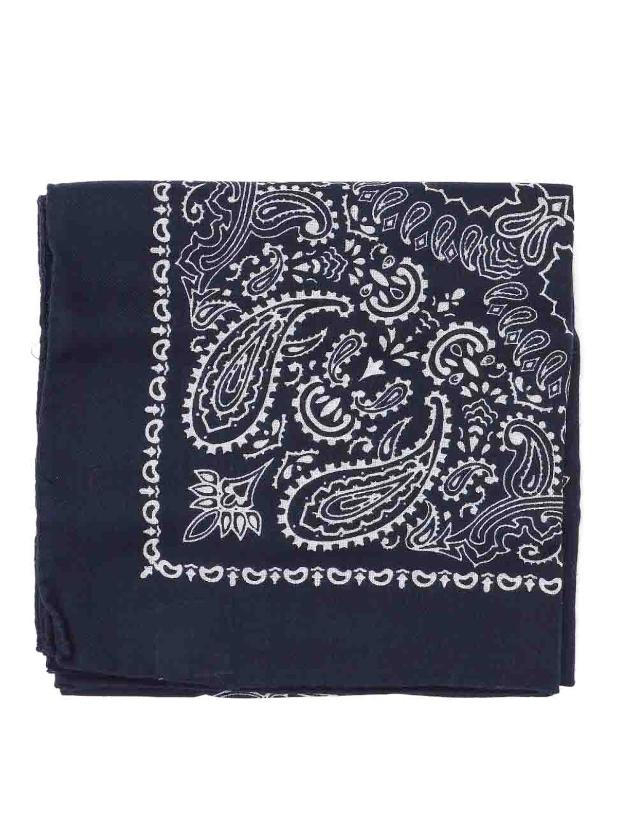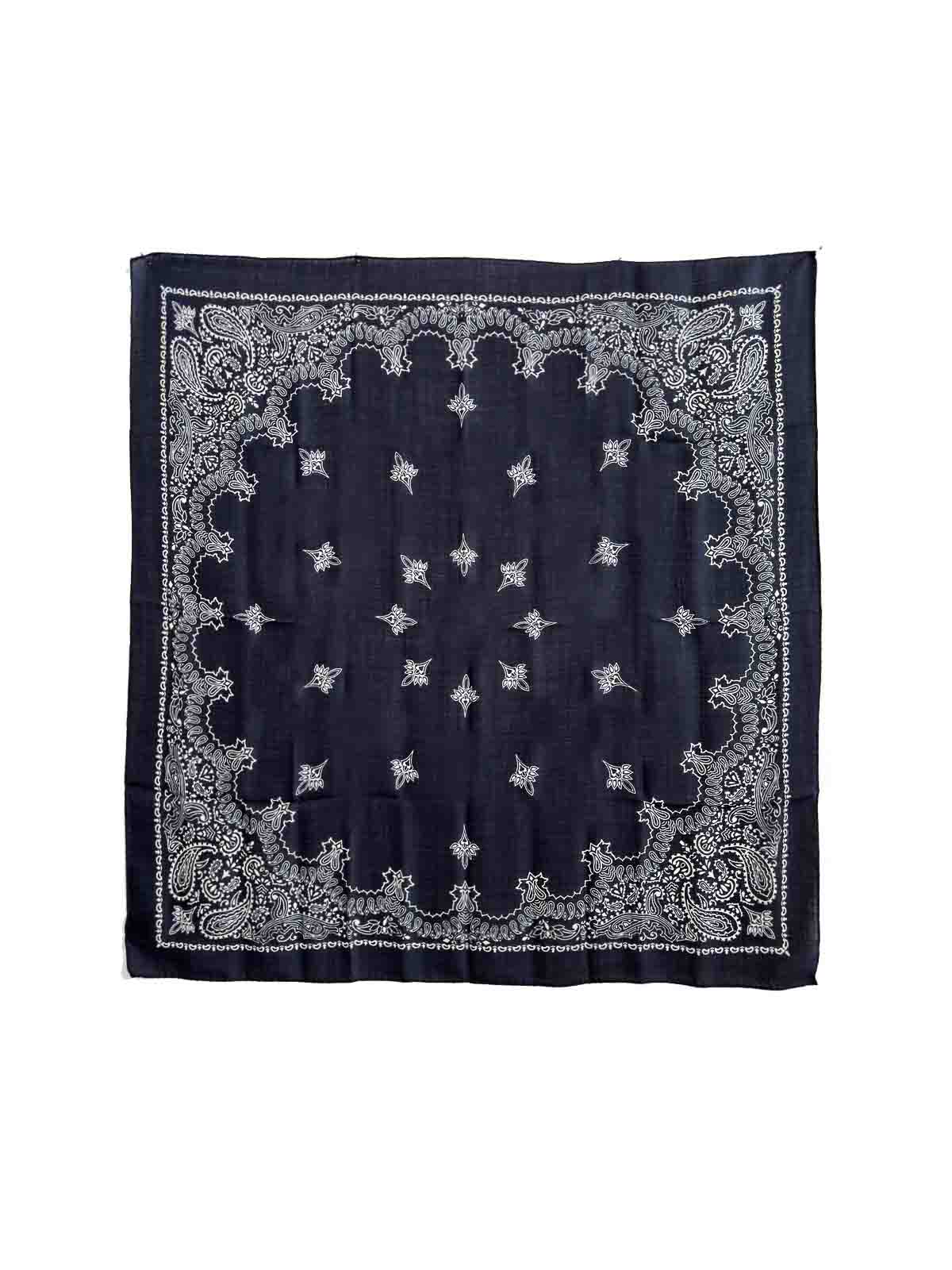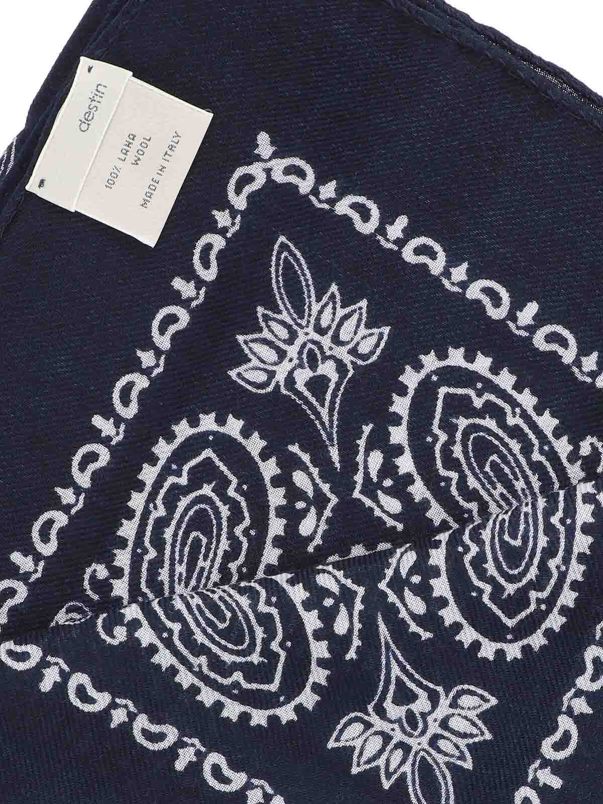 デスティンジュディスカーフ、ブルーウール、コントラストの効いたバンダナプリントモチーフ、レトロなロゴラベル、スクエアシェイプ。