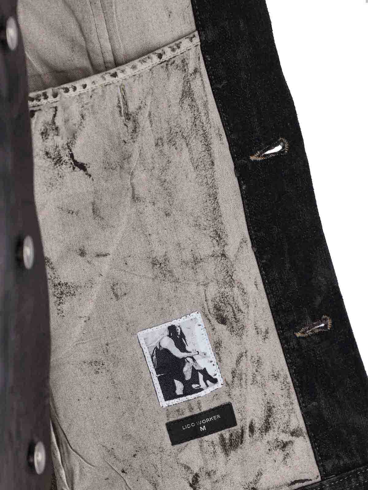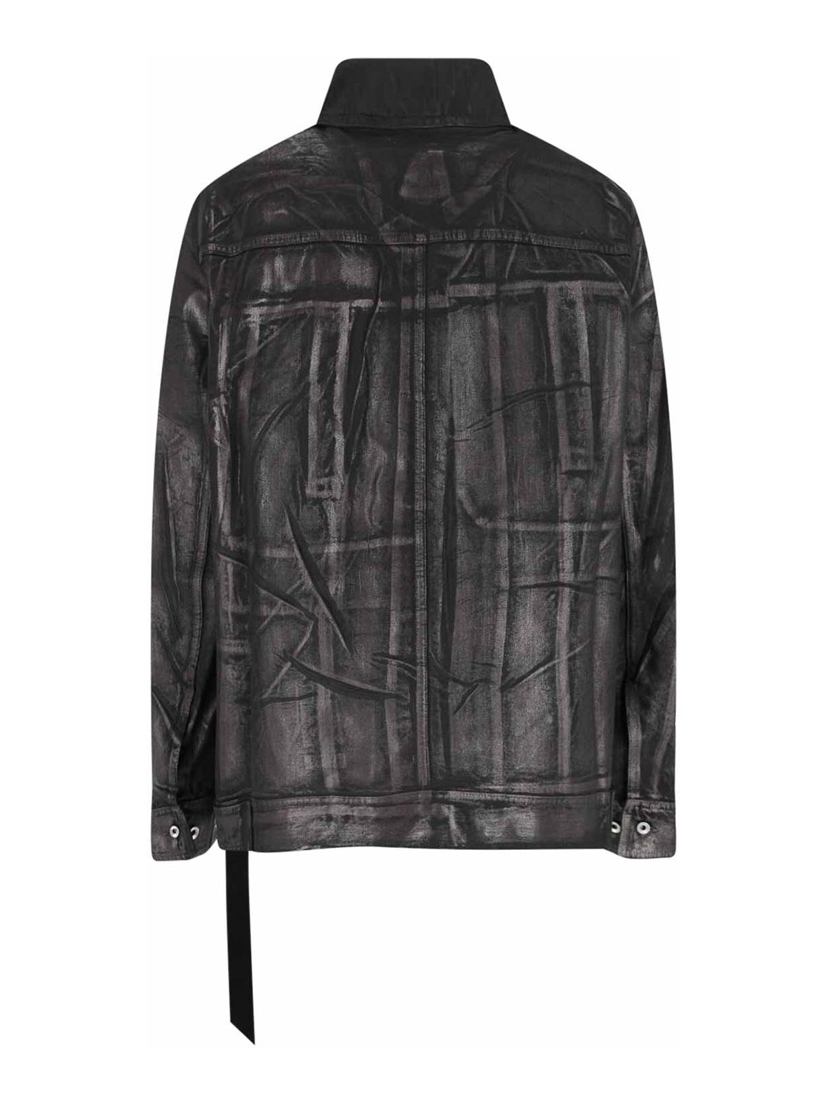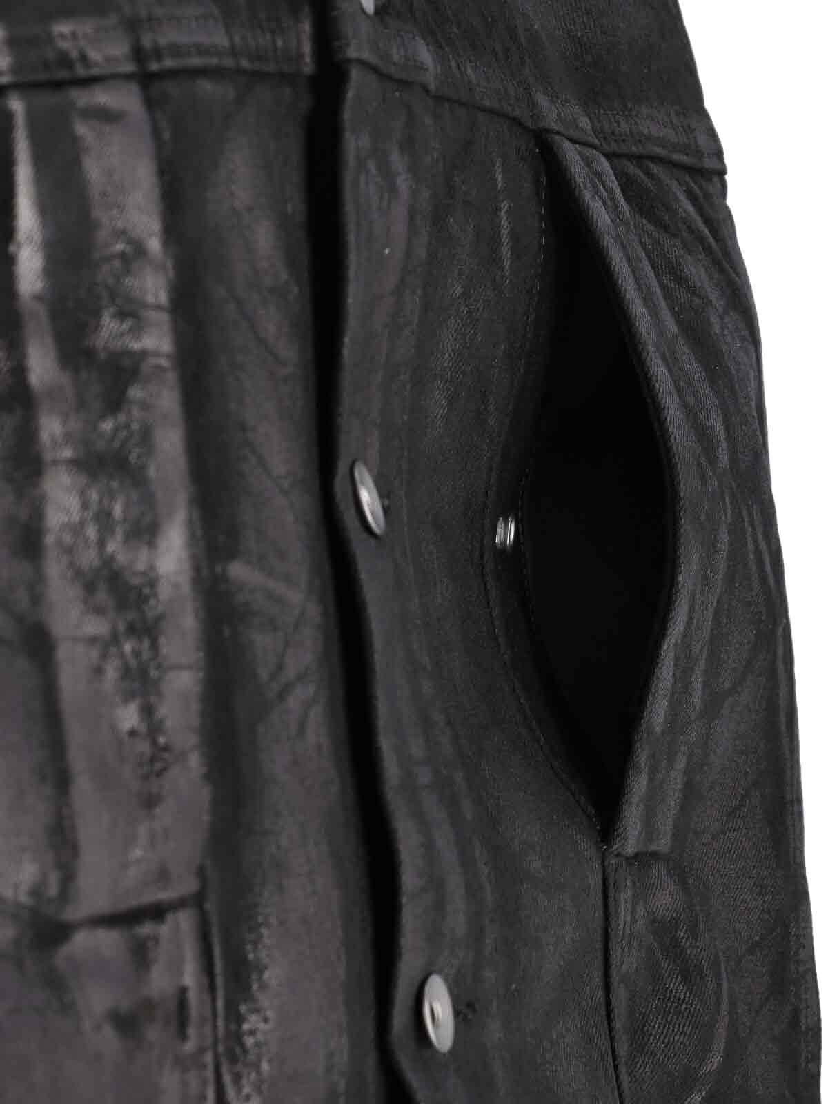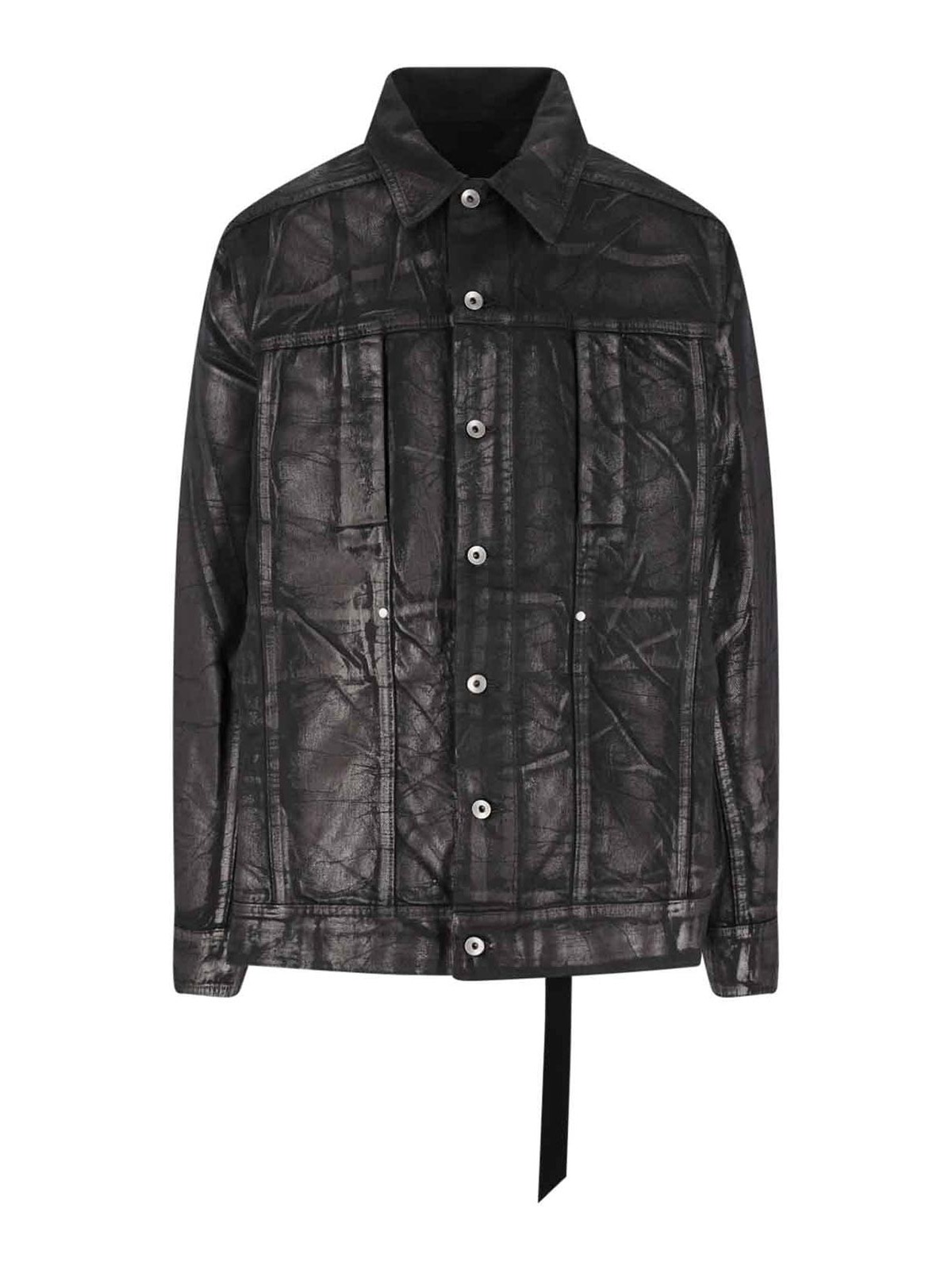 Rick Owens drkshdw ジャンボジャケット、ブラックコットンデニム、メタリックエフェクト、クラシックカラー、ボタン留め、サイドポケット2つ、内部フラットポケット1つ、ボタン付きカフス、バックリボンディテール、ストレートヘム。