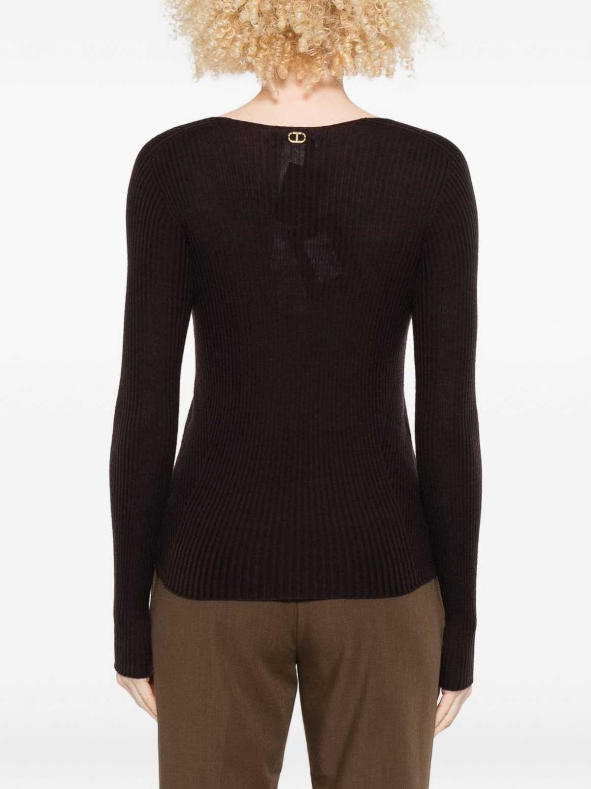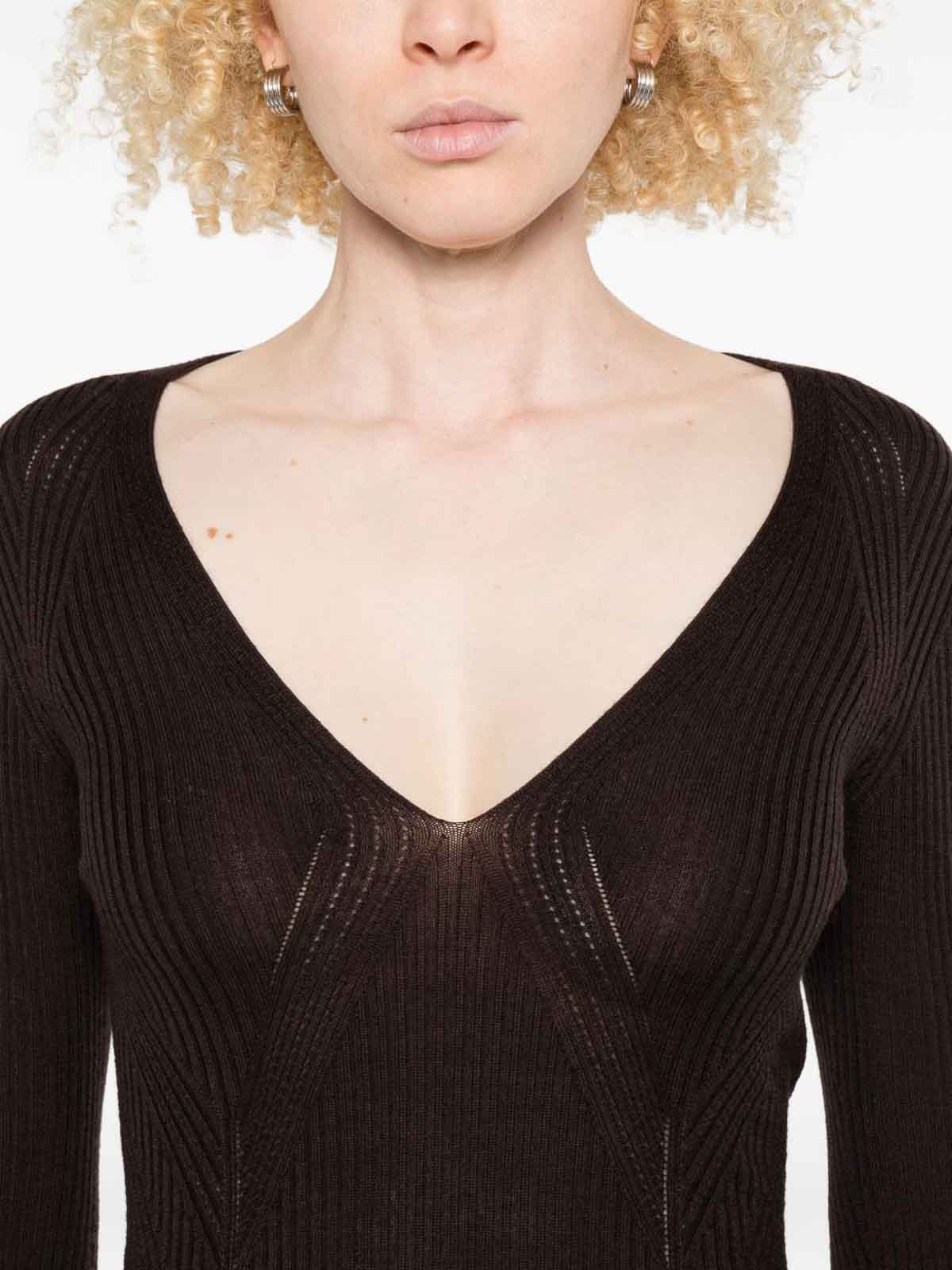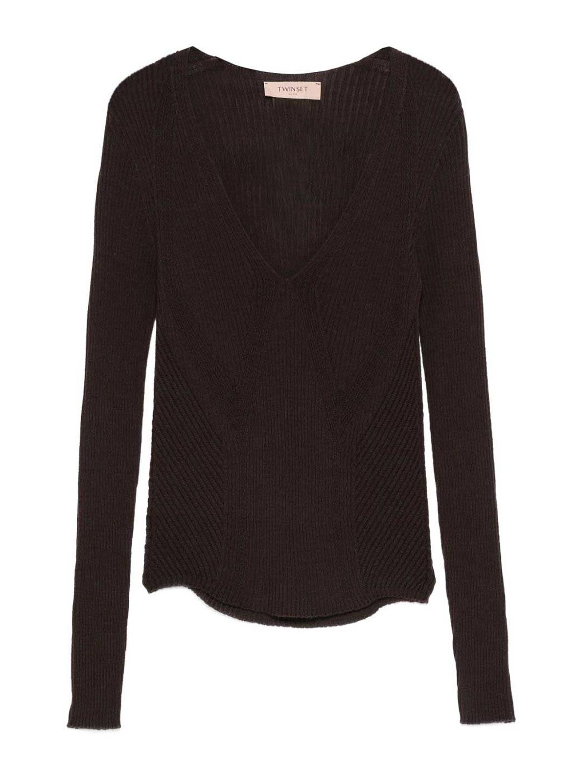 ブラウン Vネックリブニットロングスリーブぴったりフィットするボディスストレートヘムライン