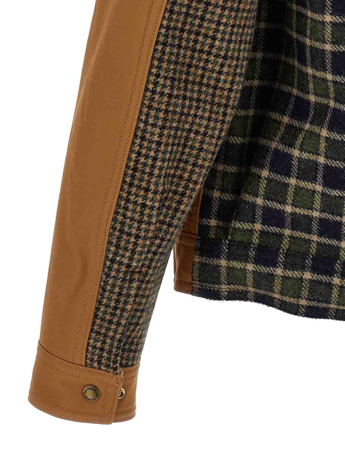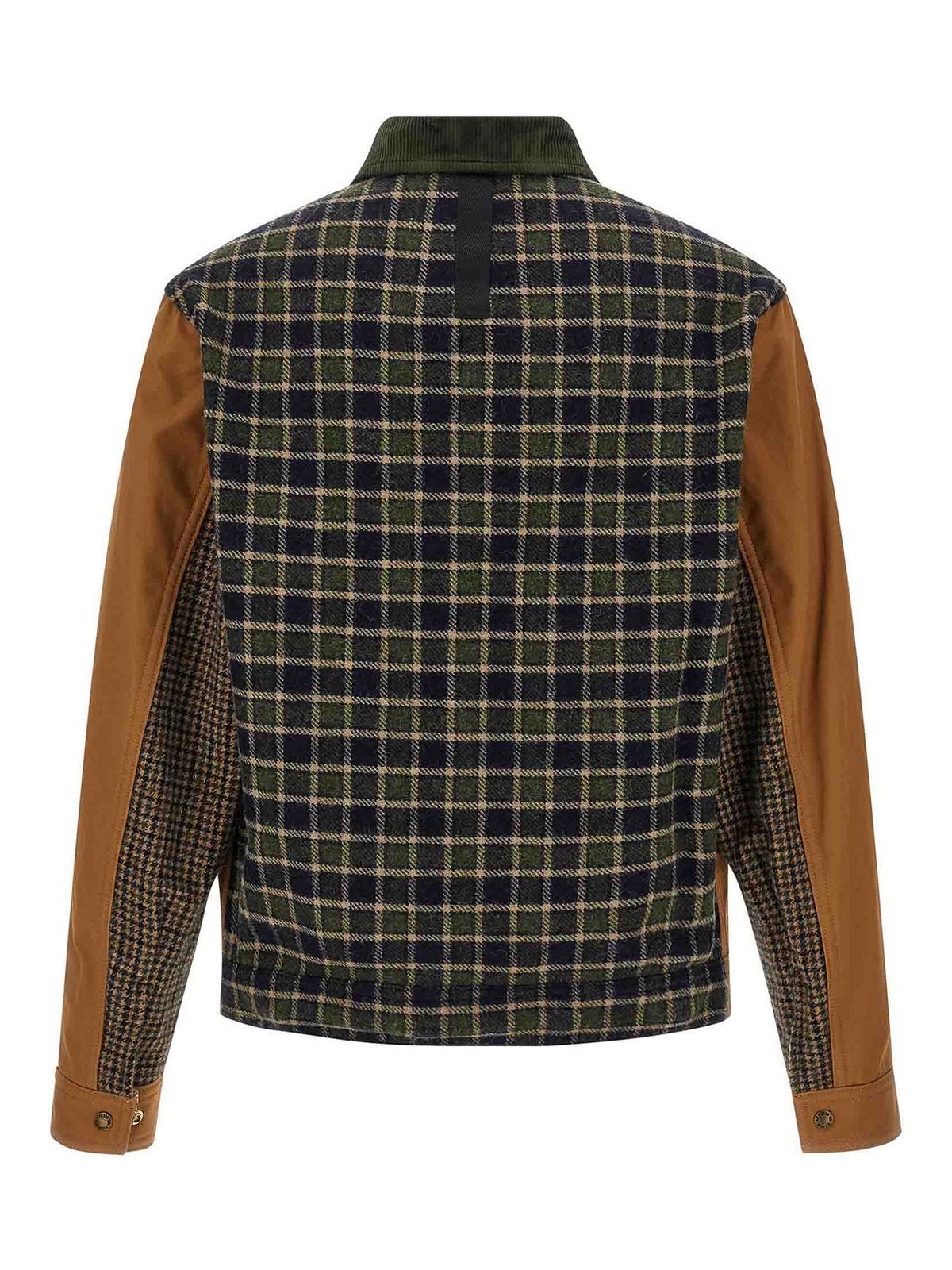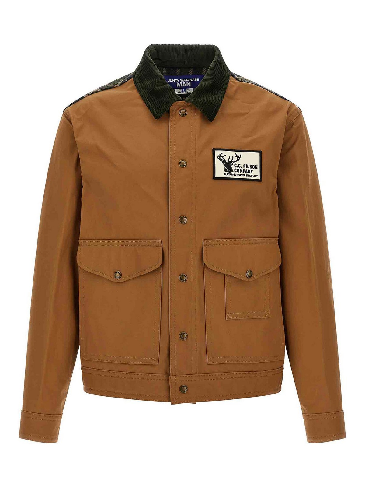Filson junya watanabe ジャケットは、裏地付きのチェック柄と千鳥格子の裏地なしコーデュロイシャツの襟、ロゴパッチ、スナップボタンポケット、袖口付きの長袖で構成されています。