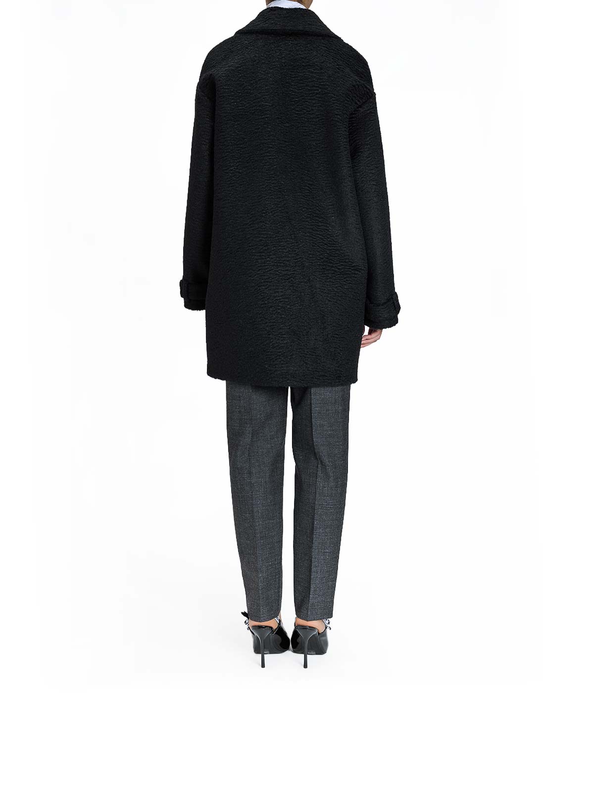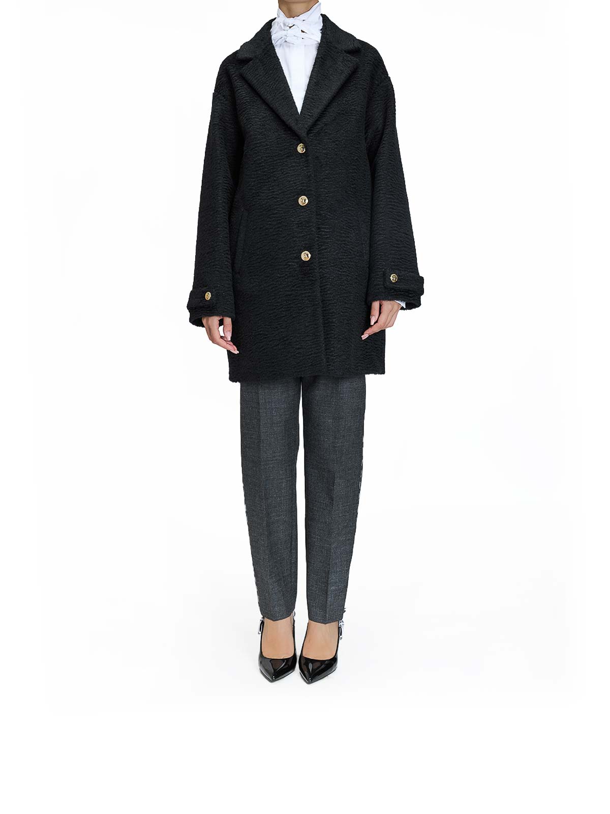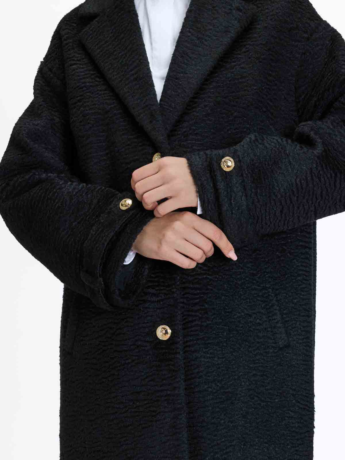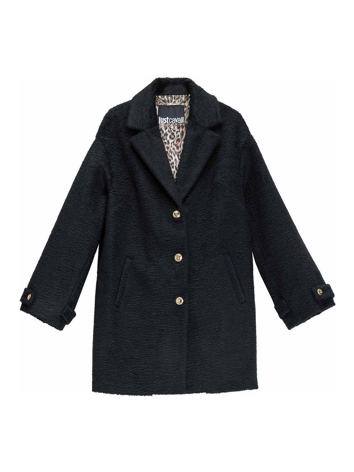 ブラックのフェイクアスカトランコート。Just Cavalliのコートです。ブークルテクスチャ、ラペルカラー、ゴールドカラーのジュエルボタンをあしらったシングルブレストデザインのコートです。内側にはヒョウ柄の裏地、ソフトなブークルテクスチャ、シングルブレストデザイン、ラペルカラー、ゴールドカラーのジュエルボタン、ウェルトポケット、ヒョウ柄の裏地、ややオーバーサイズ、色:黒、100%ポリエステル。