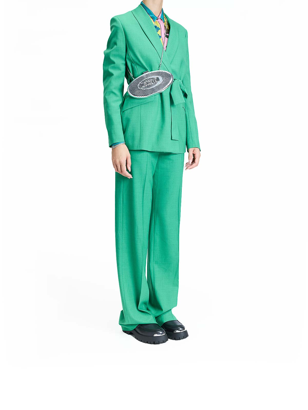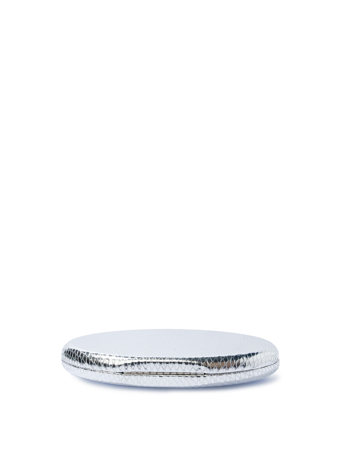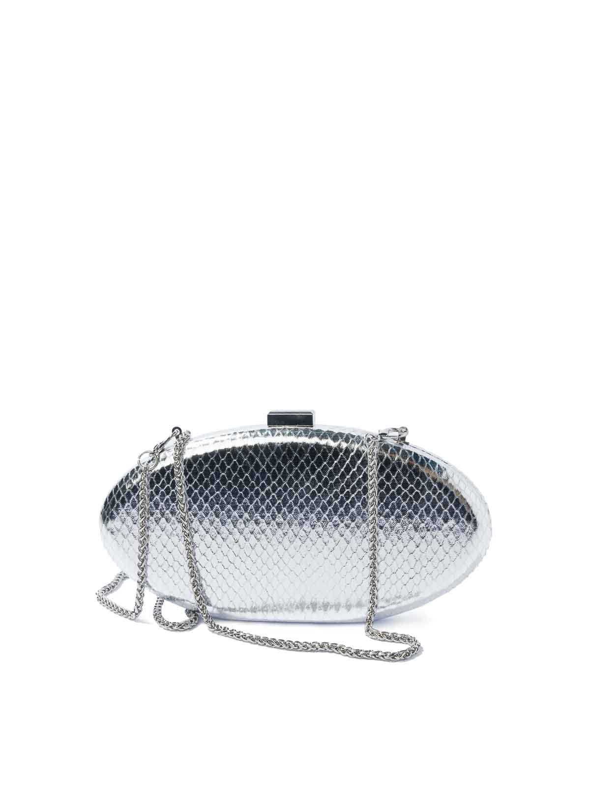シルバーの JC パーティーバッグ。Just Cavalliの楕円形ショルダーバッグ。パテントレザー仕上げで、お揃いのハンドルが付いています。前面にエンボス加工されたロゴとフラップ開口部が特徴です。パテントレザーデザイン、フロントボタン留め、取り外し可能なチェーンショルダーストラップ、メタルロゴプレート、内部コンパートメント1つ、マチ付き内ポケット。