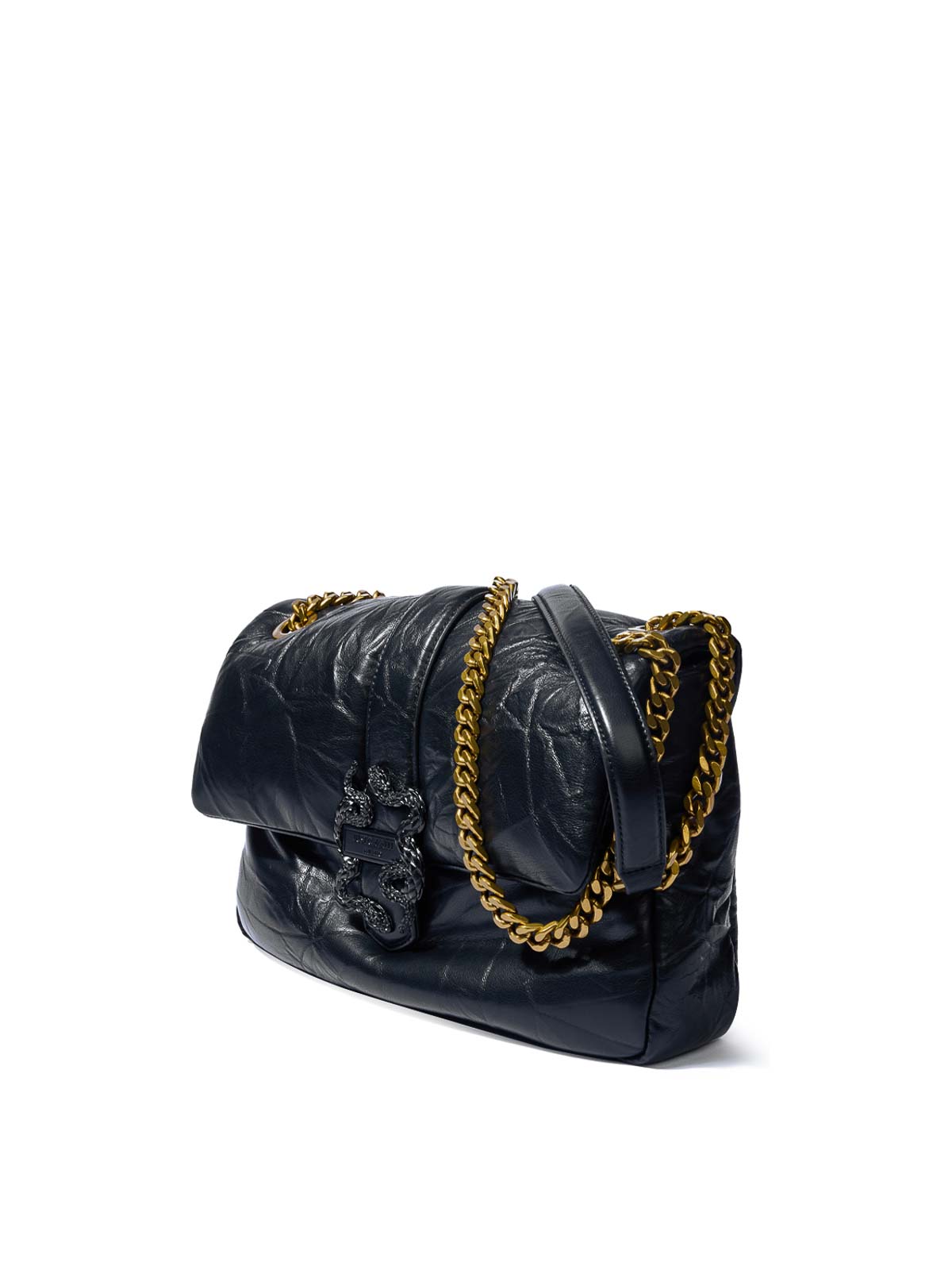 ブラックのアイコニックなスネークパフィーバッグ。Just Cavalliのショルダーバッグ。柔らかくしわのあるフェイクレザーの質感と、アイコニックなミラースネークで仕上げたフラップクロージャーが特徴です。ショルダーパッド付きのチェーンショルダーストラップ、柔らかくしわのある質感、ミラースネークのディテール、トーン・オン・トーンのロゴタグが特徴です。マグネット式のボタン留め、シングルコンパートメント、内部パッチポケット、ショルダーパッド付きのチェーンショルダーストラップも特徴です。
