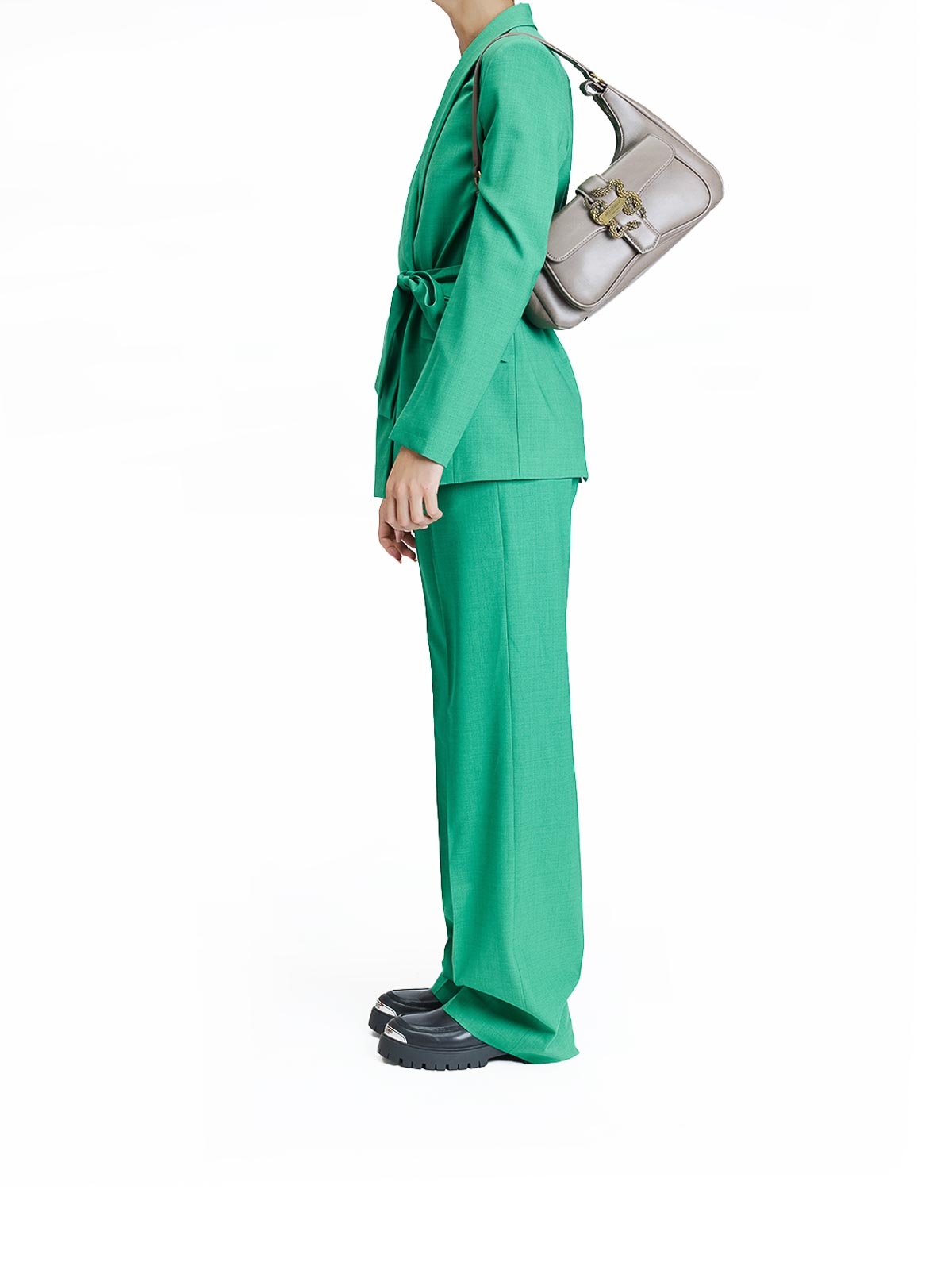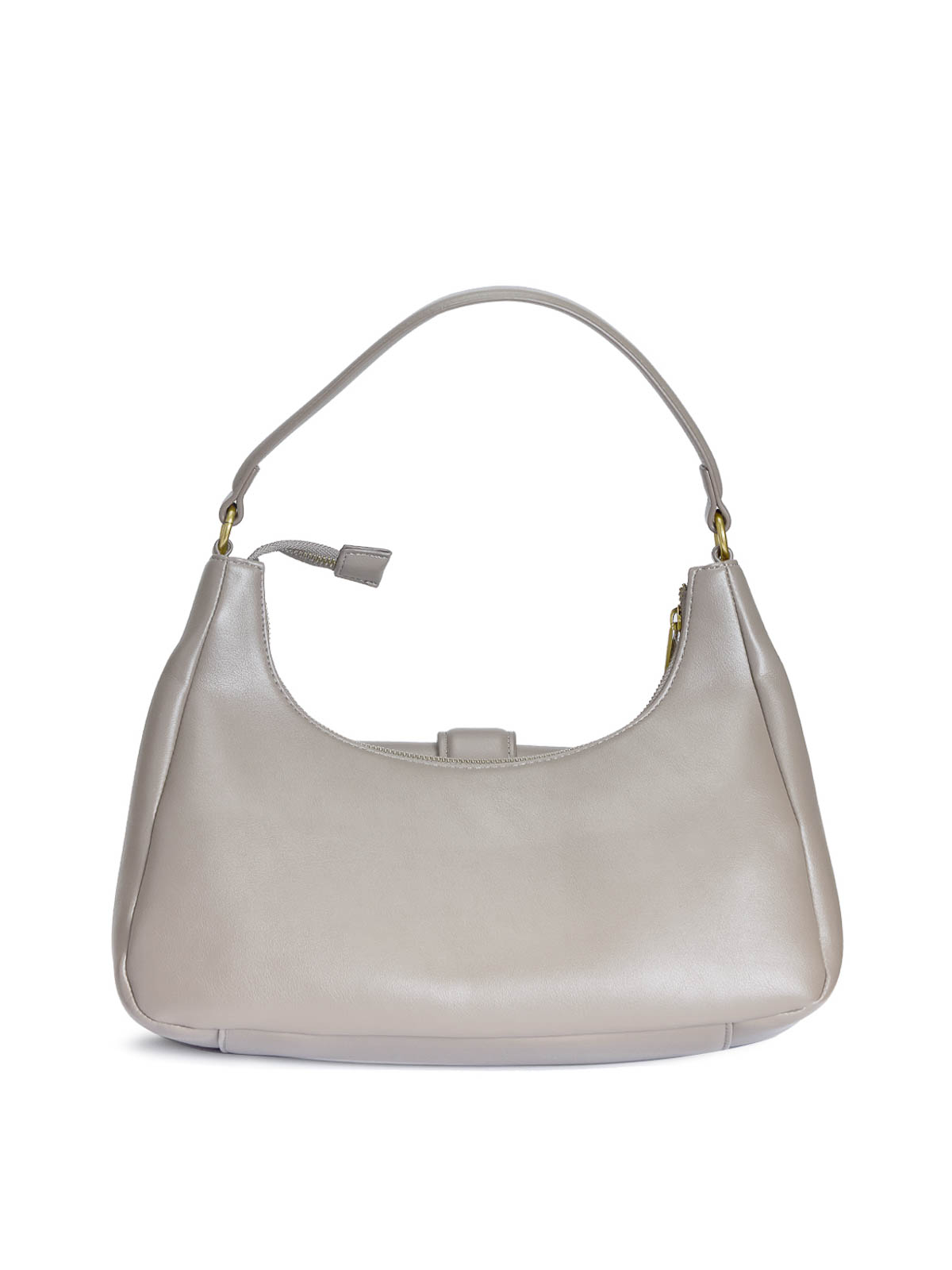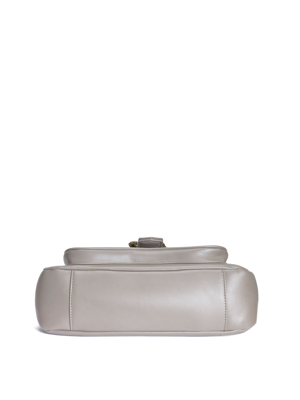 グレーのアイコニックなスネークバッグ4は、ハンドルとトップジッパー付きのジャストカヴァッリのショルダーバッグで、フロントフラップポケットとロゴ入りのミラースネークが特徴です。ショルダーバッグ、ハンドル、フロントフラップポケット、ロゴ入りミラースネーク、トップジッパー、内部パッチポケット。