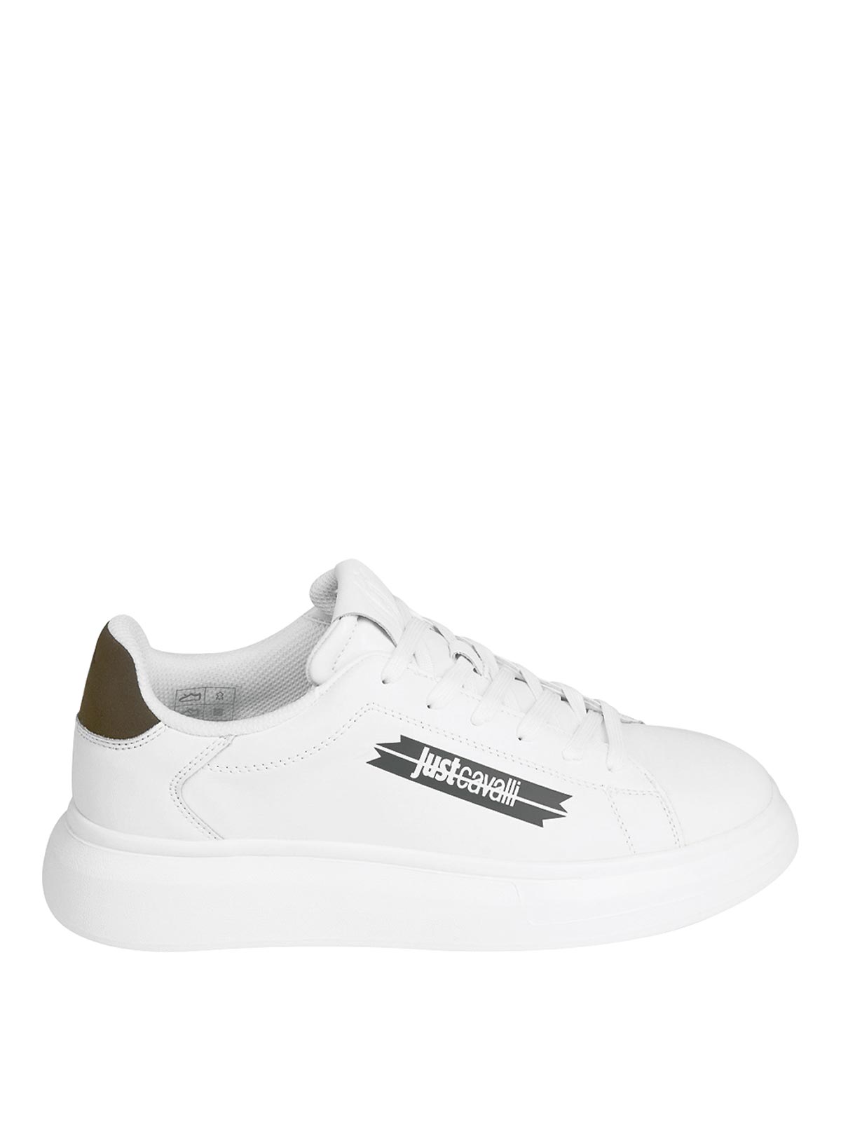 Ursa スニーカー。カラーはホワイト。Just Cavalli のレザースニーカー。サイドにコントラストの効いたロゴプリントが施され、分厚い同系色のソールが特徴。レースアップ、サイドにロゴプリント、タンにロゴタグ、分厚いソール。