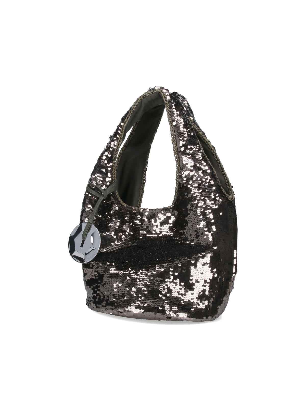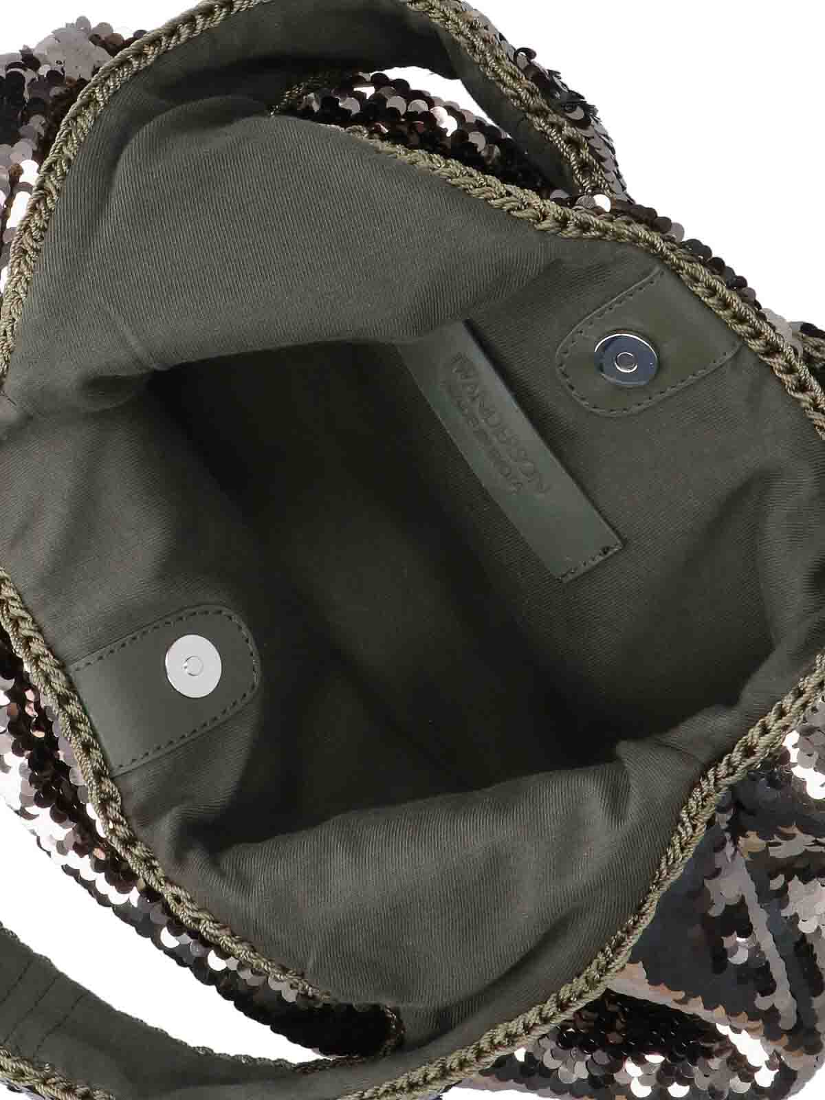 スパンコール付きミニバッグ J W アンダーソンブラウンスパンコールトーンオントーンオールオーバーチャーム付きマグネット刻印ロゴ入りシルバーメタルの取り外し可能なペンダント、ユニークなコンパートメント