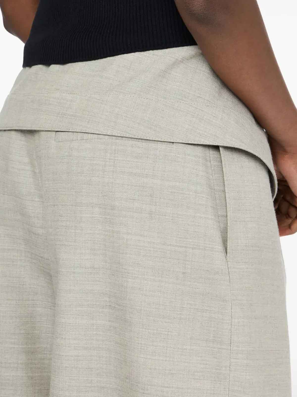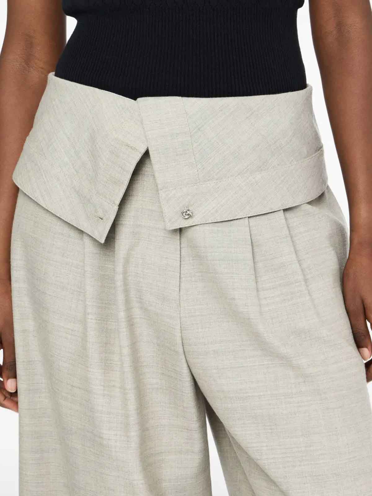 ラップウエスト、フロントボタンとジッパー、ワイドレッグ、ストレートヘムが特徴です。組成 100% ウール