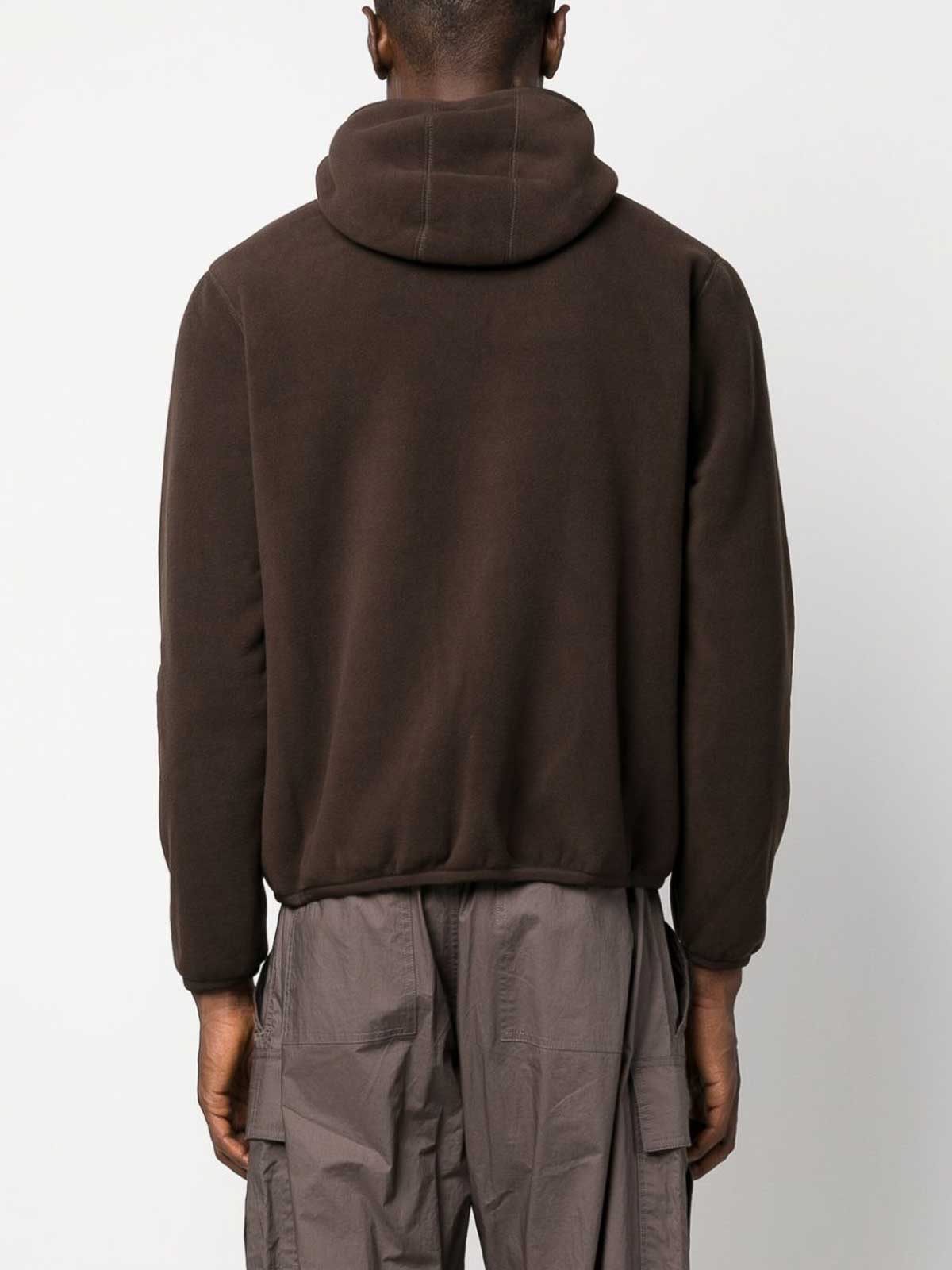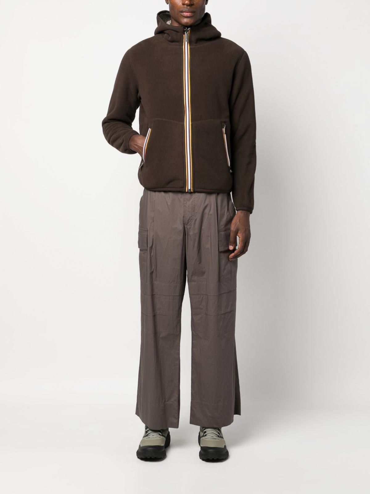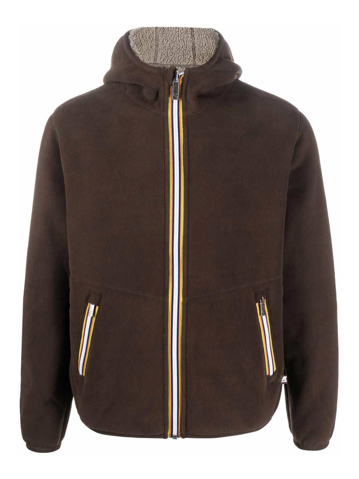 k-way r&dのリバーシブルジップアップフリースジャケットは、トープブラウン、チョコレートブラウン、フリースの質感、リバーシブルストライプのディテール、クラシックなフード、フロントファスナー、2つのサイドスリットポケット、長袖、伸縮性のある袖口、ストレートヘムが特徴です。