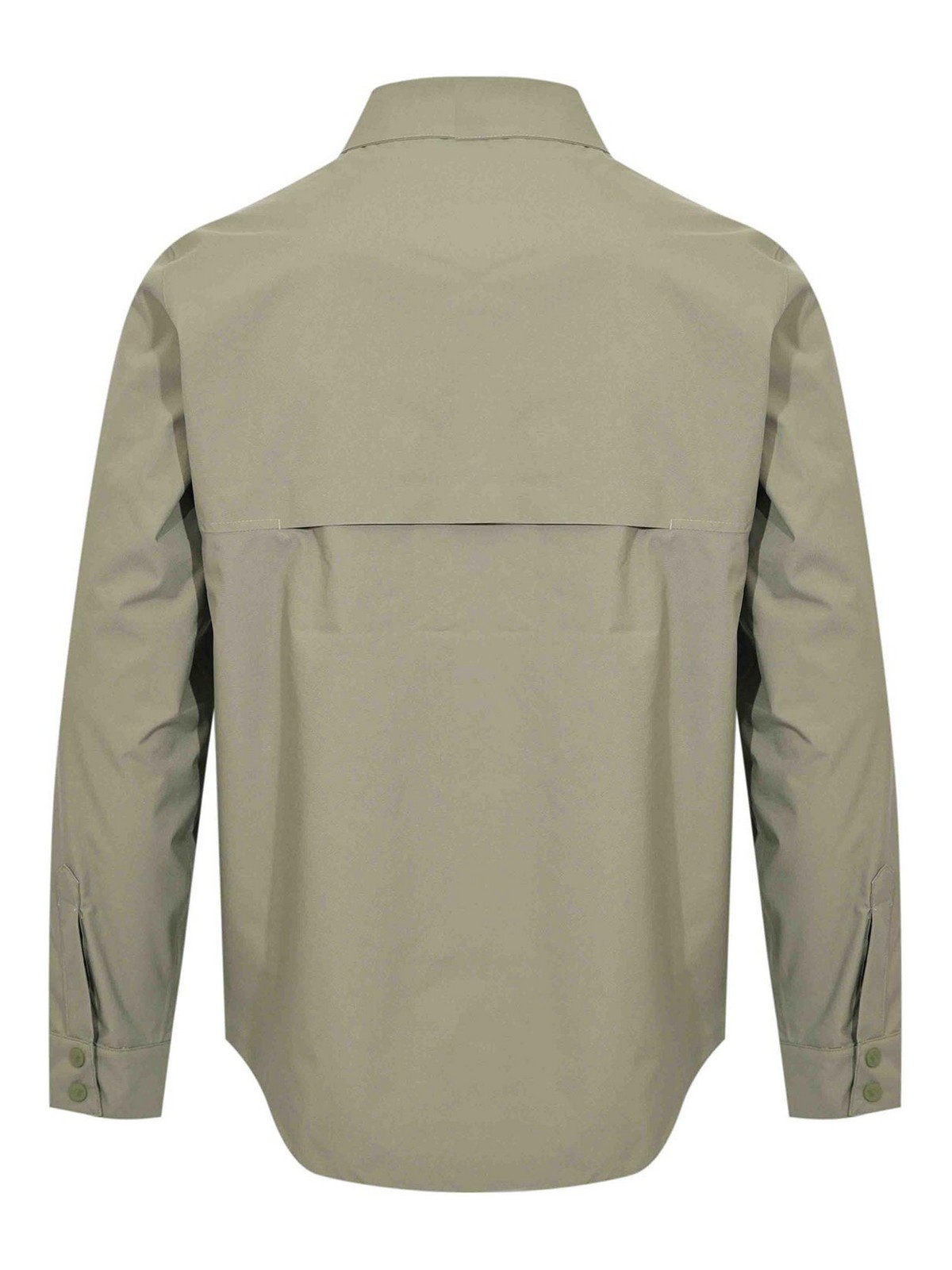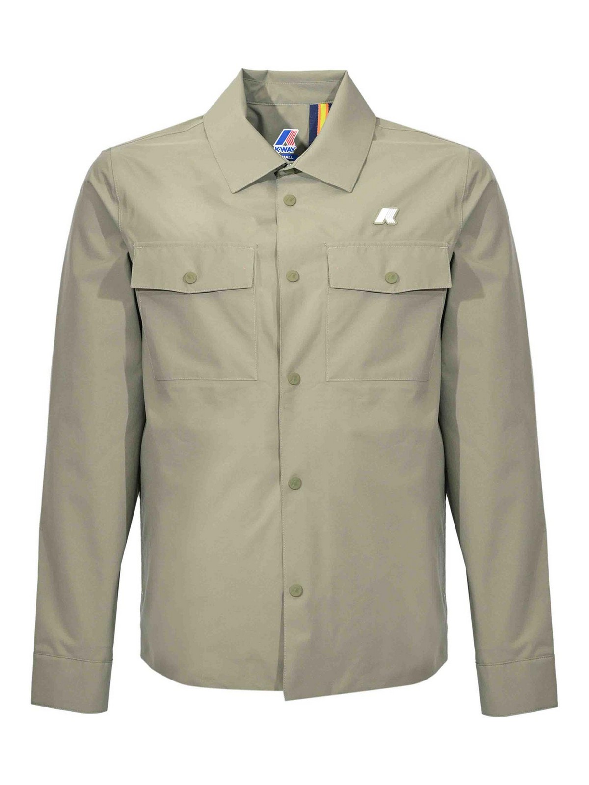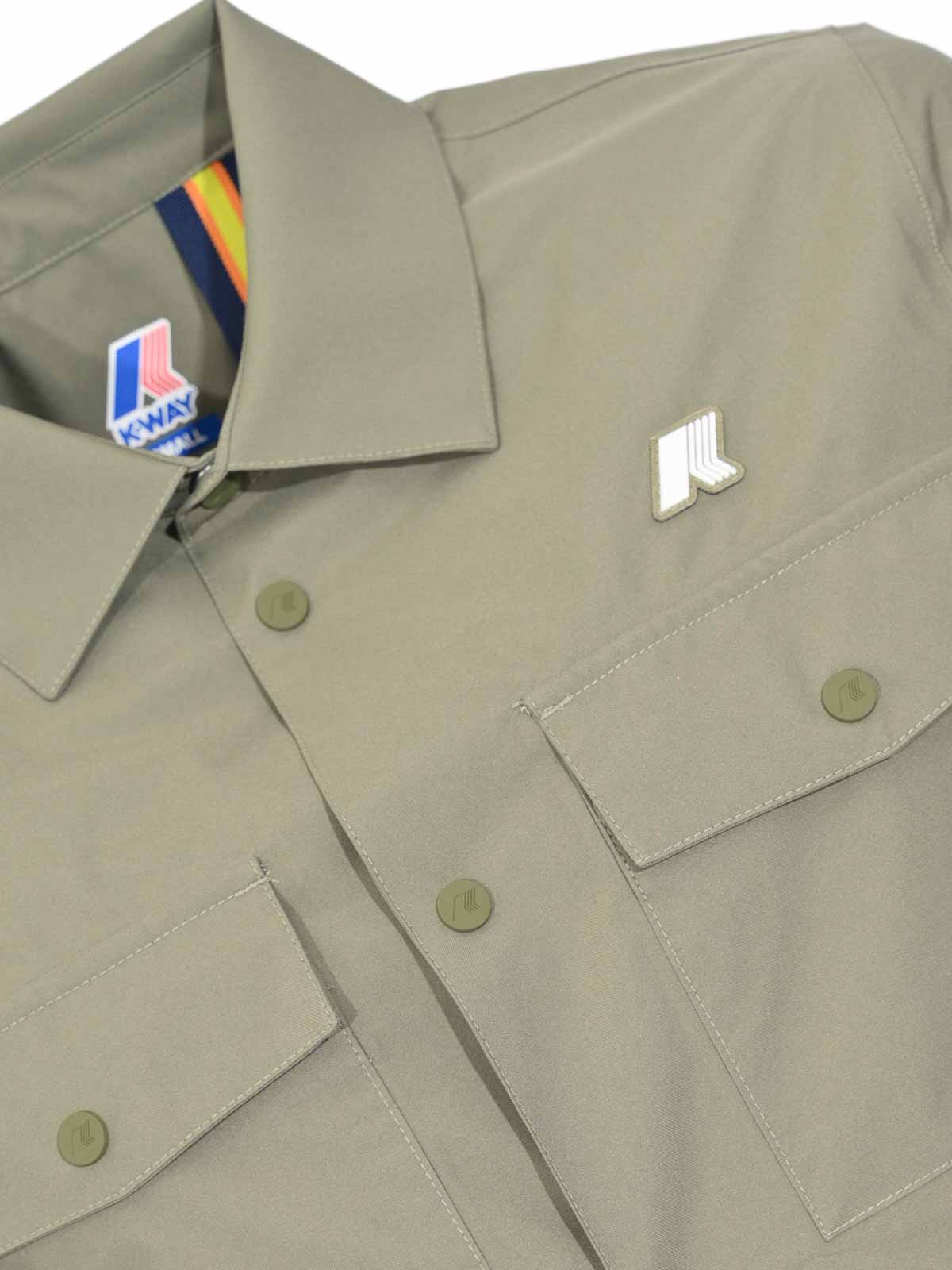 ストレッチテクニカルファブリック製メンズオーバーシャツ、Kウェイ、アンバートストレッチ 2層モデル、生地:2層ストレッチテクニカルファブリック、防水、防風、通気性、パターン:無地、袖:ボタン付きの調節可能な袖口、襟:シャツカラー、クロージャー:スナップボタン留め、ポケット:フラップとボタン付きのフロントパッチポケット2つ、ディテール:胸にロゴ入り、アイコニックなマルチカラーのインナーディテール、リアヨーク通気口付き、裏地付き:なし、フィット:レギュラー