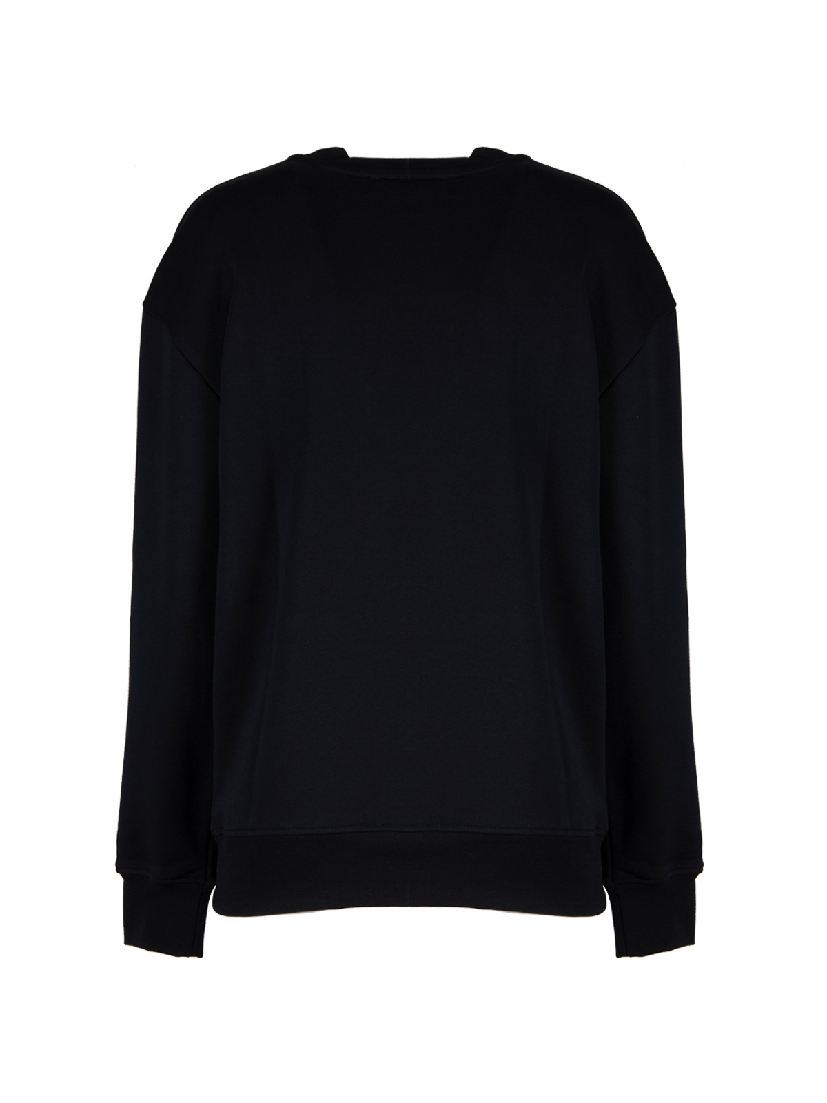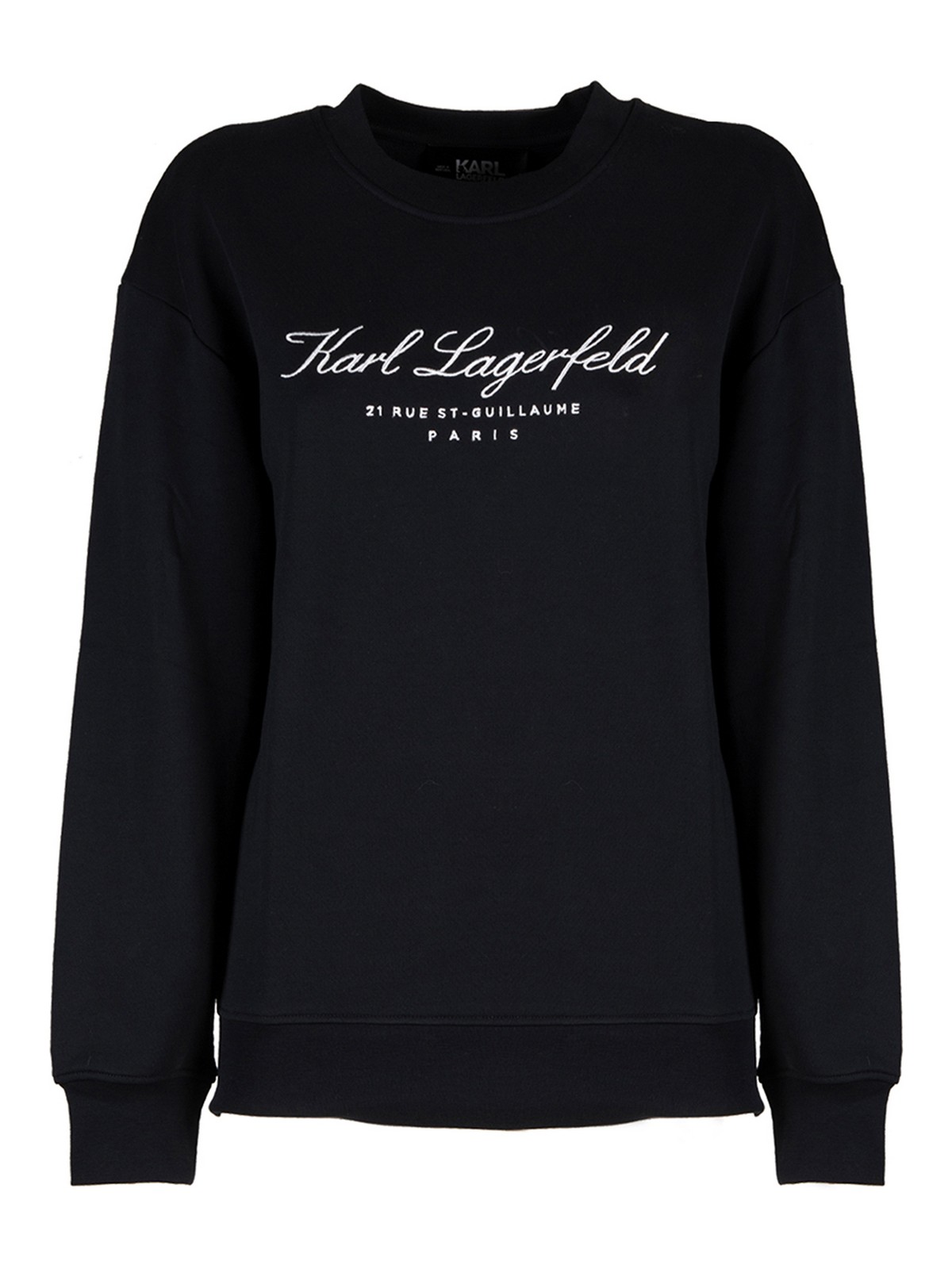 黒のホテルカールスウェットシャツ、オーガニックコットンのクルーネックスウェットシャツ。前面にコントラストカラーのカールラガーフェルドメゾンのロゴが刺繍され、縁にリブ編みが施されています。