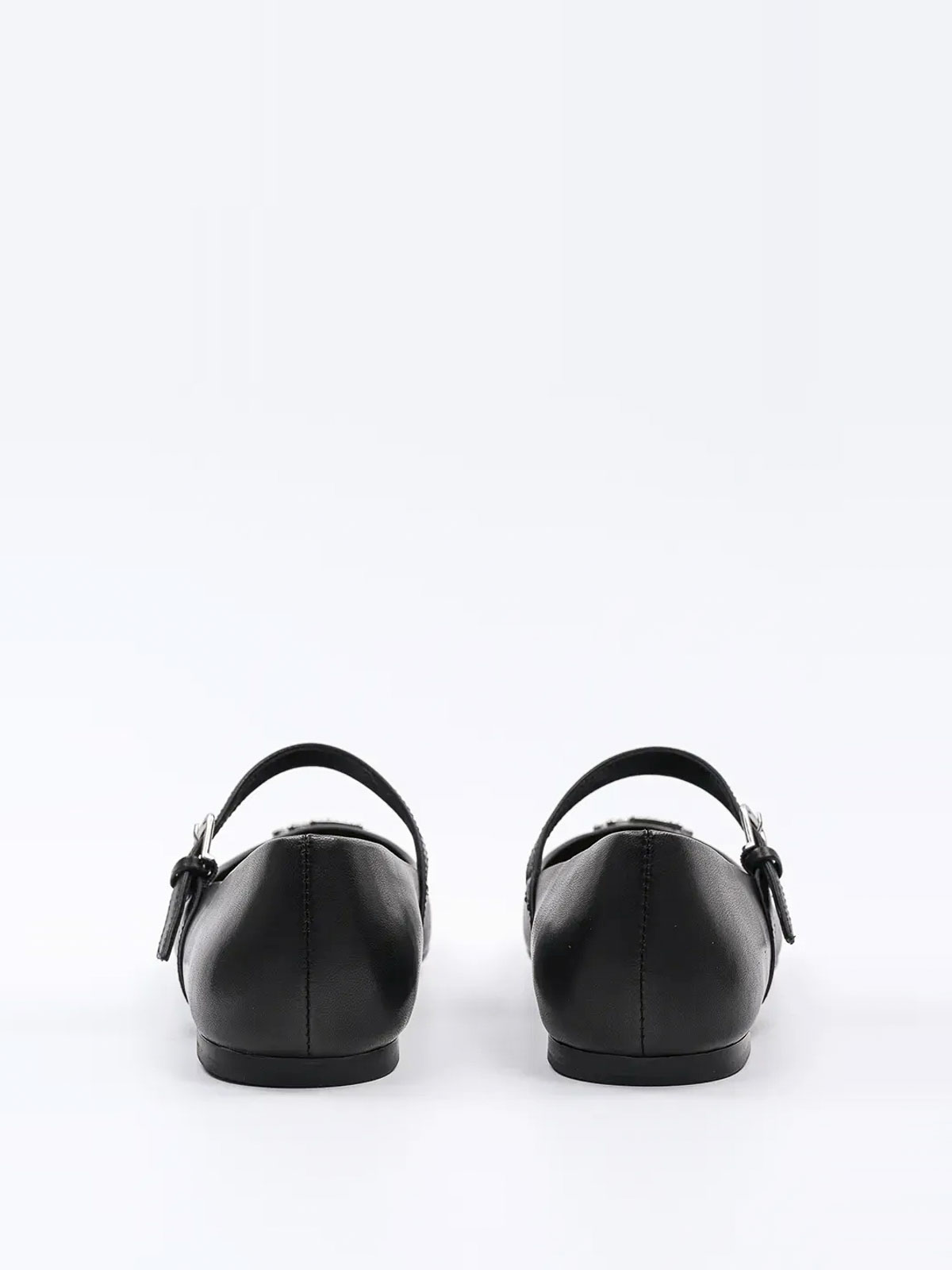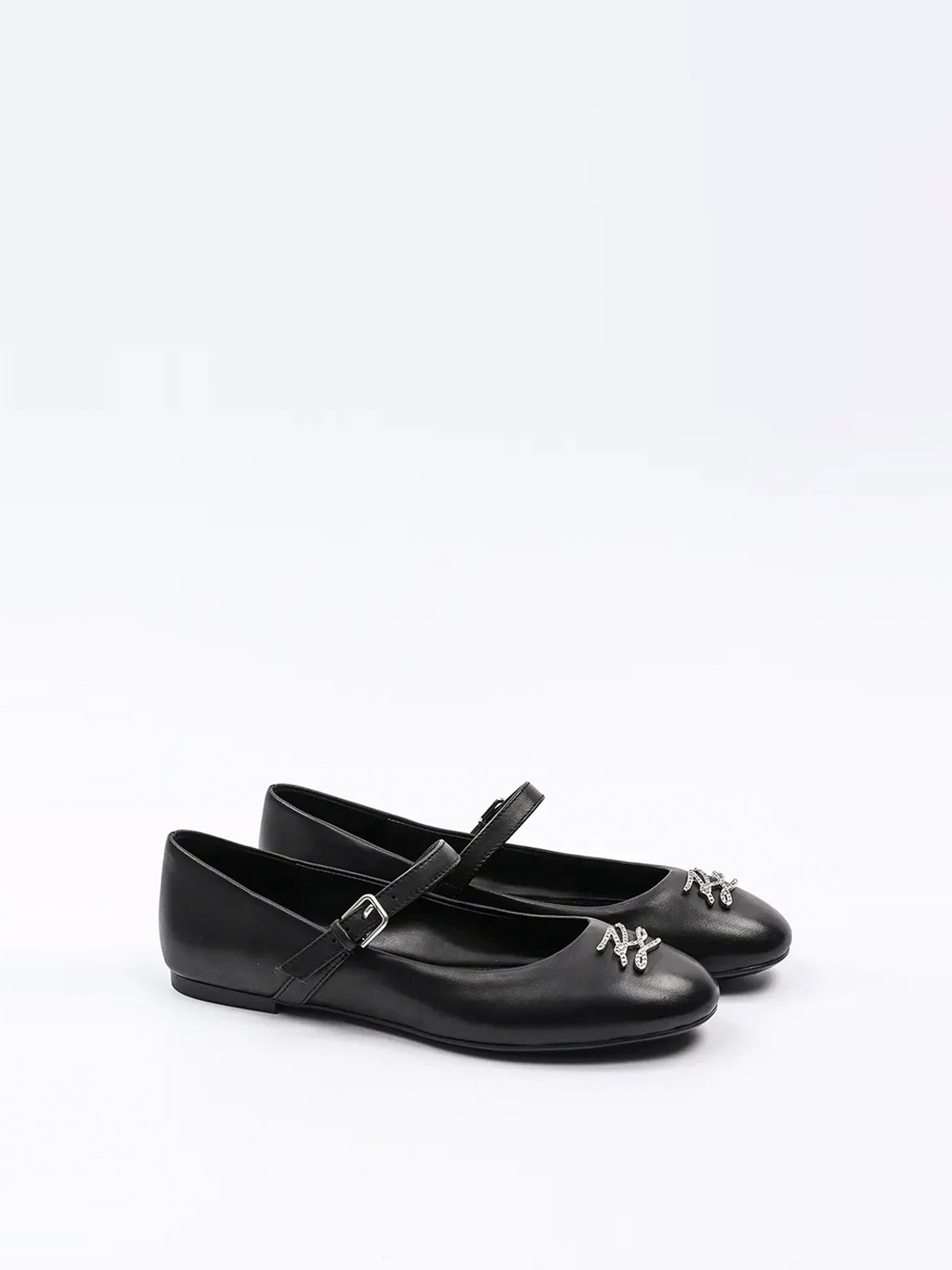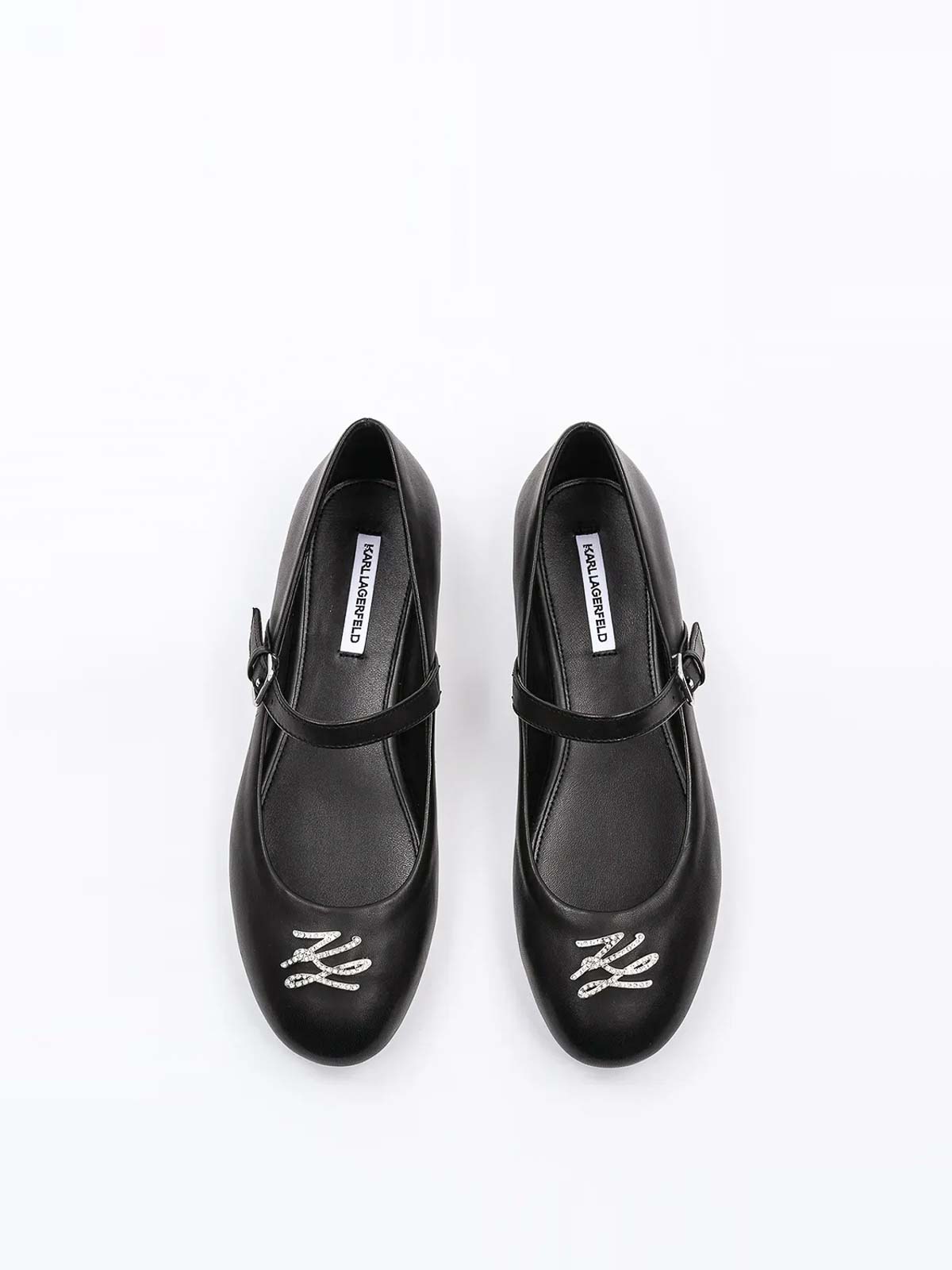 Karl Lagerfeldのサイン入りブラックダンサーのサイン入りブラックのKarl Lagerfeldのサインと、針先の尖ったストラップと先の尖った先のとがった先のとがった先のとがった装飾が施されたヒールバックルと黒い色のボタンが付いた黒いバックルが特徴です。