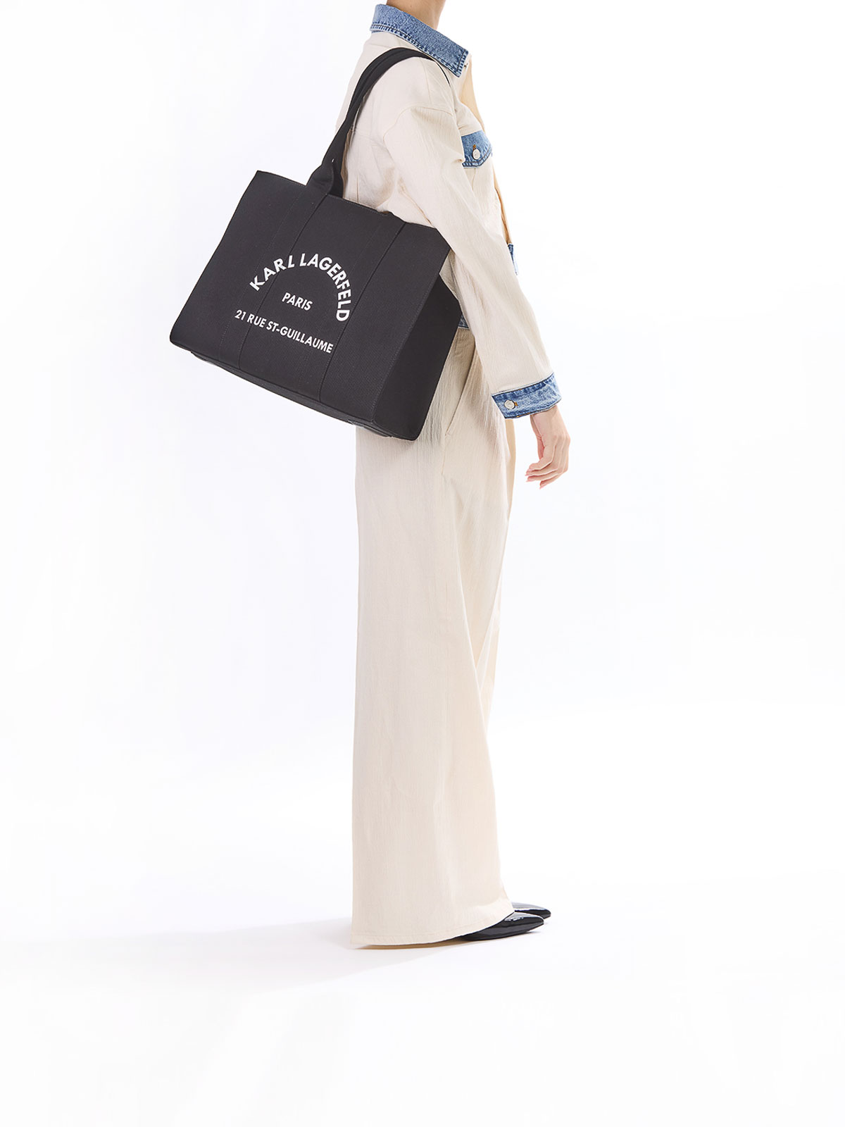 K/RSG スクエアラージトートインブラックカールラガーフェルドの Rue St, Guillaume のロゴがプリントされたこのトートバッグは、正方形のシルアウトと絡み合った質感が特徴です。このバッグは、ジッパー付きの優れたハンドルと、内側に取り外し可能な大きなコンパートメントがあり、内側にはファスナー付きの優れたハンドルが付いており、ギヨーム通りのスクエアデザイン rue St, Guillaumeの日常のバッグとして最適です。取り外し可能なジッパー付きのユニークなコンパートメント h l w