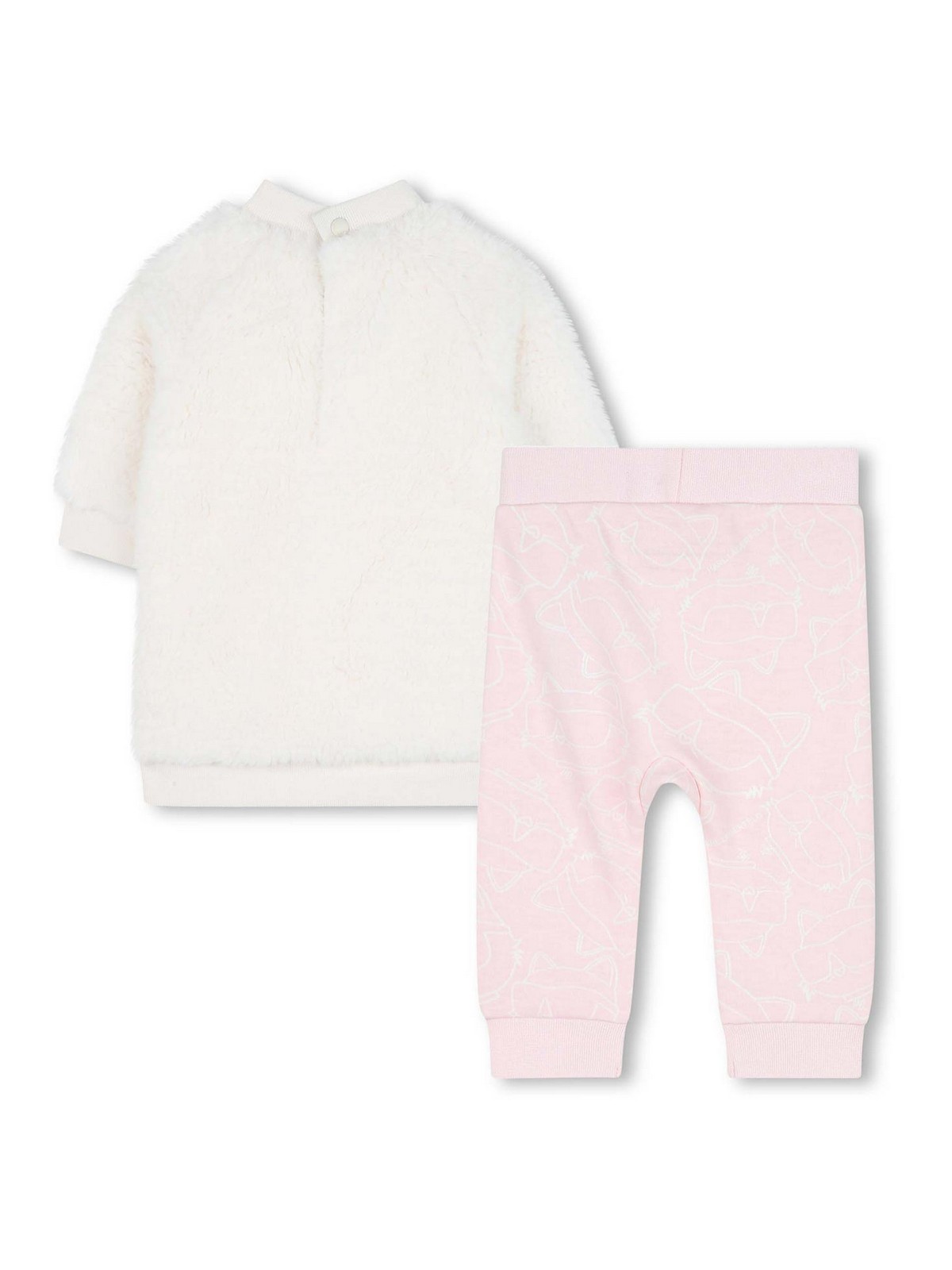 白とピンクのロゴセット、背中にプリントが入ったスウェットシャツ、背面にボタン付き、全体にプリントされたピンクのズボン