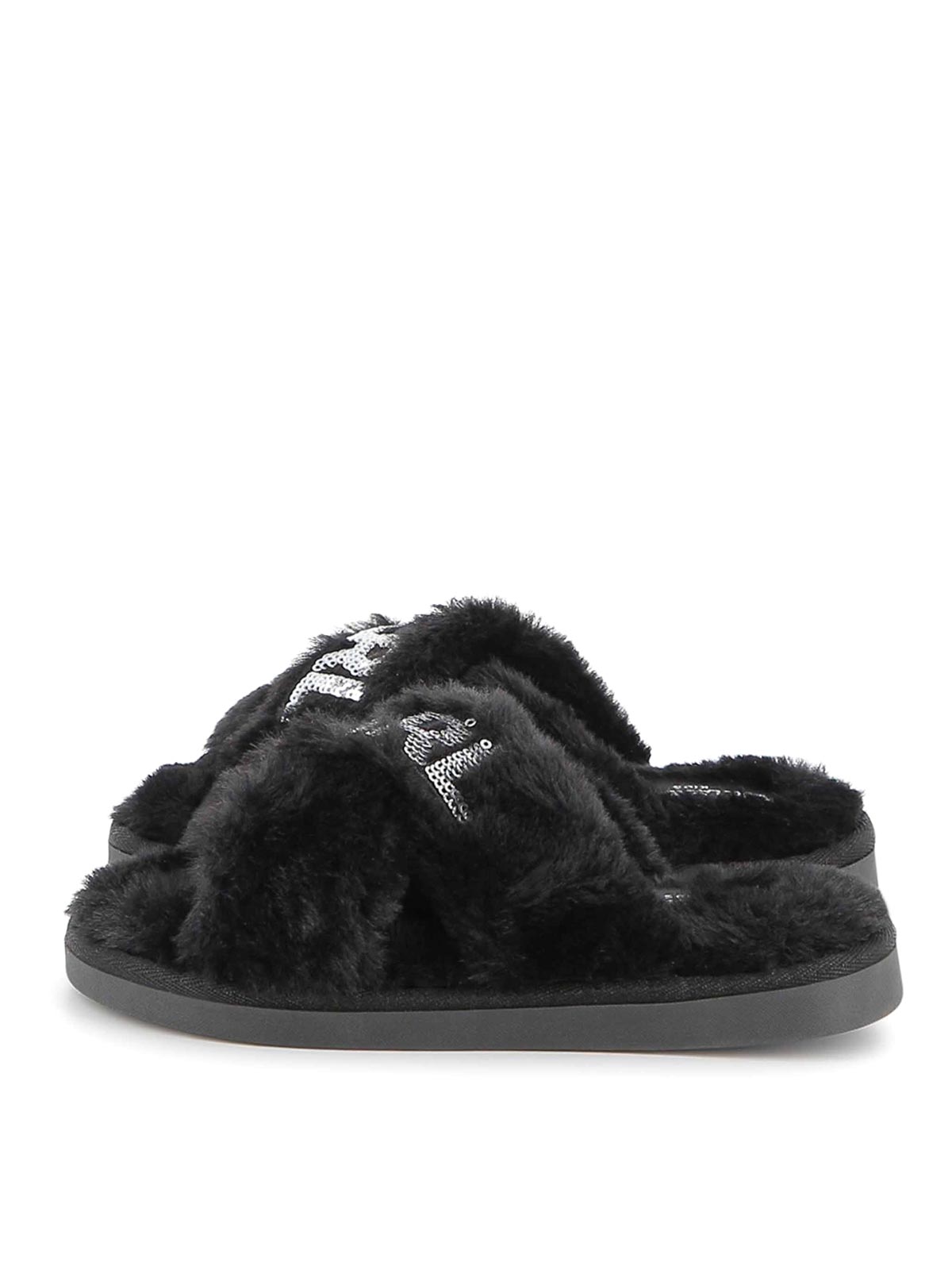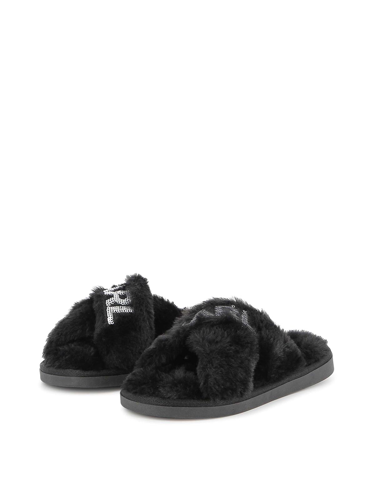フェイクファーのスリッパは、つま先が平らなブラックスパンコールのロゴデザインが特徴です