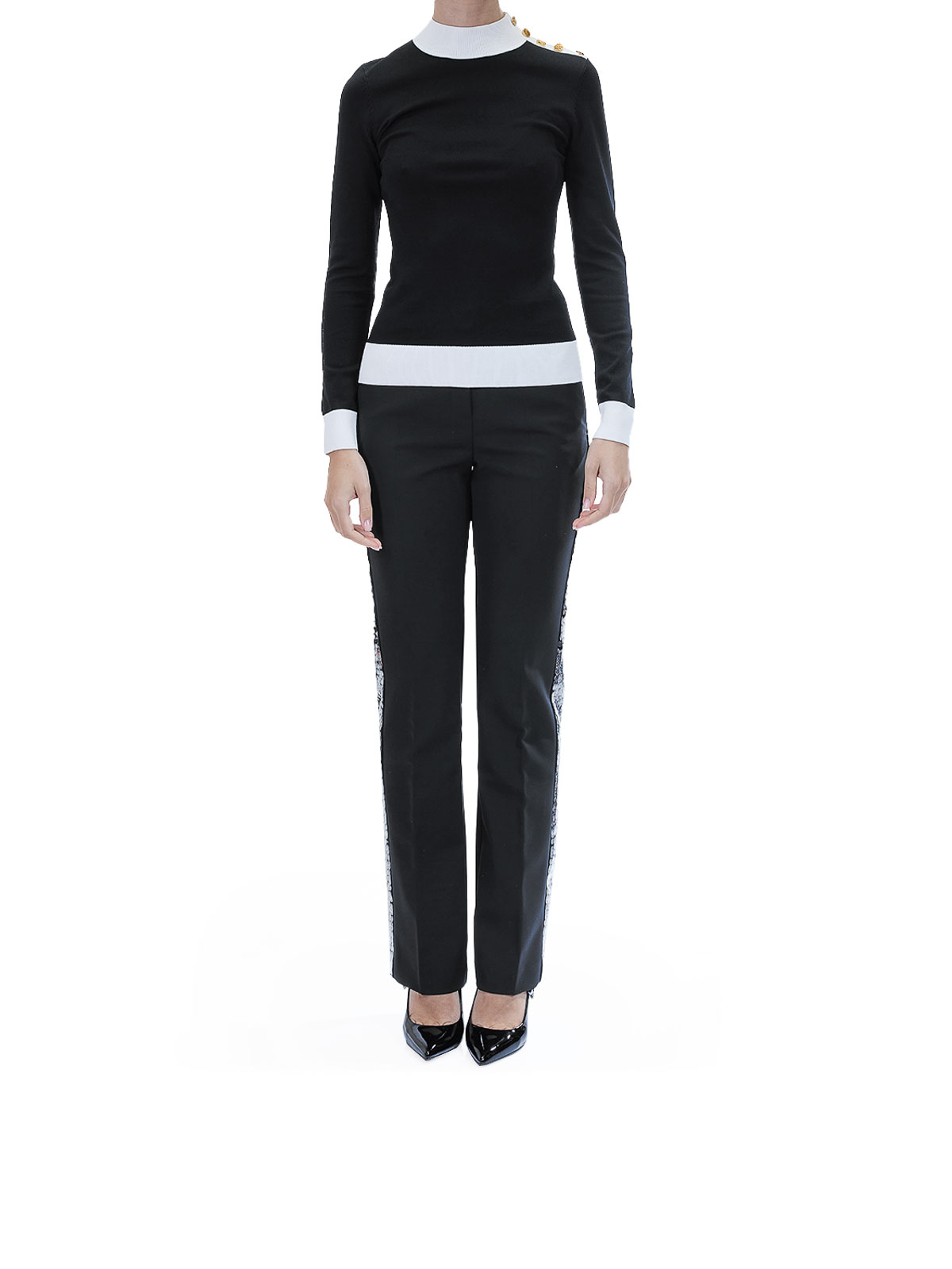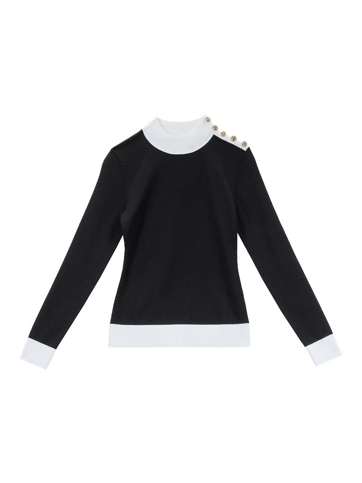 ボタンディテールのモックネックニット。カラーはブラック/ホワイト。肩、ハイネック、袖口、裾にコントラストカラーのトリムをあしらったカールラガーフェルドセーター。肩にはカールのサインをあしらったゴールドカラーのボタンがあしらわれています。ハイネック、コントラストカラーのトリム、ブリーチ加工のカールサインボタン、リブ編みのカフス。カラー:ブラック/ホワイト。リサイクルビスコース 51%、ナイロン 49%。フィット:スリム。よりリラックスしたフィット感をお求めの場合は、大きめのサイズをご注文ください。