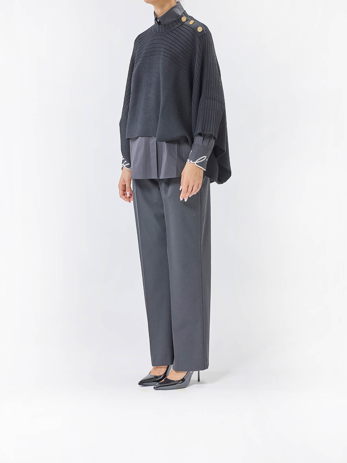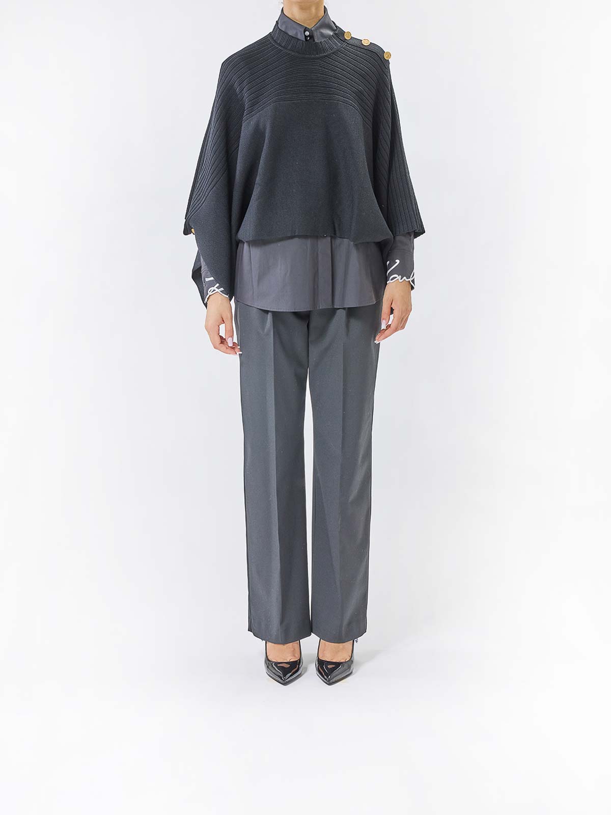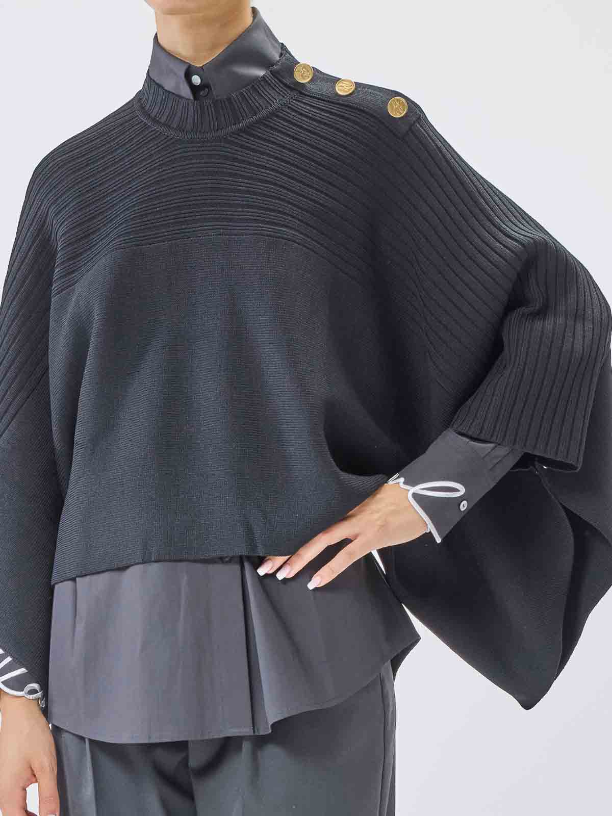 リブ編みのポンチョ。カラーはブラック。カールラガーフェルドの厚手ニットポンチョ。襟と袖はリブ編み、左肩にはカールのオートグラフボタンをあしらいました。ニットのリブ編みの襟、リブ編みの袖、袖にはスナップ、装飾用のカールオートグラフボタン。カラー:ブラック。100% コットン
