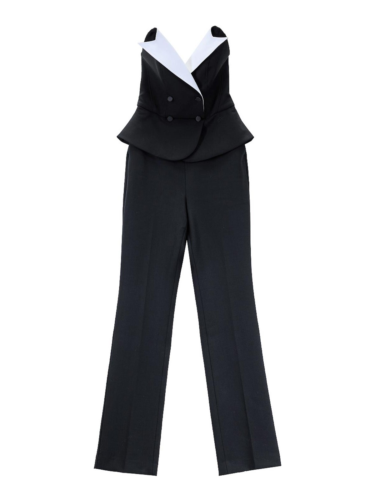 カールスタジオコントラストジャンプスーツ、ブラック/ホワイト。カールラガーフェルドのエレガントなウール混紡ジャンプスーツは、仕立てのディテールが施されたボディスと、サテンボタンとコントラストの効いた襟が付いたダブルブレストのデザインが特徴です。テーラードデザイン、ストラップレスでコントラストの効いたハーフラペル、サテンボタンをあしらったダブルブレストのボディス、テーラードパンツ、トーン・オン・トーンのカールオートグラフロゴ刺繍、ジップバッククロージャー。カラー:ブラック/ホワイト。バージンウール 95%、エラステイン 5%。フィット:スリム。よりリラックスしたフィット感をお求めの場合は、ワンサイズ大きめをご注文ください。