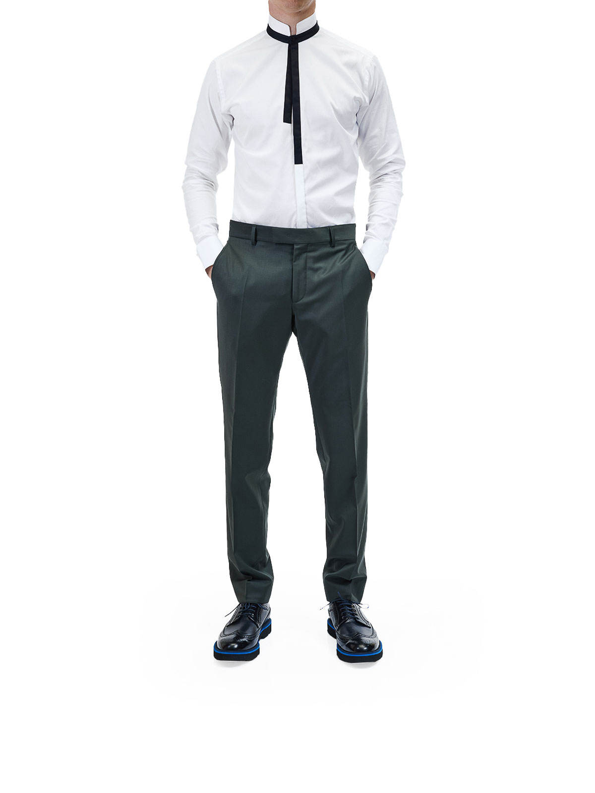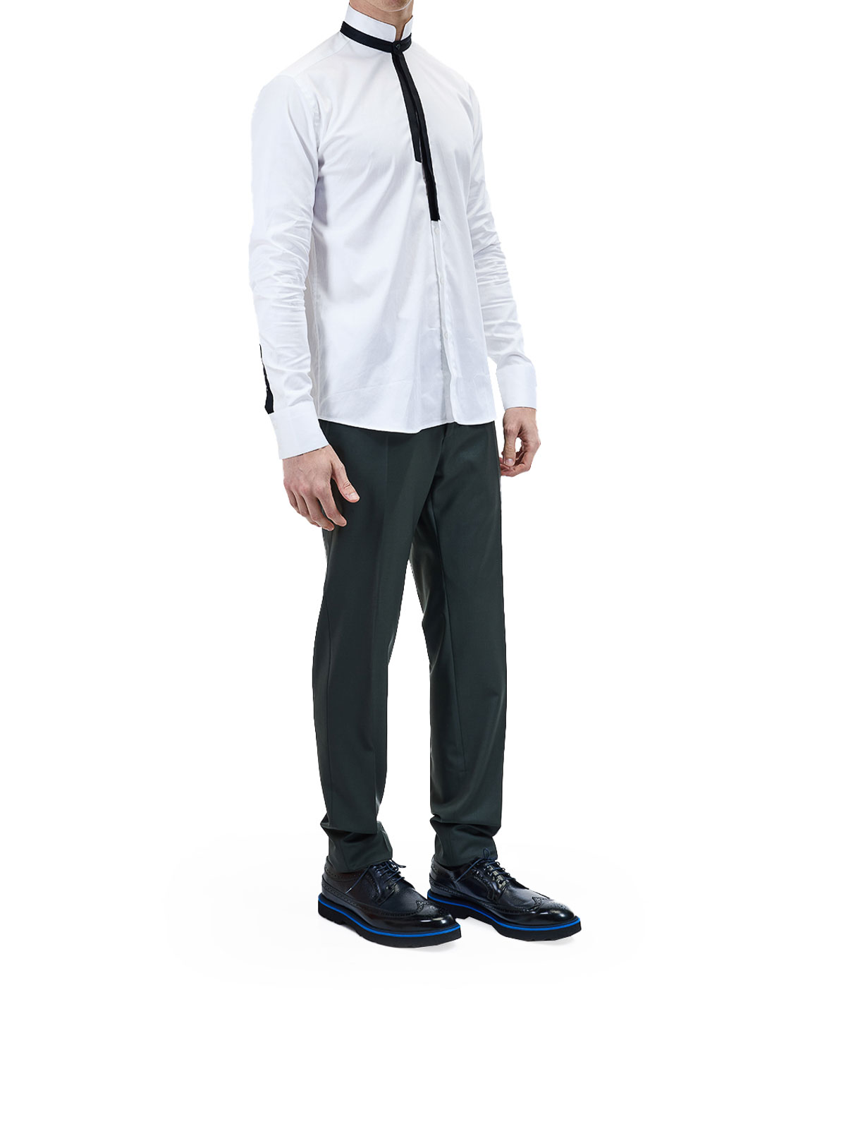 黒と白のネクタイシャツ。カールラガーフェルドシャツ。ハイカラーの形状とネクタイを思わせるコントラストの効いたトリムが特徴。ハイシェイプの襟、ネクタイをイメージしたコントラストの効いたトリム、前開きになったボタンプラケット、大げさなカフス。色:黒と白。98% コットン、2% エラスタン。