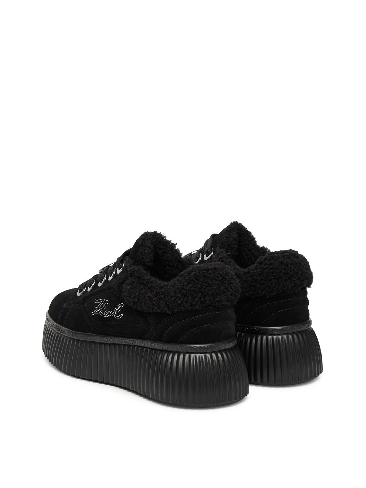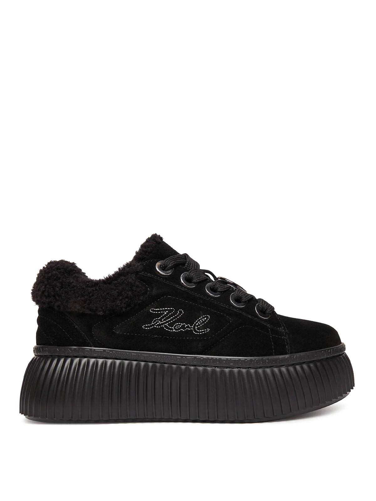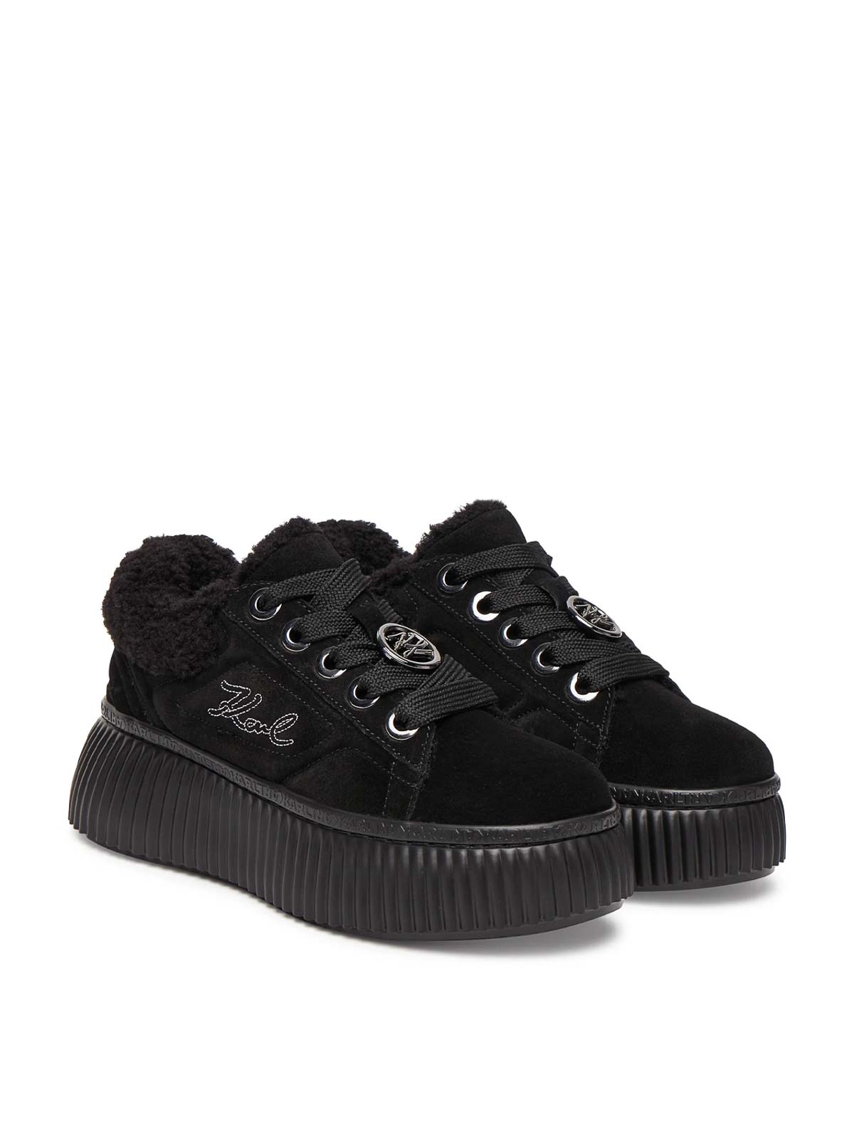 クリーパーローエンブロローレース、ブラック。カールラガーフェルドのスエードスニーカー。内側にパッドが入り、サイドにはシグネチャーの刺繍ロゴ、レースには亜鉛メッキのロゴディテールが施されています。プラットフォームソールが特徴です。パッド、レースアップ、カールロゴの刺繍、レースの亜鉛メッキディテール、プラットフォームソール。
