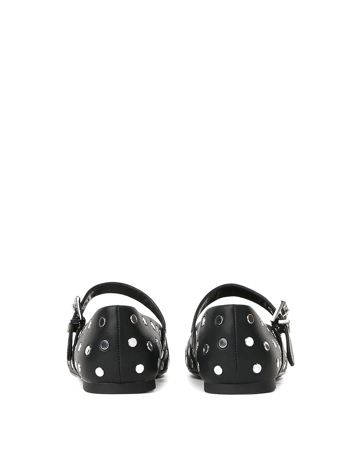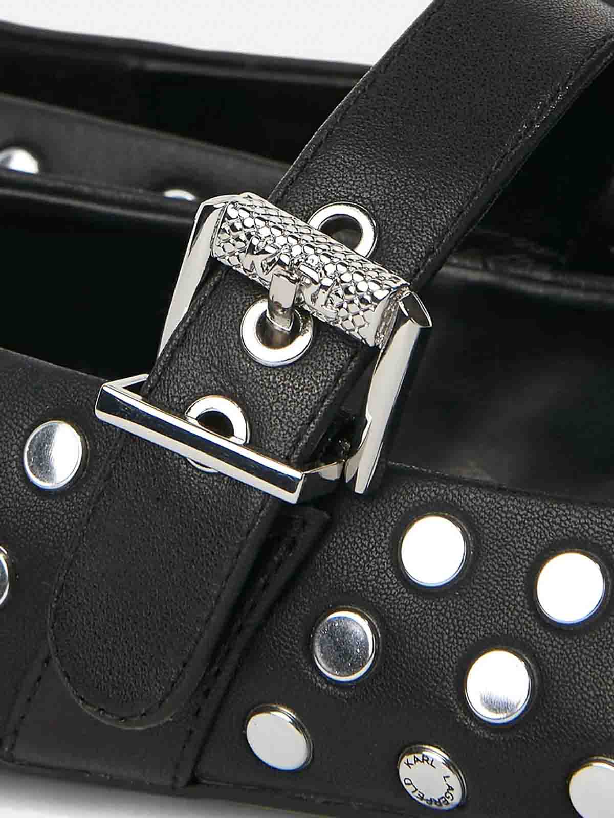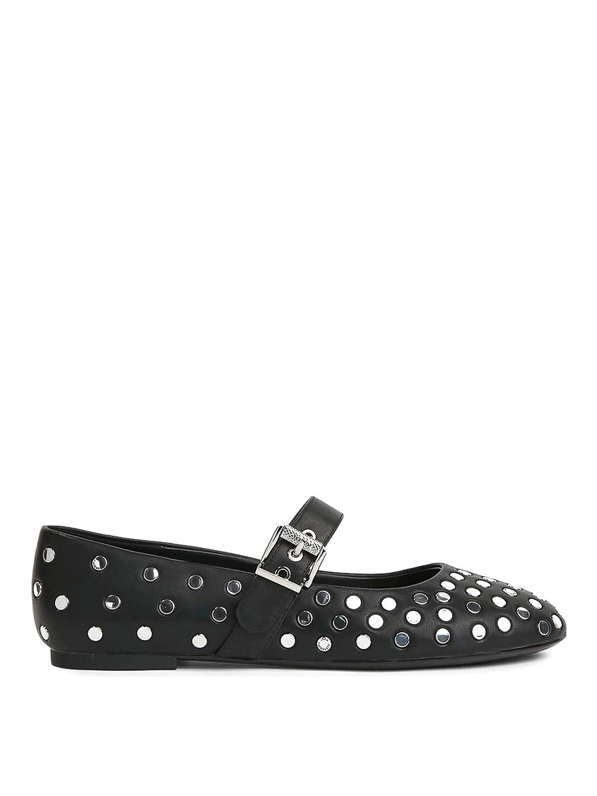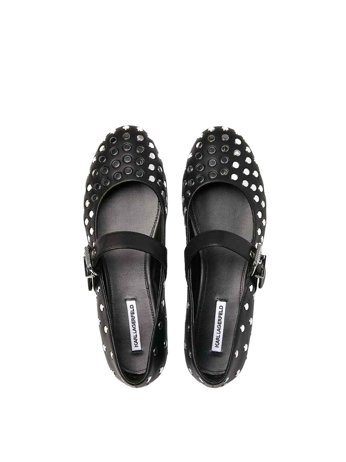 カロスタッズ付きバレリーナ。カールラガーフェルドのレザーバレリーナで、全体にスタッズが付いており、調節可能なバックル付きのストラップが付いています。スリッポン、調節可能なバックル付きストラップ、全体にスタッズ、5mmのヒール。