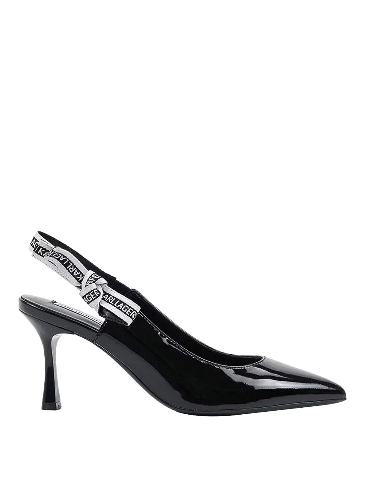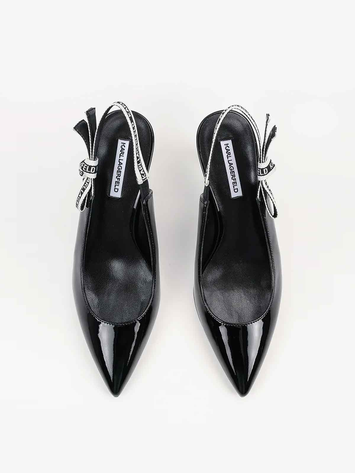 ブラックのシエナリボンスリング、光沢仕上げの天然レザーパンプス。バックストラップにはリボンとブラックのロゴプリントが施されています。