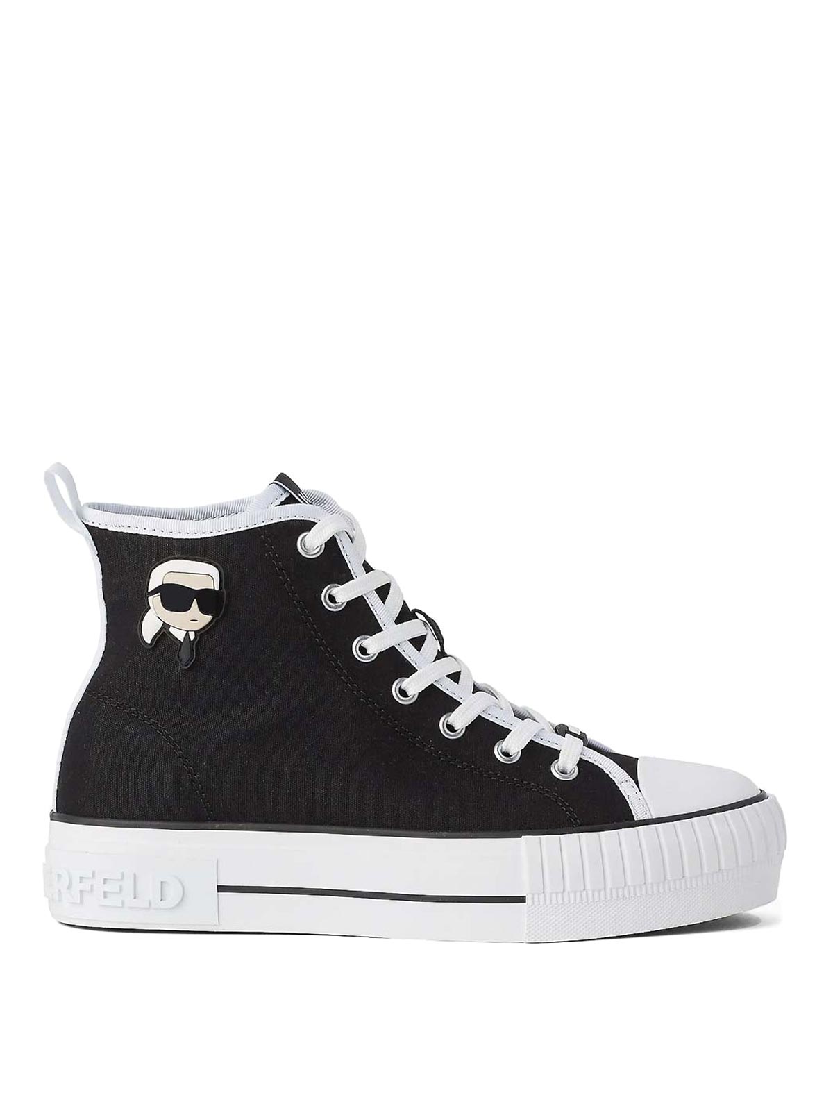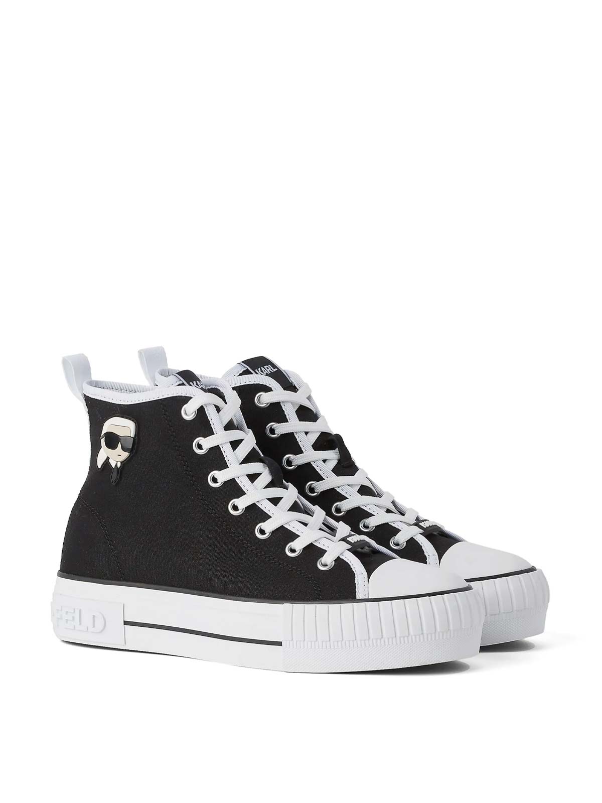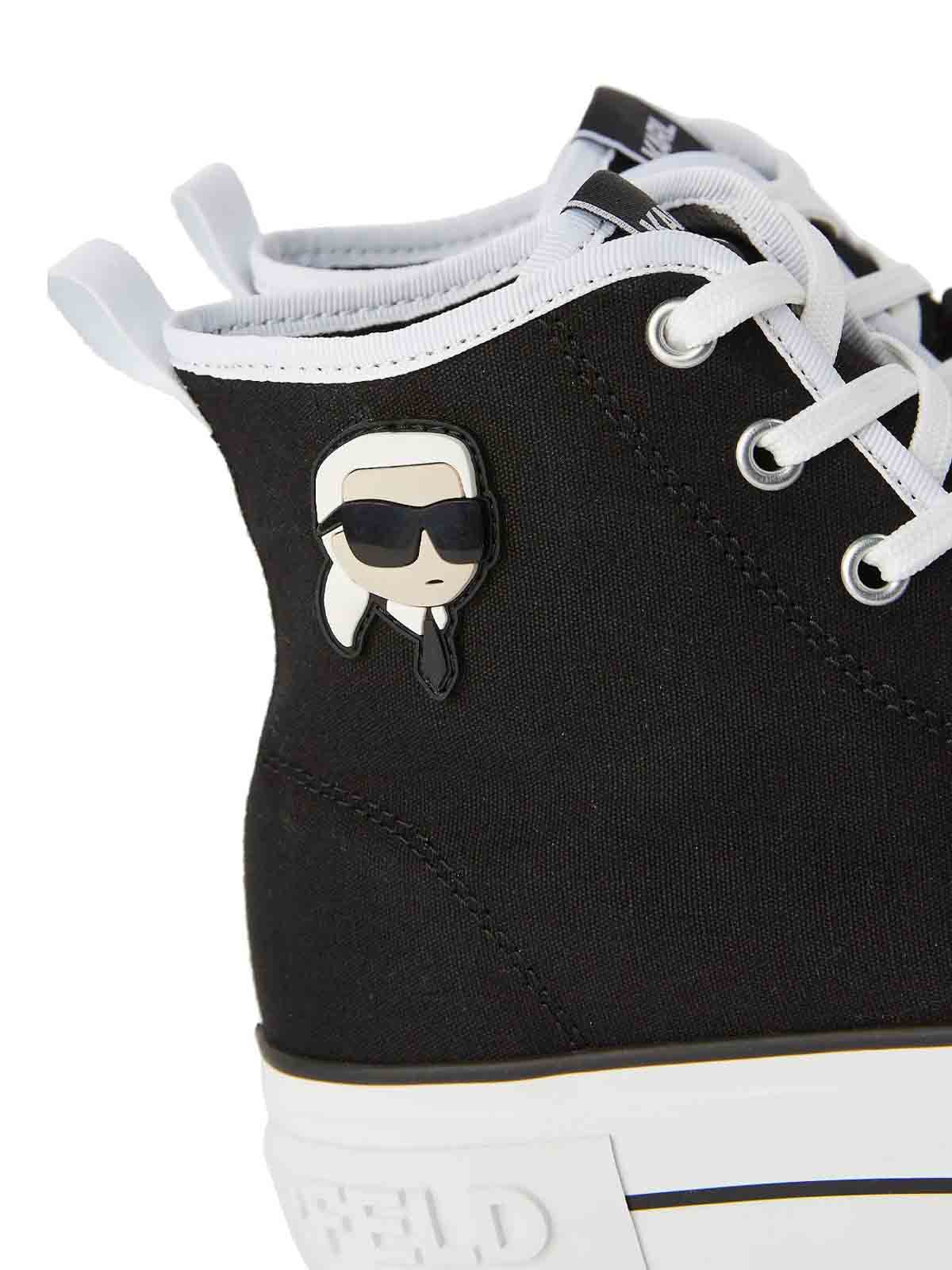 kampus max NFT パッチ hi ブラック、カールラガーフェルドコットンキャンバスのハイトップスニーカー。サイドにカールNFTパッチをあしらいました。つま先キャップにダブルテクスチャーコーティングを施したプラットフォームソールと、背面にトーン・オン・トーンのロゴがエンボス加工されています。ソールにカールラベルがエンボス加工されたトーン・オン・トーンのロゴが入ったレースアップハイカラーのカールNFTラバーパッチプラットフォームソールトングカラー:ブラック 100% コットンソール:100%ゴム、