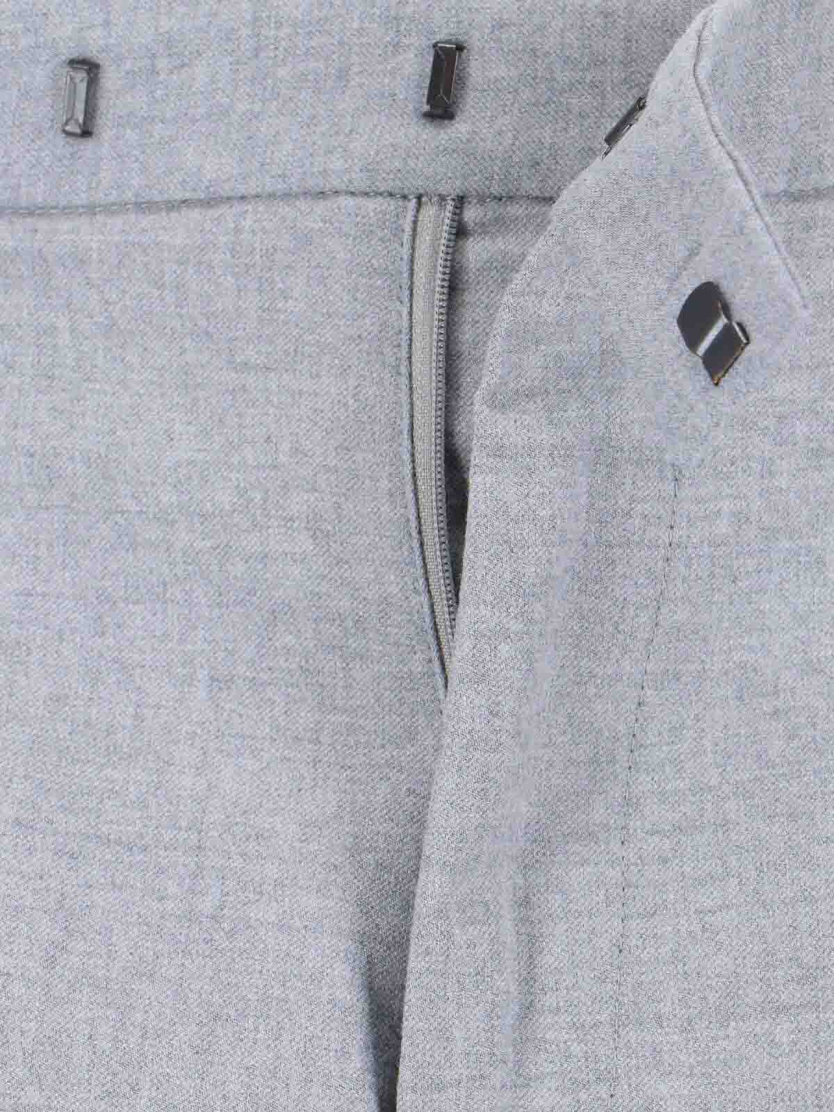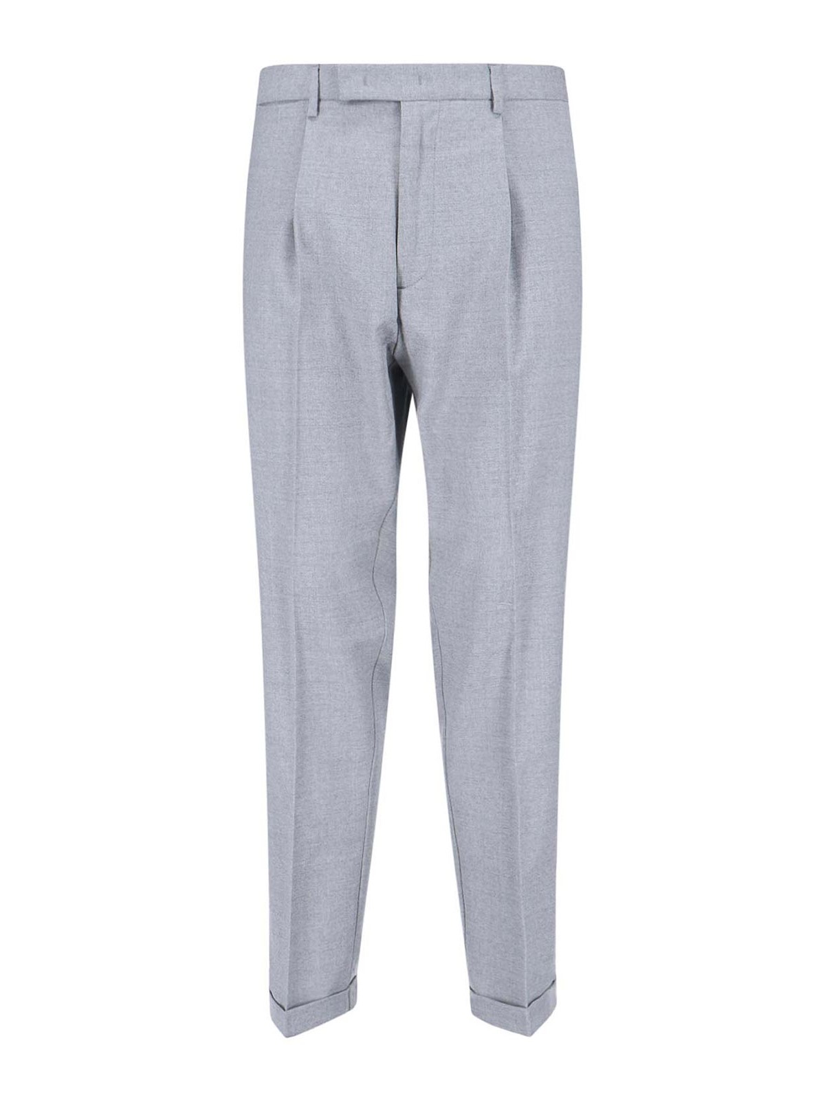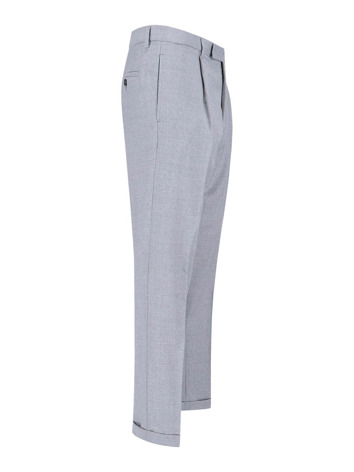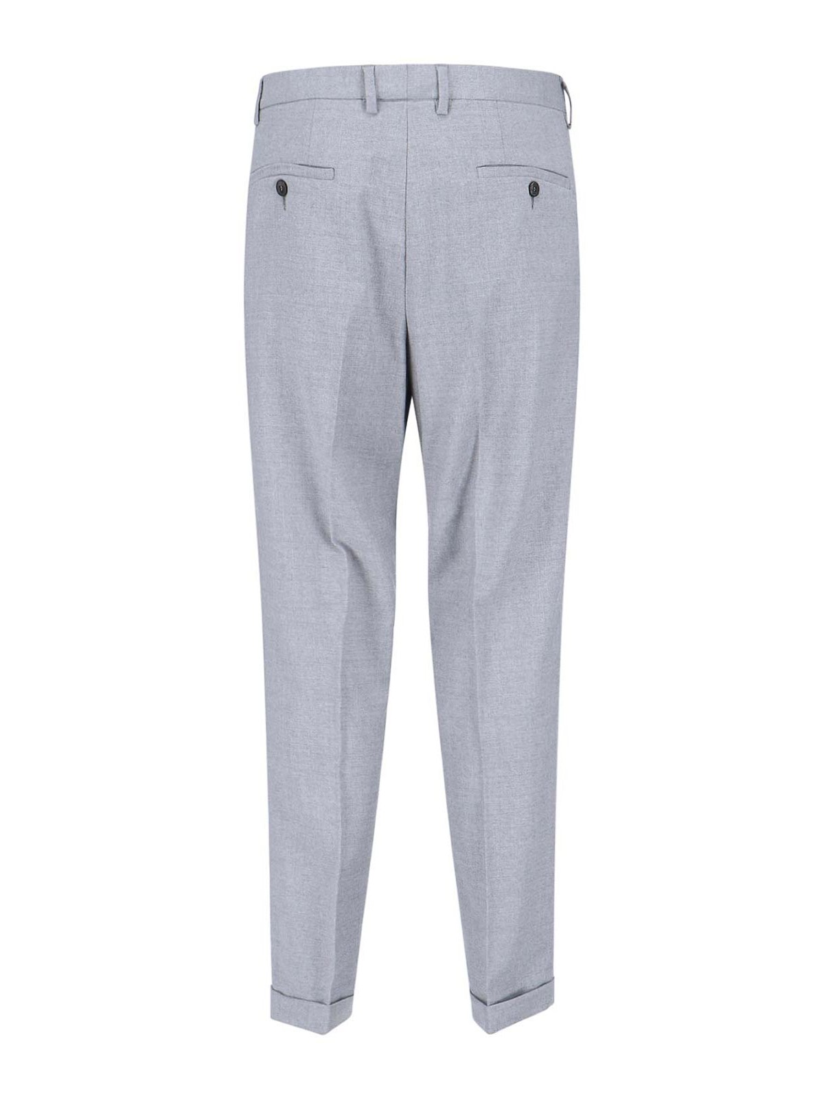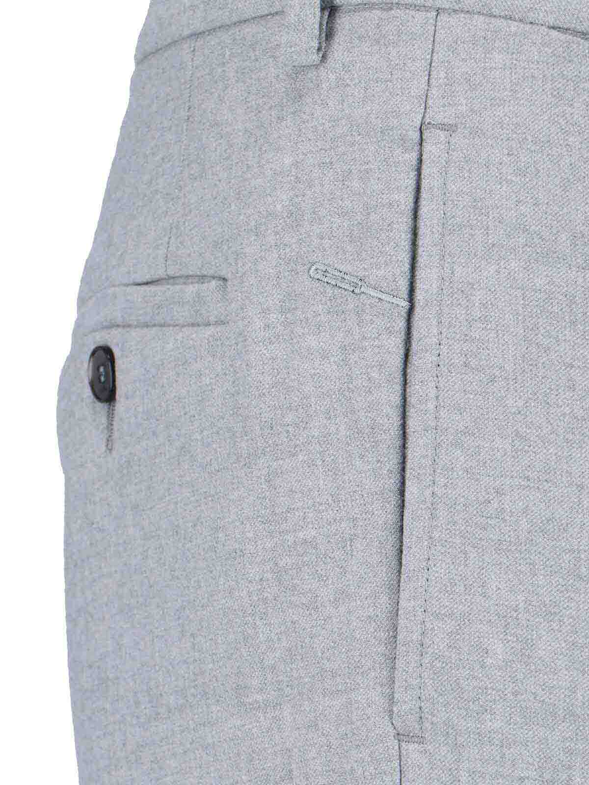 ケンジントンクルーナパンツ、グレーウール、ミディアムウエスト、ベルトループ、フックとジッパー、サイドポケット2つ、バックボタンポケット2つ、ストレートレッグ。